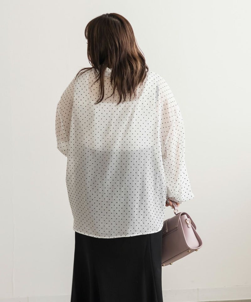 3Lを着て程よくゆとりのあるサイズ感で楽にさらっと着られました!軽やかなシアー素材で抜け感をプラスでき、程よい透け感が女性らしく羽織としてもトップスとしても着回せる万能アイテムです。ヒップにかかる丈感で安心感があり、ボトムを選ばずバランスよく着られます♪ドット柄がシンプルコーデもフェミニンに昇華してくれます! さらっと羽織るだけでトレンド感が出るのも嬉しいポイントです◎