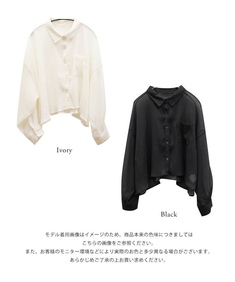 3Lサイズを着用しました。さらっとしてて軽やかな着心地です!透け感が可愛いシアー素材で、少し楊柳っぽい凹凸の生地がかわいいです◎シアーの素材が上品で、カジュアルにもきれいめにも合わせやすい万能アイテムです。短丈なので、アウトしてちょうどよくスタイルアップして見えました!オールシーズン使いまわせるシャツはバリエーション違いでもっておきたいアイテムです♪