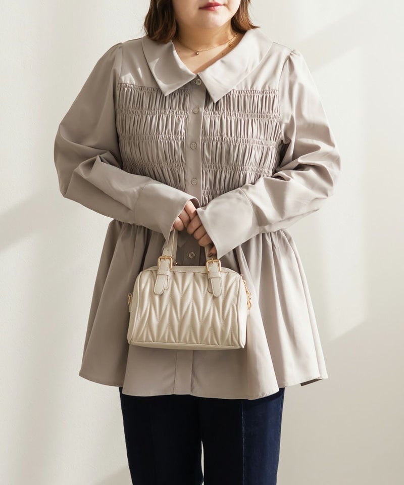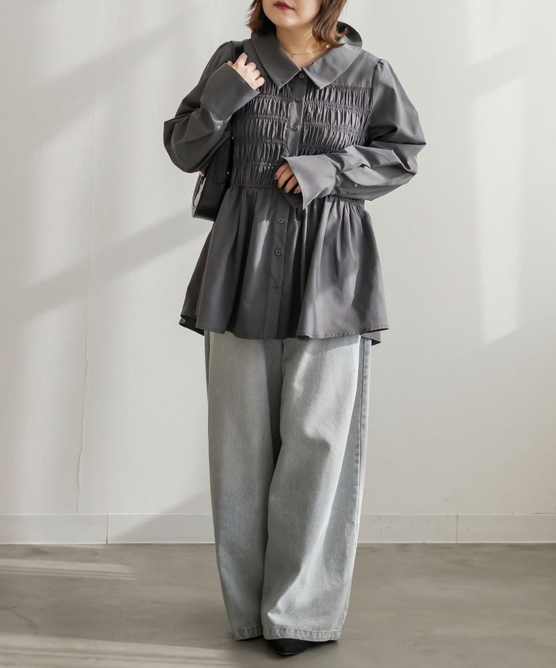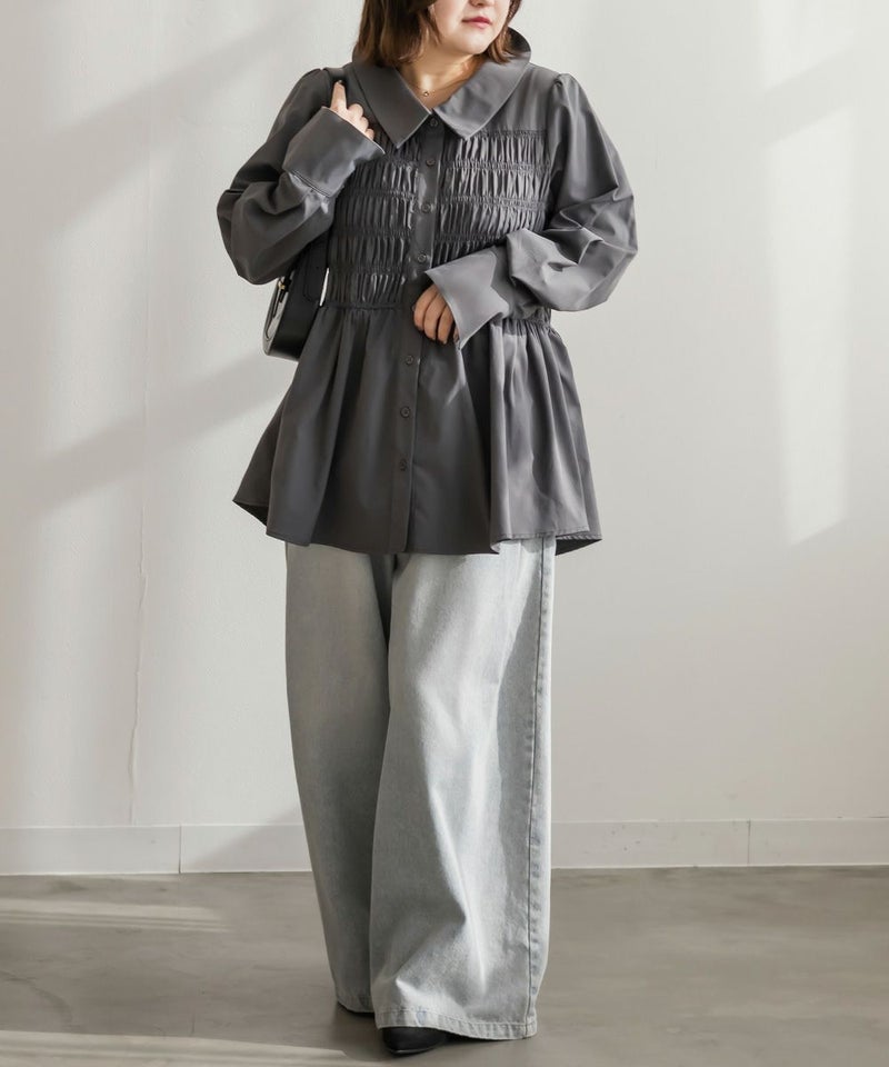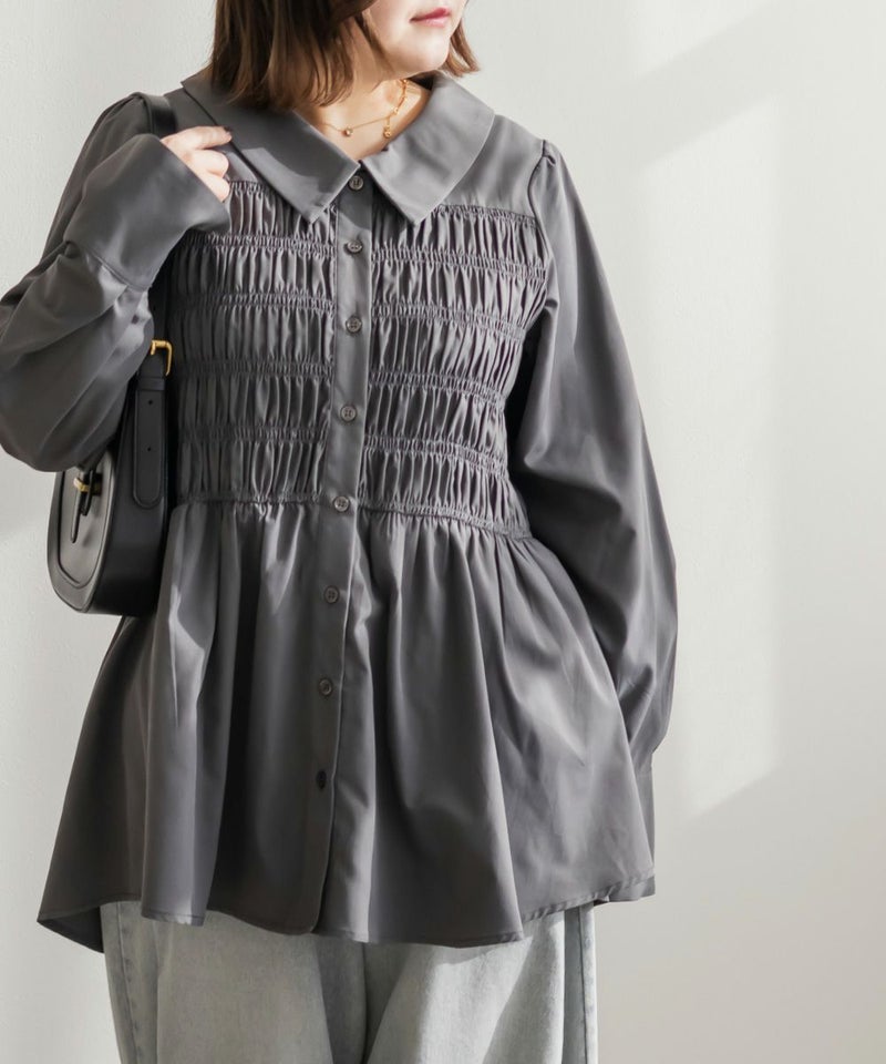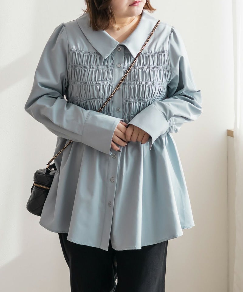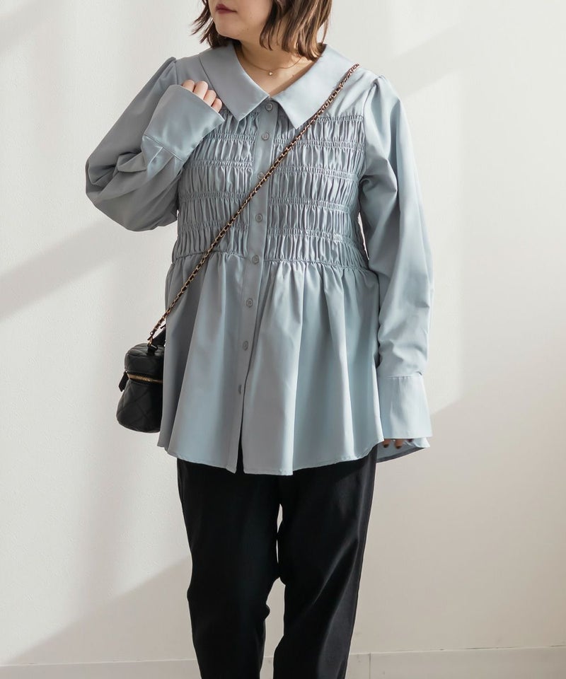 LLを着てちょうどいいサイズでした。シャツ襟がついたデザインで上品な雰囲気です◎首元は窮屈感が無くすっきり開いているのが嬉しいポイントです!ウエストから綺麗に広がるシルエットになっているからメリハリがあってすっきりとした印象になれます!胸元はシャーリング仕様のの柔らかいゴムだからストレスフリーな着心地です。お腹周りやお尻を隠せるデザインだから、着やせ効果も高いです。パンツや、ミニ丈・ナロースカートと合わせるとバランスが良いです。長いシーズン着まわせる生地感なのもお気に入りです♪