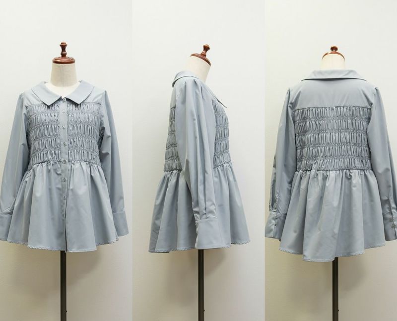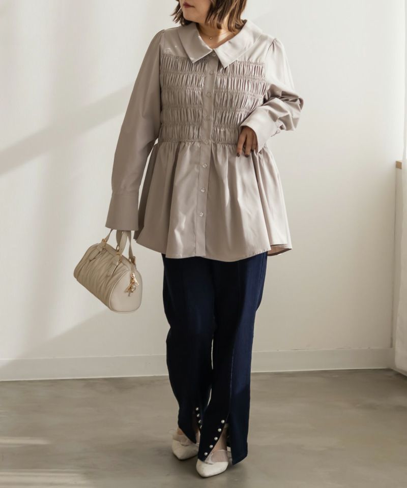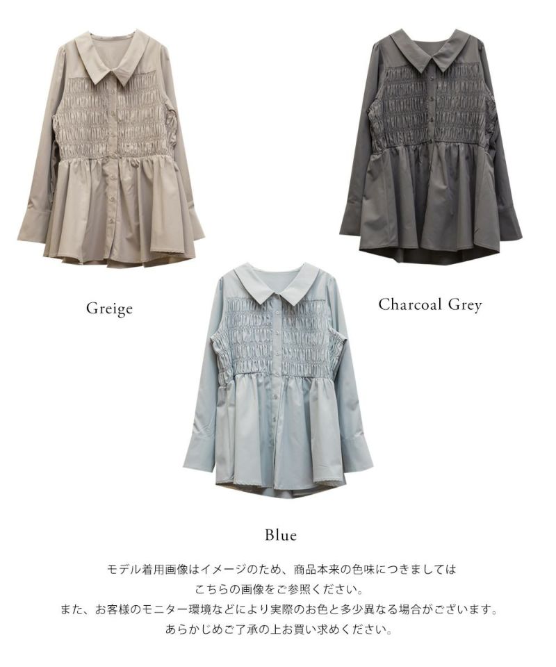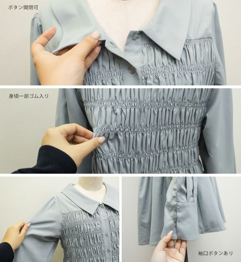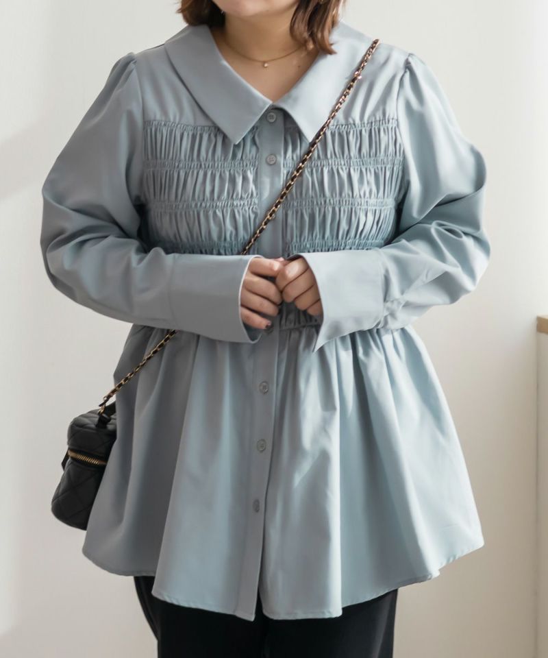 LLを着てちょうどいいサイズでした。シャツ襟がついたデザインで上品な雰囲気です◎首元は窮屈感が無くすっきり開いているのが嬉しいポイントです!ウエストから綺麗に広がるシルエットになっているからメリハリがあってすっきりとした印象になれます!胸元はシャーリング仕様のの柔らかいゴムだからストレスフリーな着心地です。お腹周りやお尻を隠せるデザインだから、着やせ効果も高いです。パンツや、ミニ丈・ナロースカートと合わせるとバランスが良いです。長いシーズン着まわせる生地感なのもお気に入りです♪