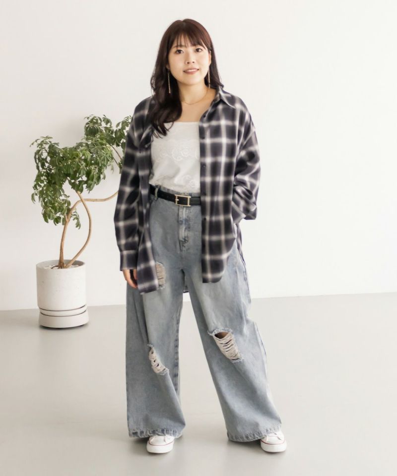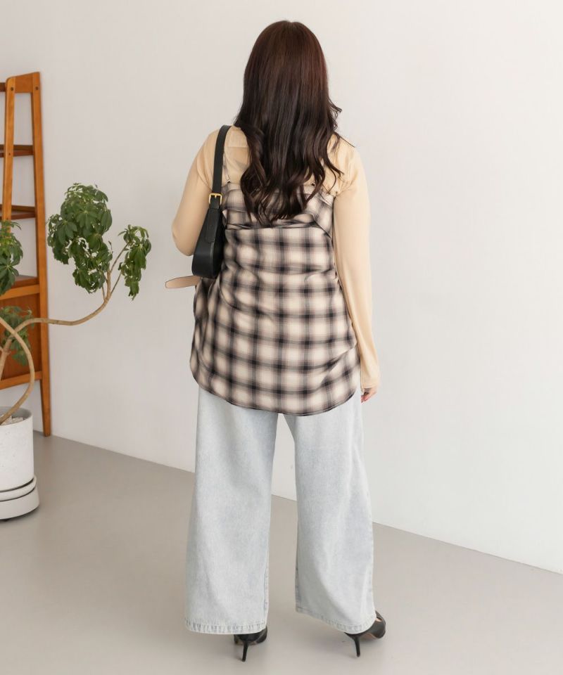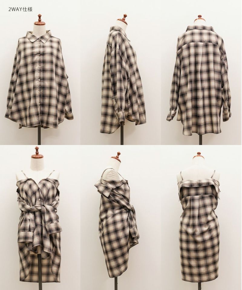 3Lサイズを着用してゆるっと着られるサイズ感でした!すこしとろみのあるさらっとした生地感で肌当たりも良く軽い着心地です◎ヒップが隠れる少し長めの丈感で、体型カバーもしてくれます!1枚でさらっと羽織っても、アレンジしてビスチェ風にも楽しめる2wayデザインで、気分に合わせてスタイリング可能です♪中に肩紐がついていて、オフショルにしても着られます!ほかにも前開きにしたり、ウエストを結んで女性らしく着崩したりとシーンに合わせて色々な着回しができました。季節の変わり目にも軽い羽織りとしても活躍して、秋らしいチェック柄がいまっぽい1枚です!