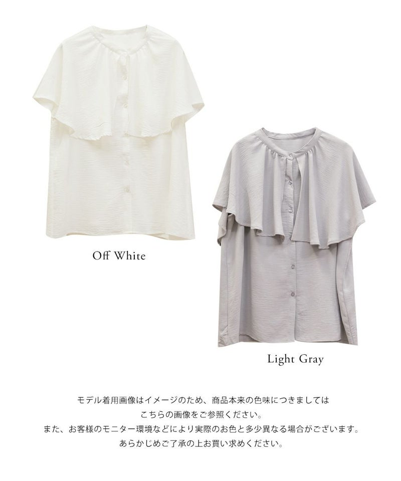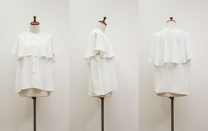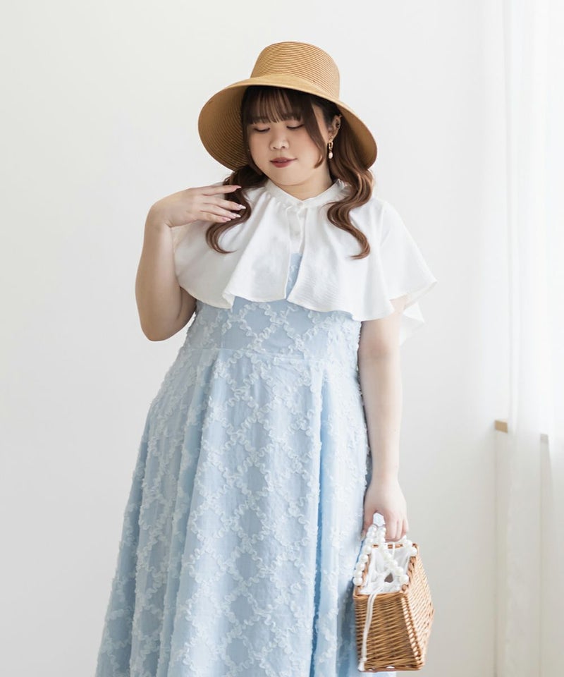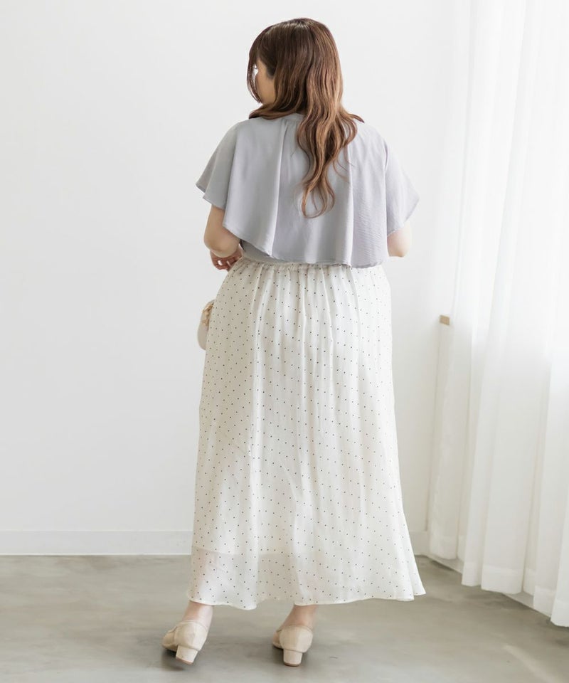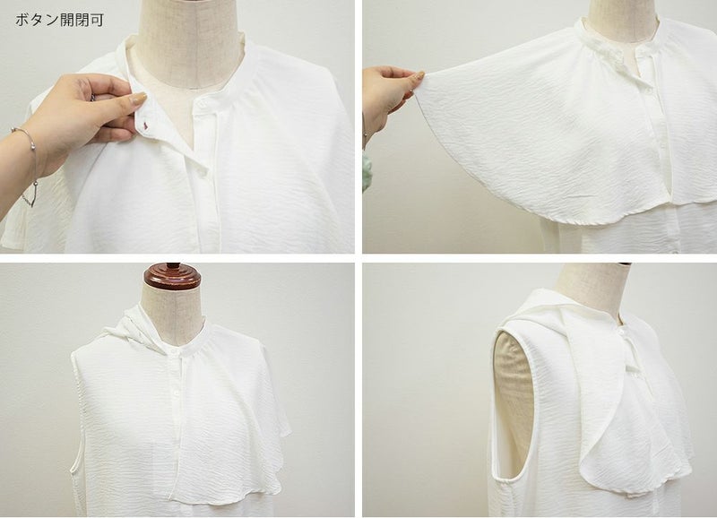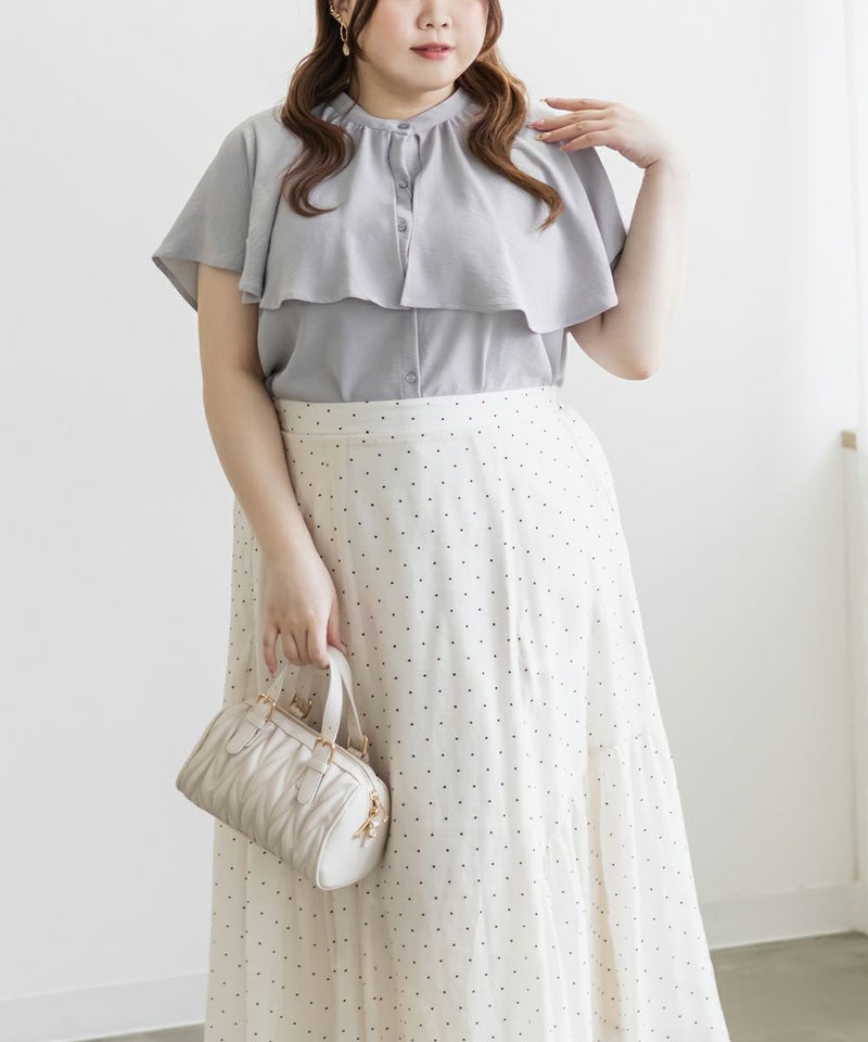 3Lサイズを着用してぴったりのサイズ感でした。大きなケープカラーが顔回りを小さくみせてすっきりとした印象に着やせできます◎さらりとした肌ざわりなので着心地も良かったです!フリルのようなケープデザインが上品なブラウスなのでパンツにもスカートにも合わせやすく色々な雰囲気のコーデで着回しできそうです。内側はノースリーブのケープデザインなので、気になる肩周りをカバーして涼しく着用いただけます。ちょうどいい丈感でスタイリングの幅も広がります◎