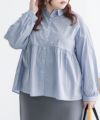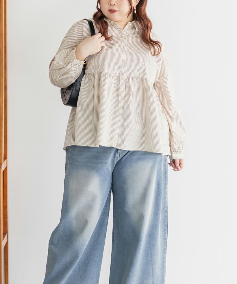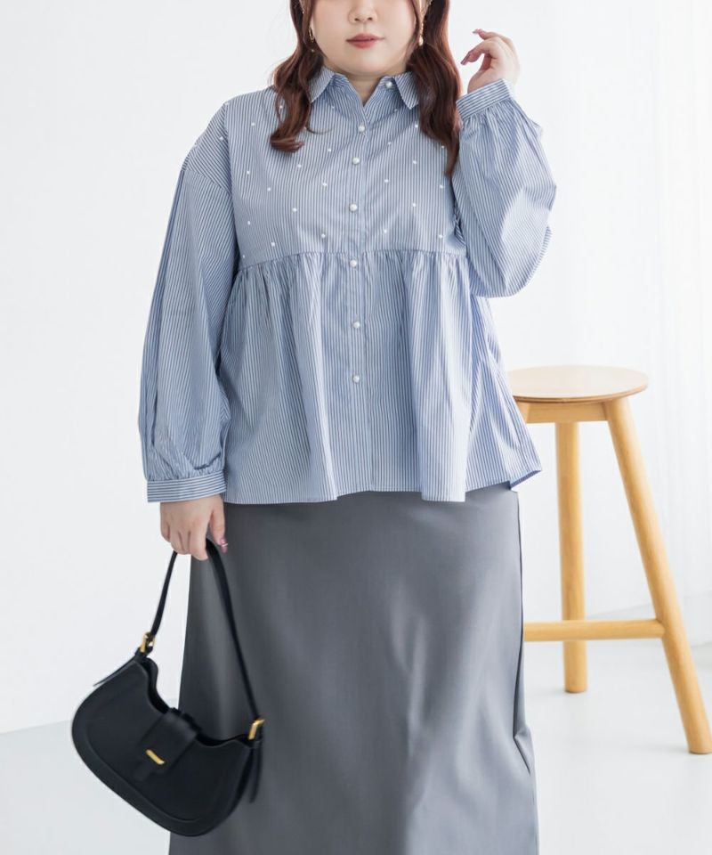 3Lサイズを着用しました。着用感はちょうどいいです。ウエスト切替のペプラムデザインが自然にくびれを作り、女性らしいシルエットを演出してくれます。ストライプ柄が縦のラインを強調してくれるので、すっきり見え効果も◎ フロントのパールボタンが上品さをプラスし、オフィスからお出かけまで幅広く使える1枚です。スカート合わせでフェミニンに、パンツ合わせで大人カジュアルにも着回せます。