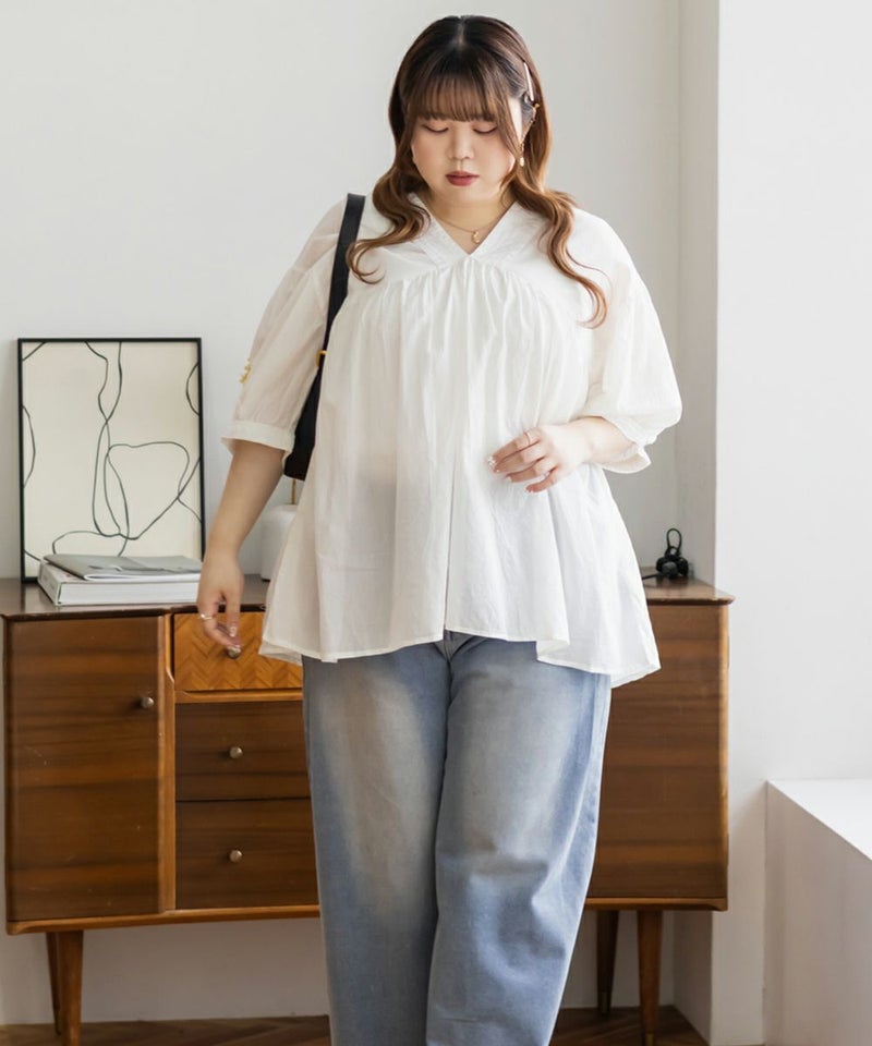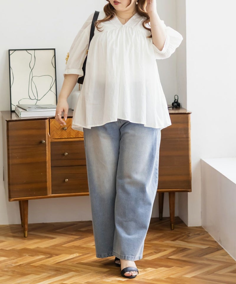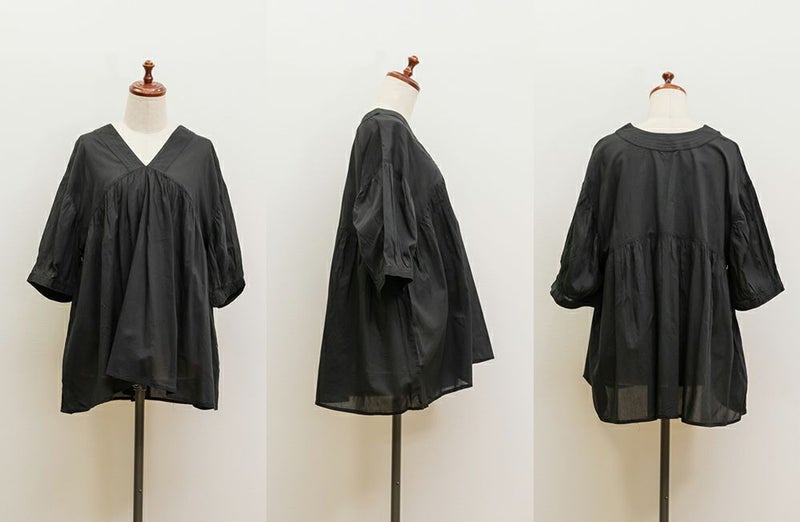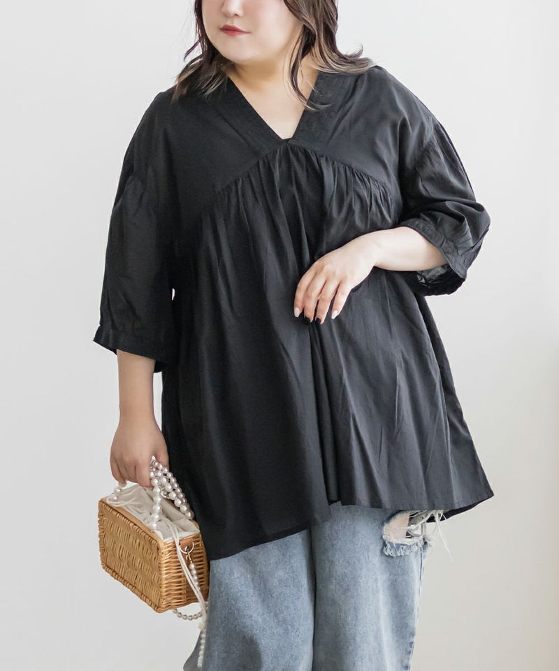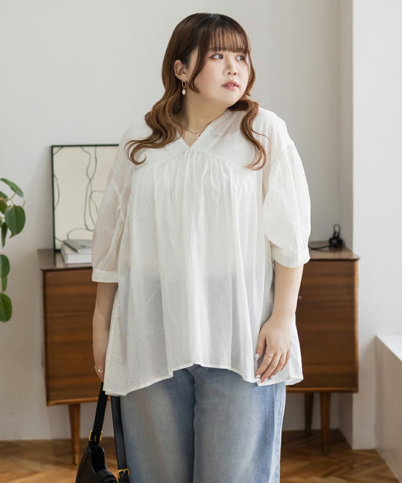 3Lサイズを着て、ちょうどいい着心地でした。とっても軽いコットン生地で、楽ちんだし涼しくて夏らしいブラウスです!華やかギャザーが印象的で、Vネックが顔回りをすっきりと見せてくれます◎夏らしい透け感×ふんわりとしたボリューム感で女性らしさグッと引き立つてて、大人に着こなせるのもポイントです!フェミニンで優しい印象だけど甘くなりすぎないのも魅力です♪ワイドパンツや、ナロースカート、スキニーパンツなどすっきりしたボトム合わせがお勧め!胸元に華奢なネックレスをプラスするとより女性らしさを引き出してくれて可愛いです!