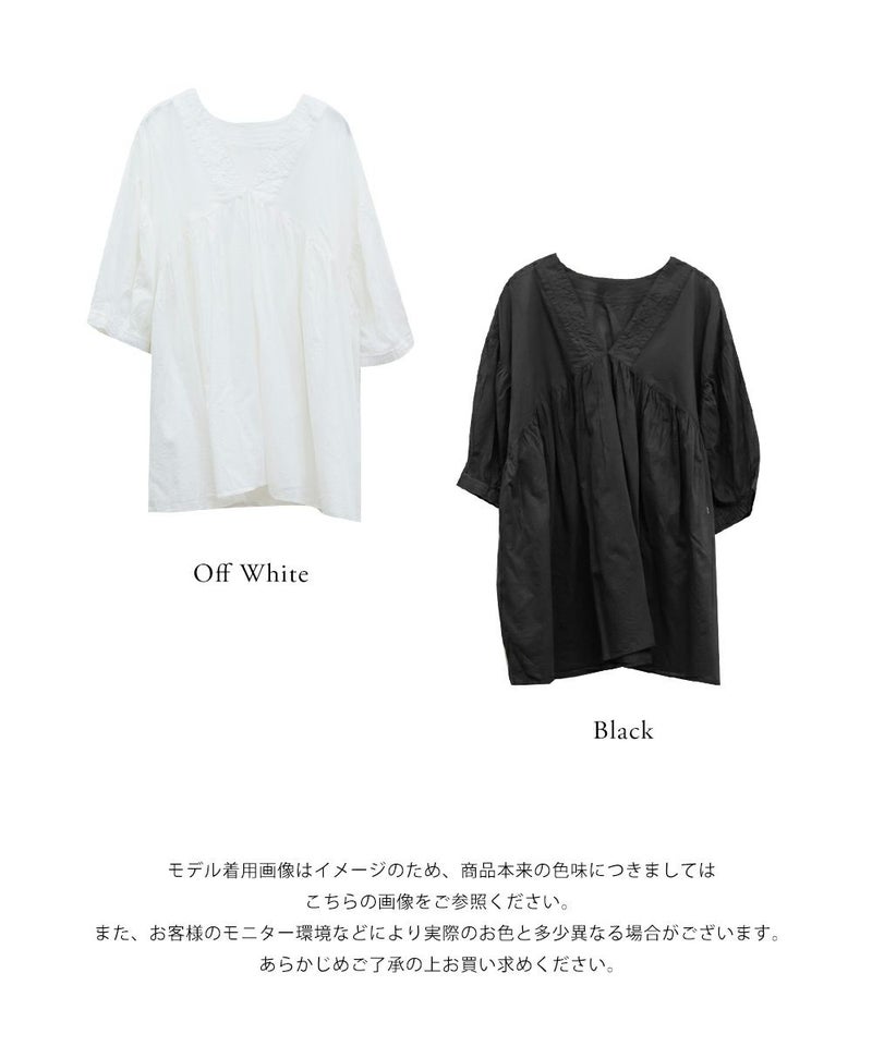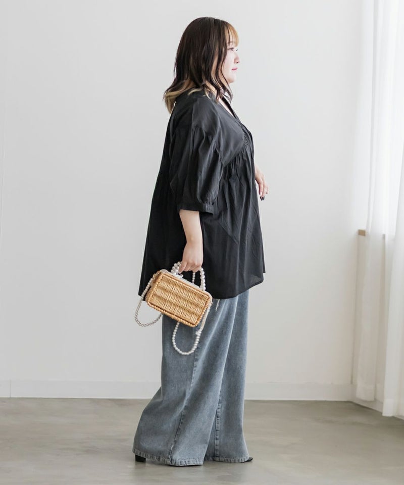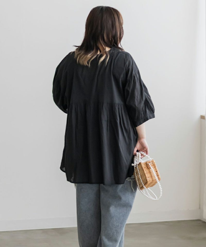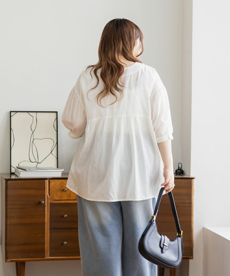 3Lサイズを着て、ちょうどいい着心地でした。とっても軽いコットン生地で、楽ちんだし涼しくて夏らしいブラウスです!華やかギャザーが印象的で、Vネックが顔回りをすっきりと見せてくれます◎夏らしい透け感×ふんわりとしたボリューム感で女性らしさグッと引き立つてて、大人に着こなせるのもポイントです!フェミニンで優しい印象だけど甘くなりすぎないのも魅力です♪ワイドパンツや、ナロースカート、スキニーパンツなどすっきりしたボトム合わせがお勧め!胸元に華奢なネックレスをプラスするとより女性らしさを引き出してくれて可愛いです!