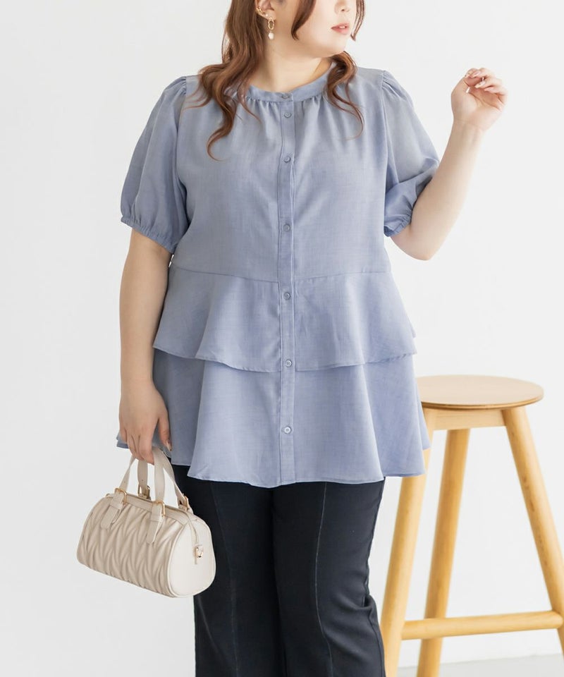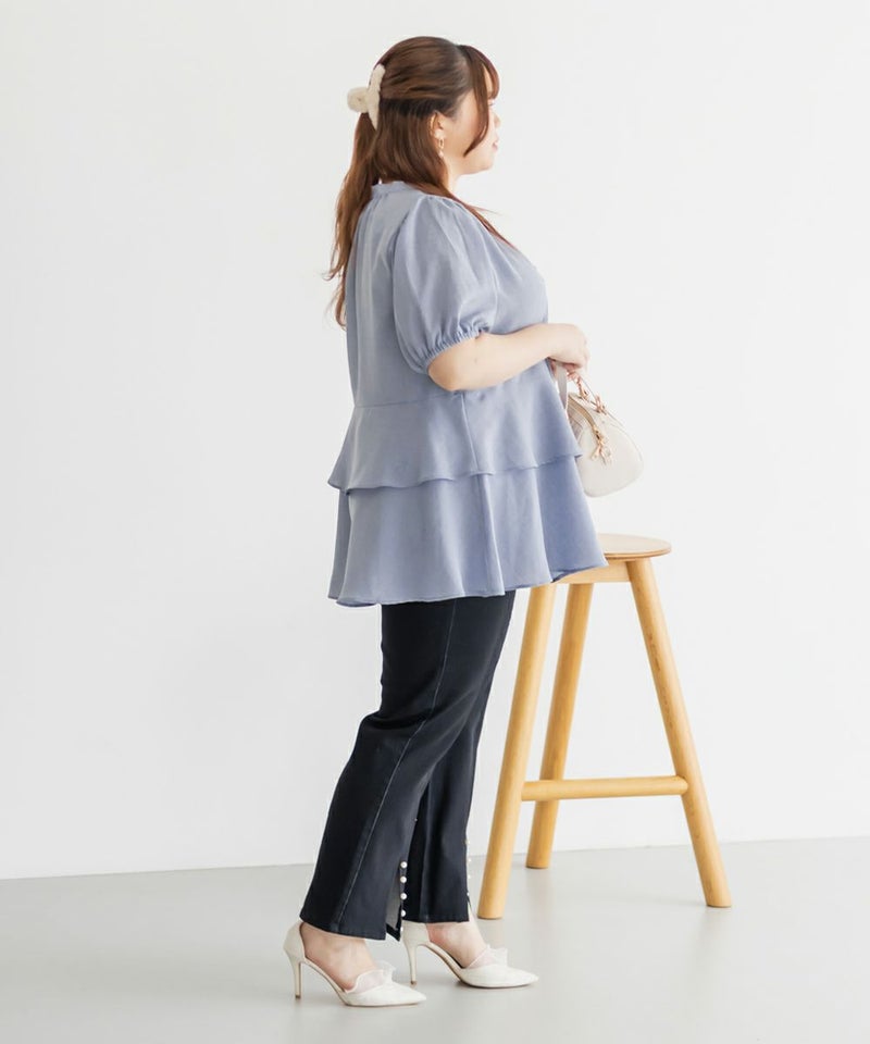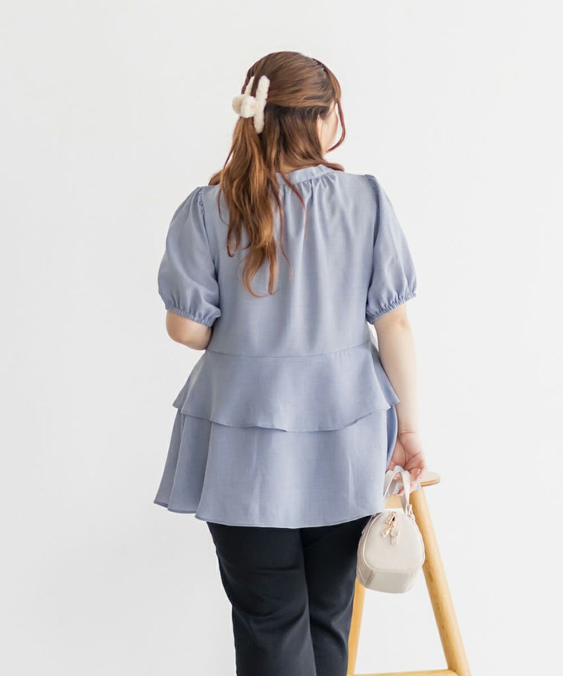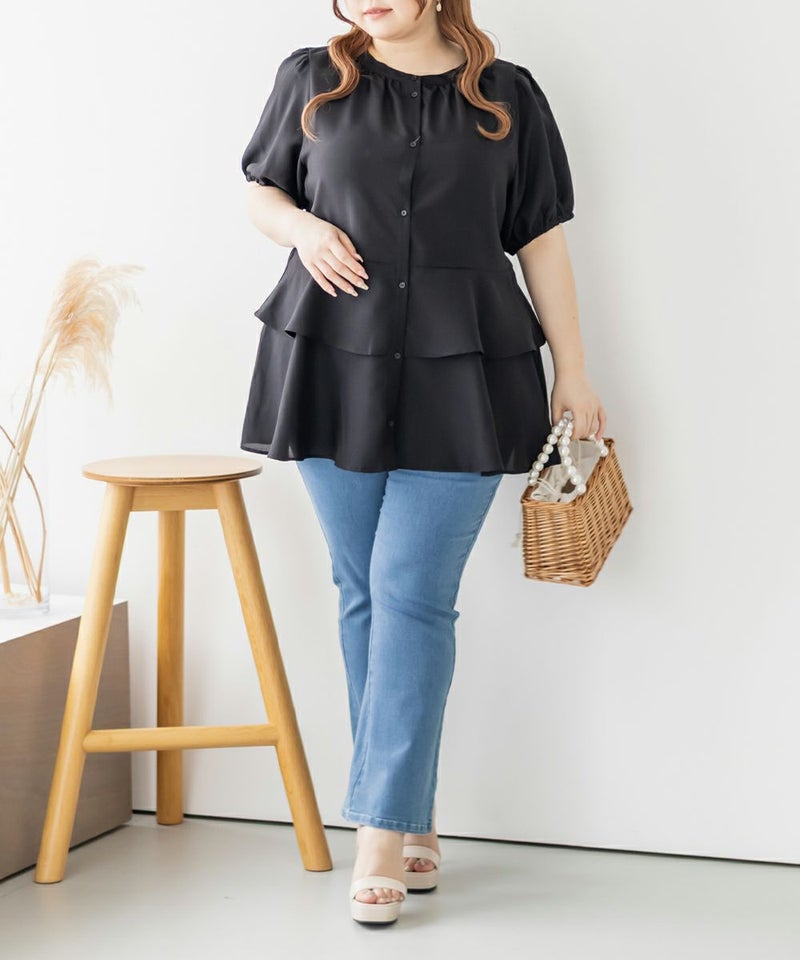 3Lを着てちょうどいい着心地でした。特に窮屈に感じるところはなかったです。ウエスト切替からふんわり広がるティアードシルエットが華やかで、気になるお腹まわりも自然にカバー♪ウエストがキュッとくびれて見えるデザインで、自然とスタイルアップして見えます!お尻まで隠してくれる着丈なのでバランスよく着られます◎袖のボリューム感も可愛くて、1枚で存在感のあるスタイリングが完成!さらっとした素材感で着心地も軽く、シーズンを通して大活躍してくれそうです。