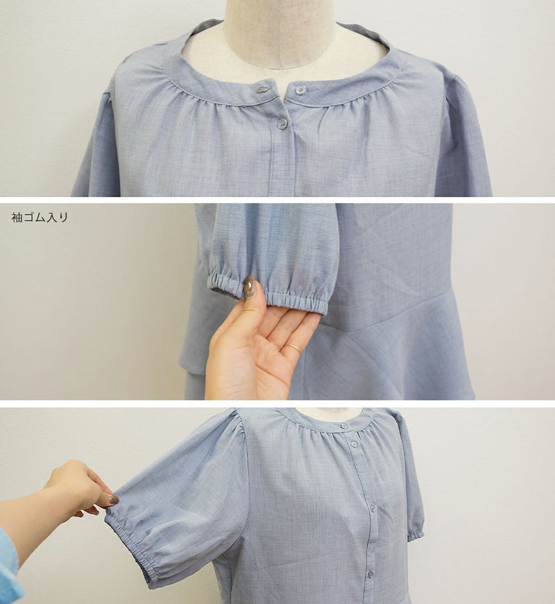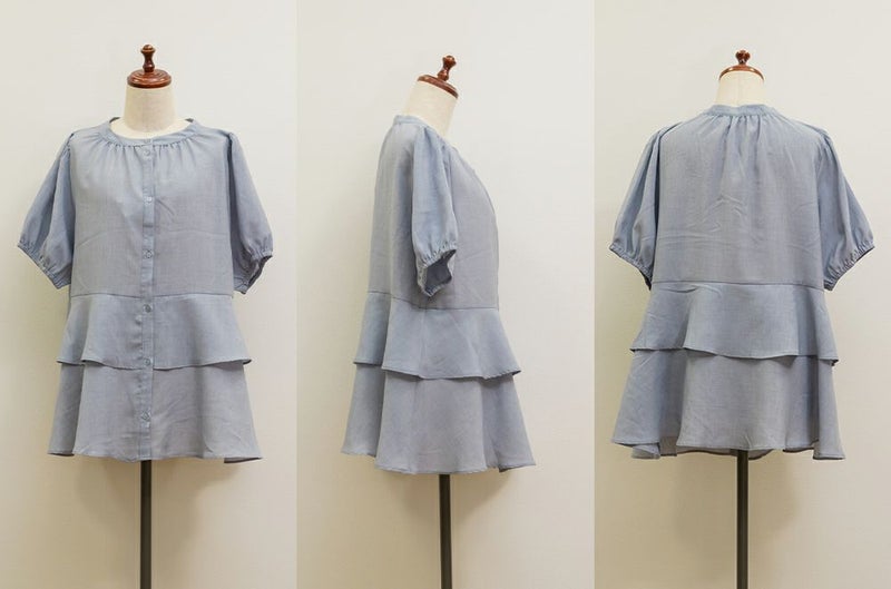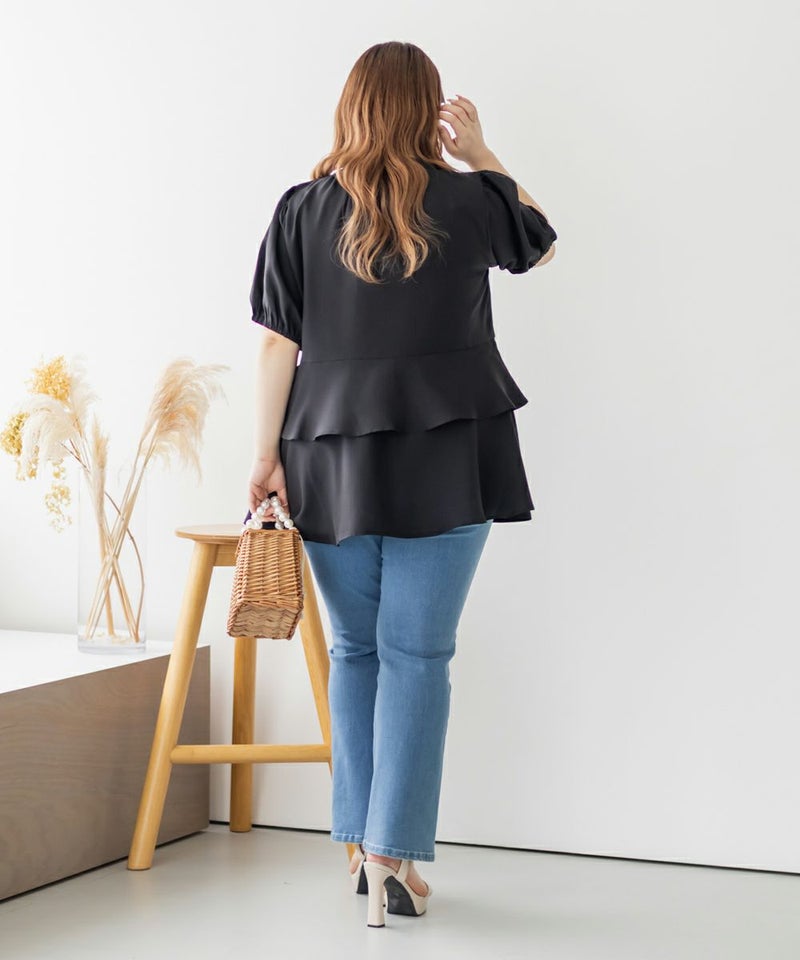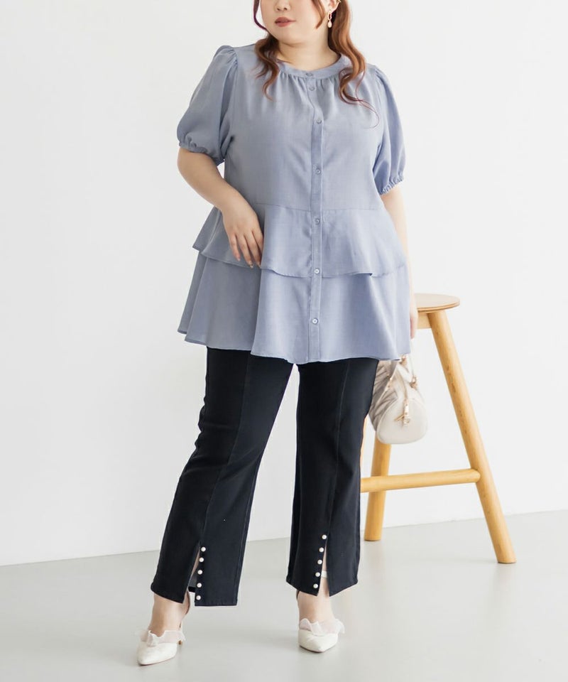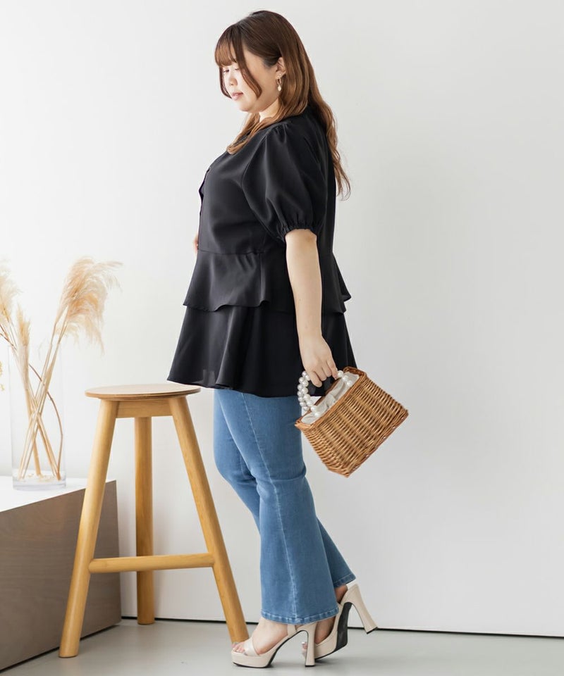 3Lを着てちょうどいい着心地でした。特に窮屈に感じるところはなかったです。ウエスト切替からふんわり広がるティアードシルエットが華やかで、気になるお腹まわりも自然にカバー♪ウエストがキュッとくびれて見えるデザインで、自然とスタイルアップして見えます!お尻まで隠してくれる着丈なのでバランスよく着られます◎袖のボリューム感も可愛くて、1枚で存在感のあるスタイリングが完成!さらっとした素材感で着心地も軽く、シーズンを通して大活躍してくれそうです。