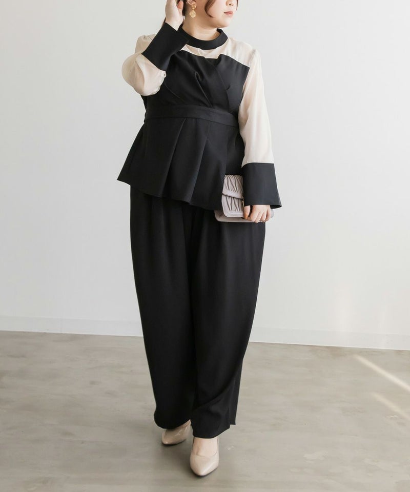 3Lサイズを着用してちょうどいいサイズ感でした。いつも通りのサイズ選びで問題なさそうです。首回りも詰まりすぎていないので、着心地も問題なかったです!ウエストにはリボンがついていて後ろ姿も可愛いです◎上品で洗練された印象のブラウスで、普段使いはもちろん、特別なシーンにもおすすめです。パンツとセットで着用して、オケージョンシーンにも◎