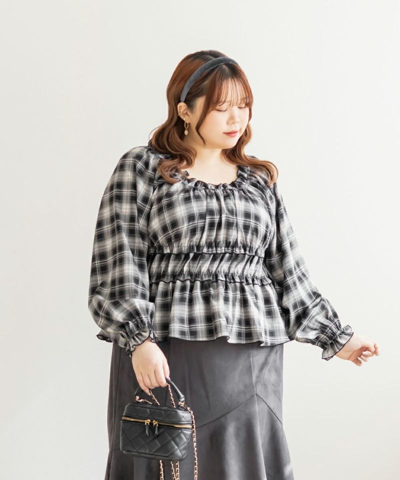 3Lサイズを着用しました。着用感はちょうどいいです◎ オフショル・オンショル2WAYで着られるデザインなので、気分やコーデに合わせて印象を変えられます。 チェック柄とフリルの組み合わせが程よく甘く、大人フェミニンな雰囲気に。 さらりと軽い素材で、ロングシーズン着回しできて、今っぽいチェック柄がトレンド感たっぷり◎ペプラムに広がったブラウスで、おなか周りをカバーしてバランスよく着こなせる万能ブラウスです♪