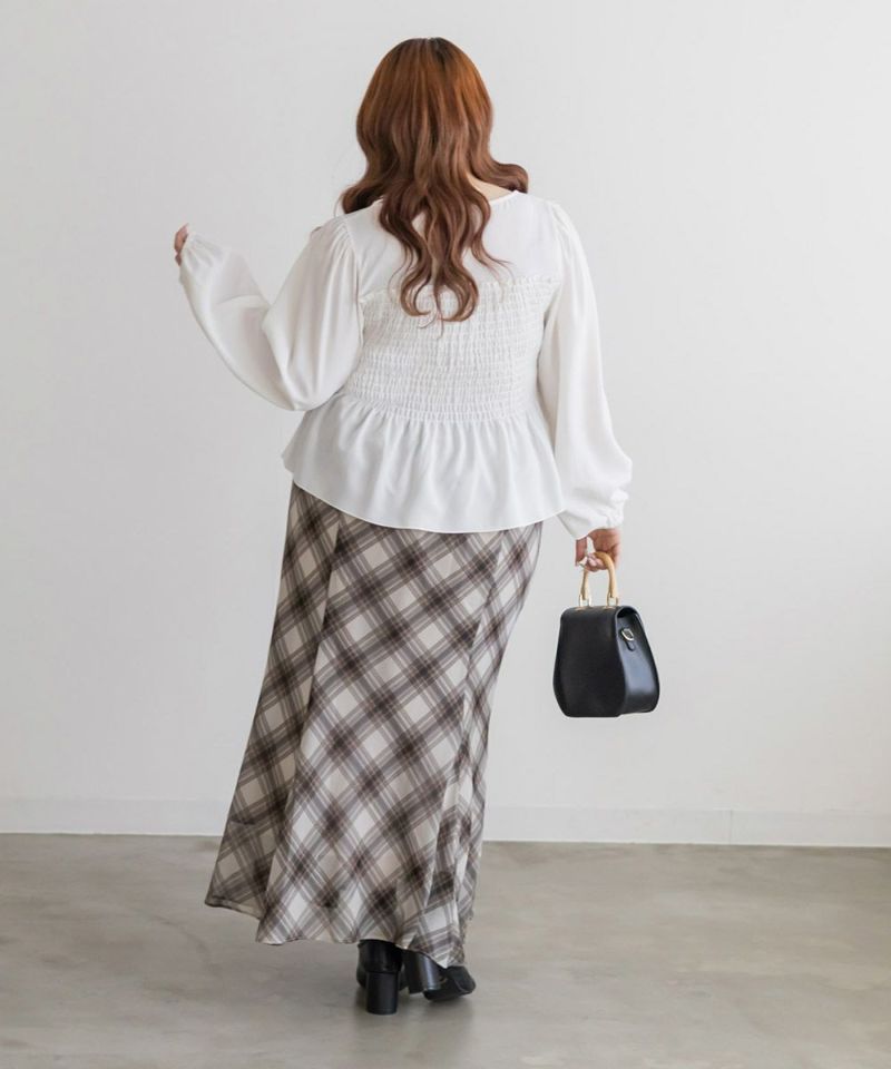 3Lを着て着用感はちょうどよく、シャーリング部分も締め付け感なく楽に着られました。バストまわりからウエストにかけてほどよくフィットしてくれるので、自然にメリハリが出て着やせして見えるのが嬉しいポイントです。