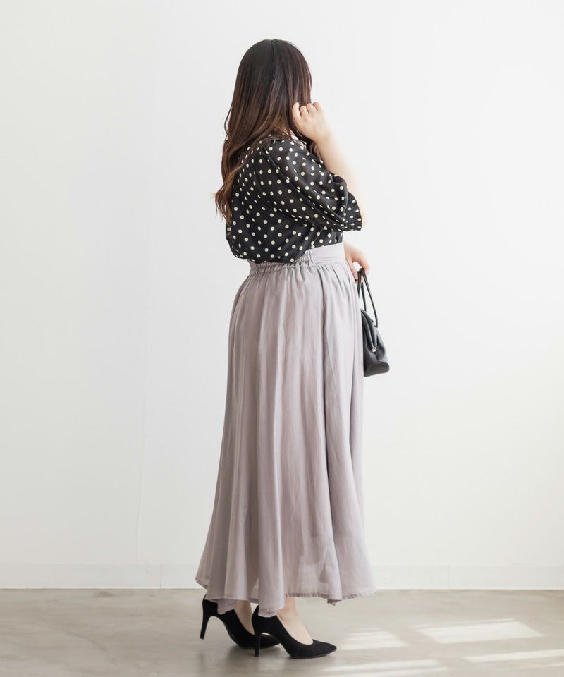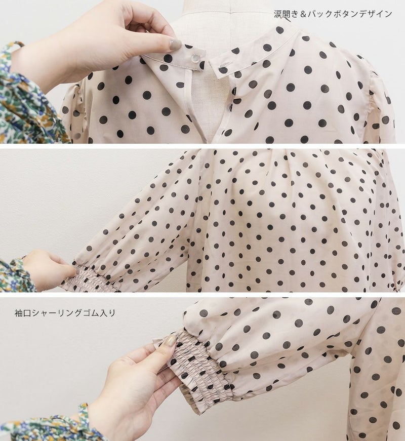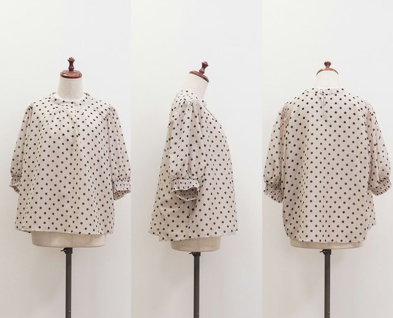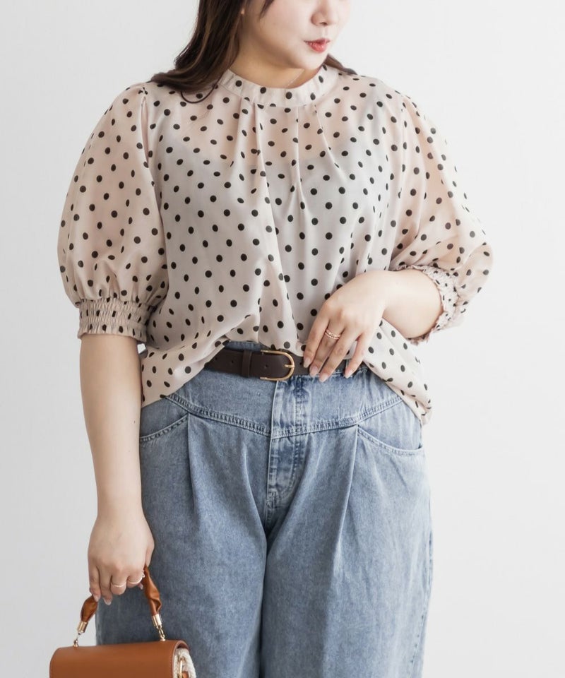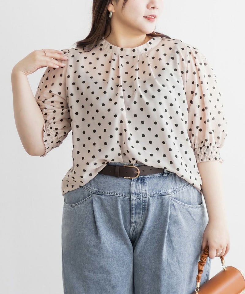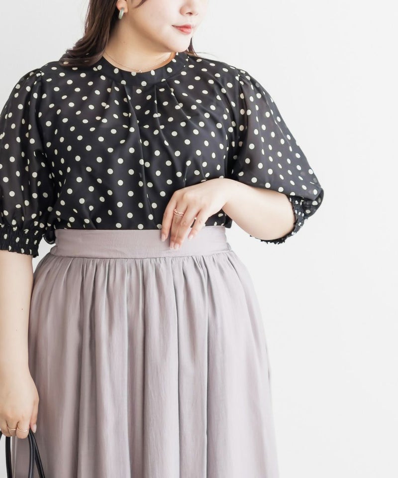 3Lサイズを着用して、ぴったりのサイズ感でした。窮屈感は特に感じなかったのでいつも通りのサイズ選びで問題なさそうです!袖口はシャーリングになっているのと、気になる二の腕はすっぽり覆ってくれるのが嬉しい◎プチハイのネックラインとドットと合わさってよりガーリーフェミニンな印象になります◎少し透け感のある生地でなのが春夏らしくて涼しく着用出来ます!ワンピースやスカートと相性抜群で、お出かけやデートにおすすめです!デニムとドットの相性も良く、カジュアル派さんにもおすすめの1枚です♪