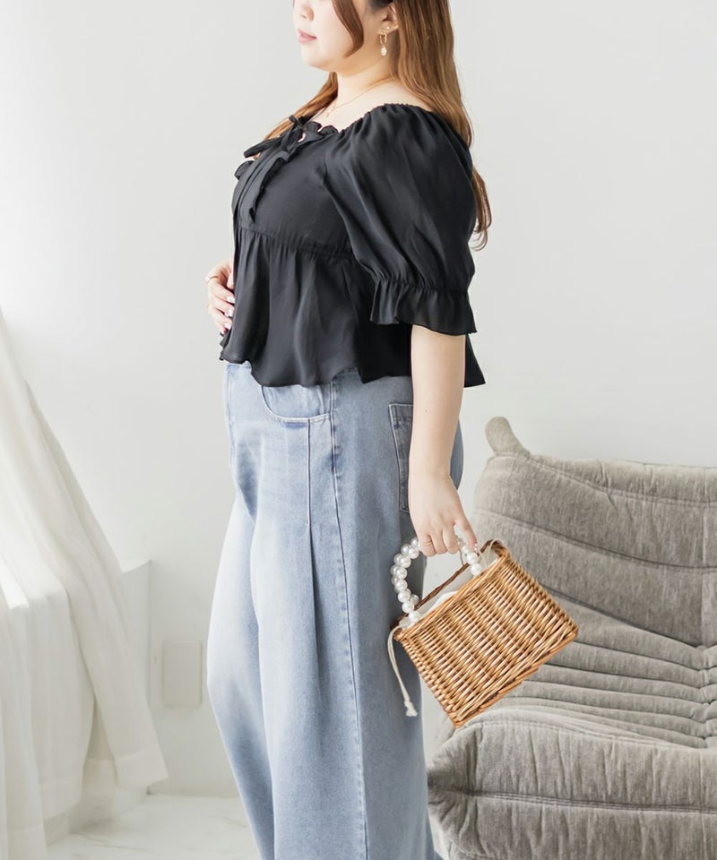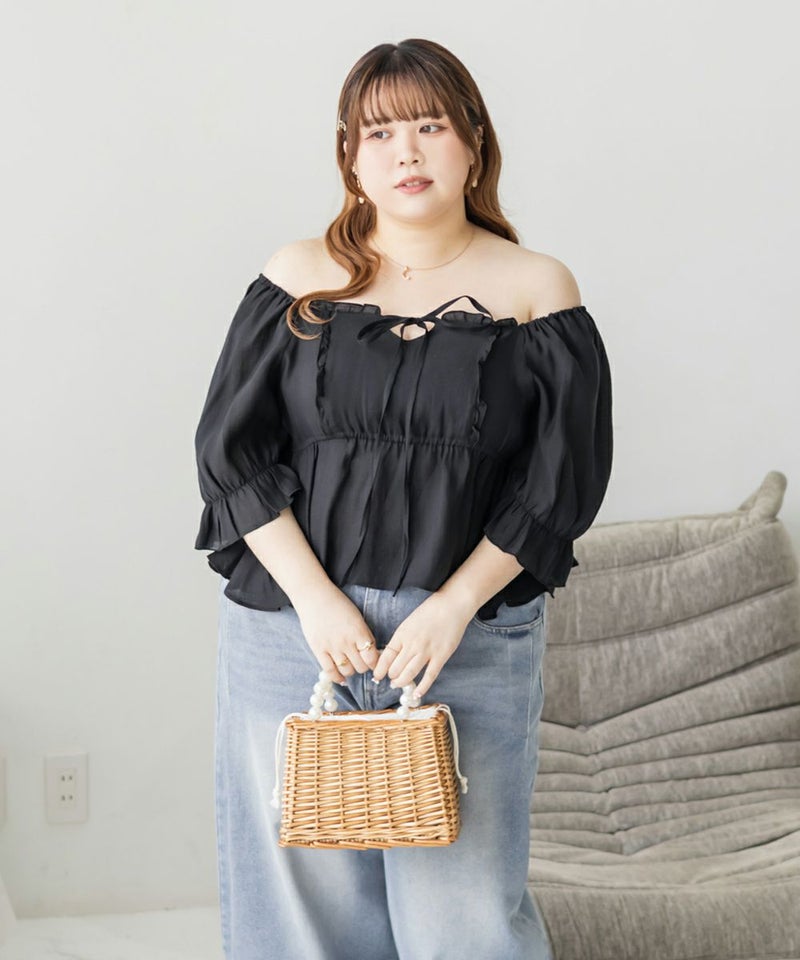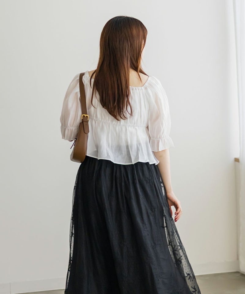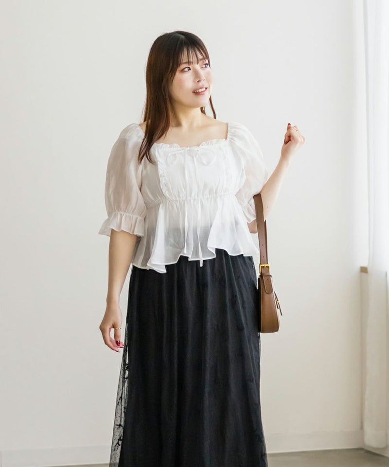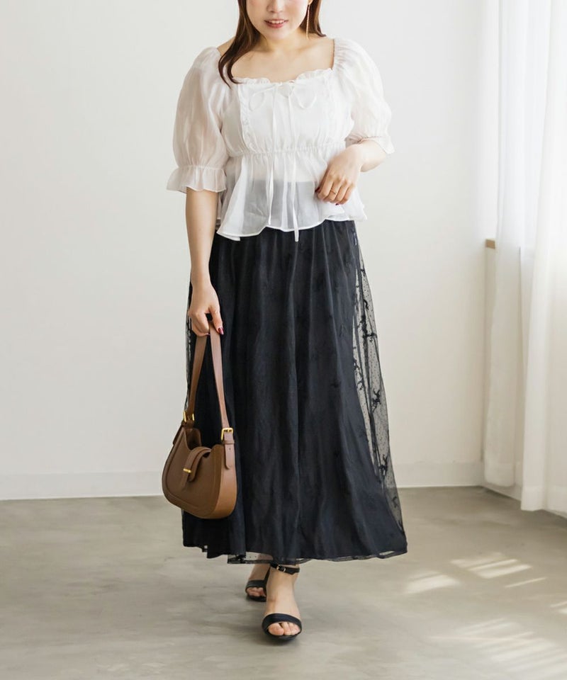 3Lサイズを着用してちょうどいいサイズ感でした。肩にもゴムが入っているのでオフショルにしてもずり落ちにくいのが嬉しいです♪高めの切り替えからふわっと広がるデザインが魅力のブラウスで、気になるお腹周りをすっきりカバーしてくれます!デコルテラインをきれいに見せてくれるスクエアネックは大人女子にぴったり!ふんわりした色味と素材感がフェミニンさを格上げしてくれます◎
