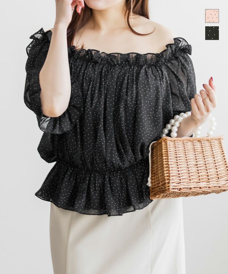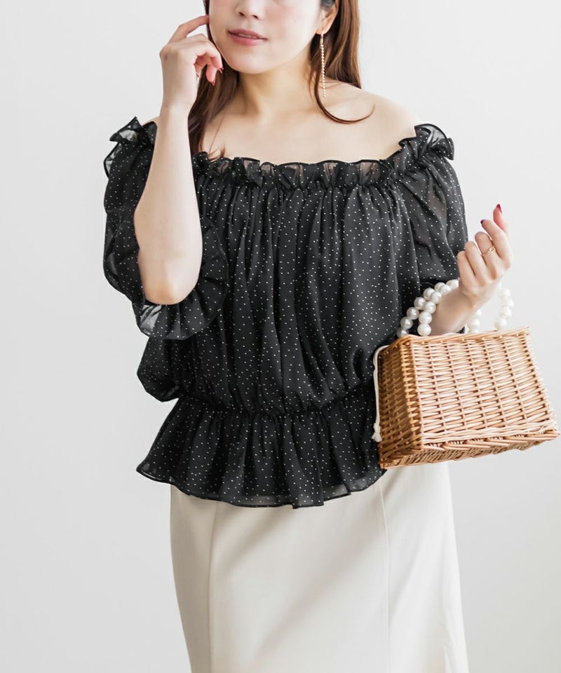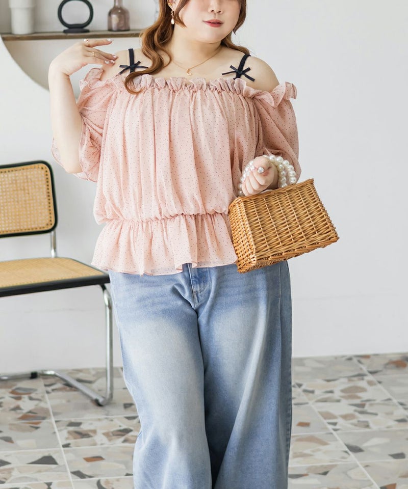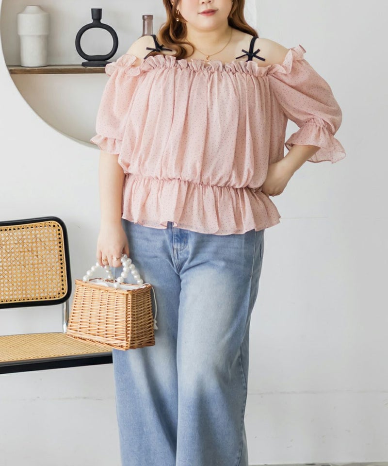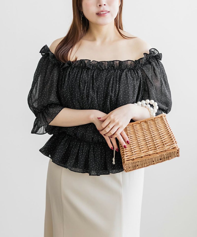 3Lを着て程よくゆとりを持って着られて楽な着心地でした!オフショルにもなる2WAYデザインで、スタイリングの幅が広がります♪今っぽいドット柄が可愛くて、フェミニンな印象のブラウスです!パンツにもスカートにも合わせやすく、華やかになれる1枚です。シアー感のある軽やかな生地で、袖以外は裏地もついていて透ける心配もない安心のデザインです!デートやお出かけにおすすめです◎