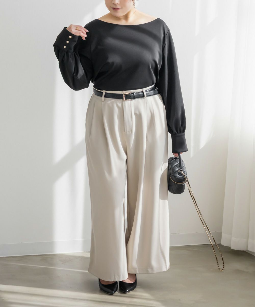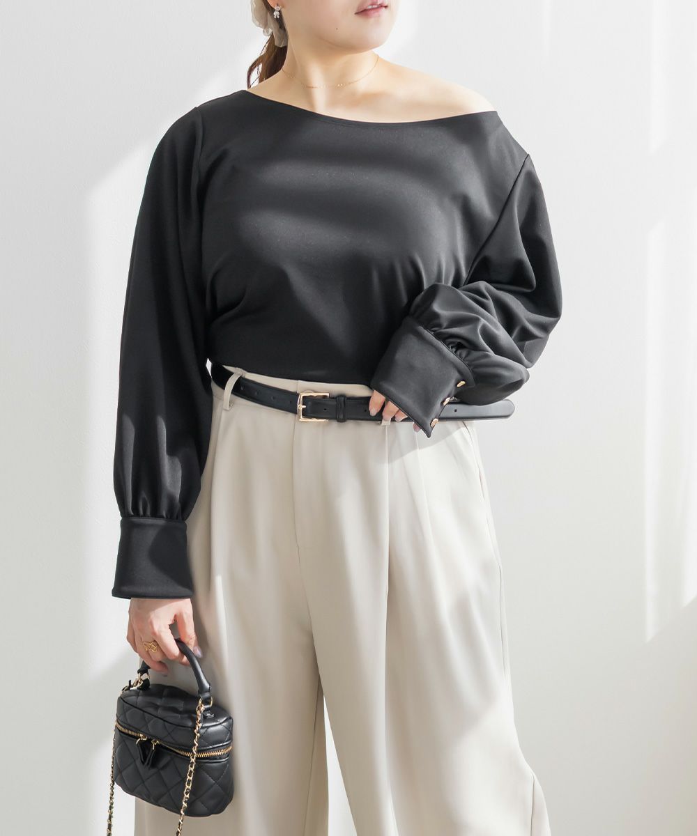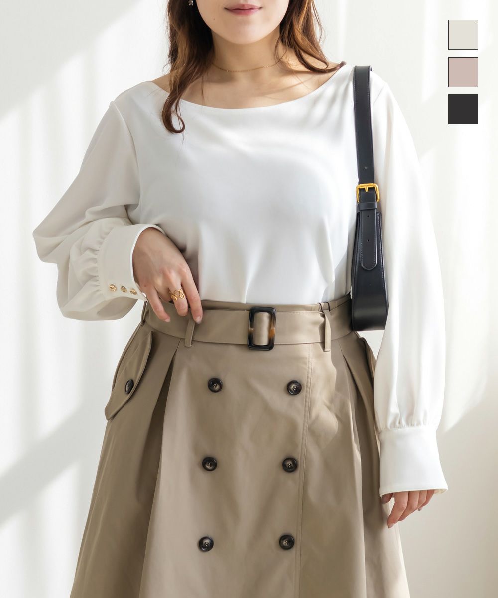 3Lサイズを着用して、ちょうどよくいつも通りのサイズ選びで問題なさそうでした。生地に伸縮性があって、程よくフィットしながらも窮屈さがなく、ちょうどいい着心地です♪ ボートネックの開きがデコルテをきれいに見せてくれ、片側だけ肩を落として着てもラインがきれいに決まり、今年っぽい抜け感が簡単に出せます◎ 袖のゴールドボタンが上品で、シンプルなボトムに合わせても華やかさがプラスされるのが嬉しいです!オンオフ問わず使いやすいので、ジャケットのインナーなどにも重宝しそうです!シーズンレスで使えるさらっとした生地感も魅力です。