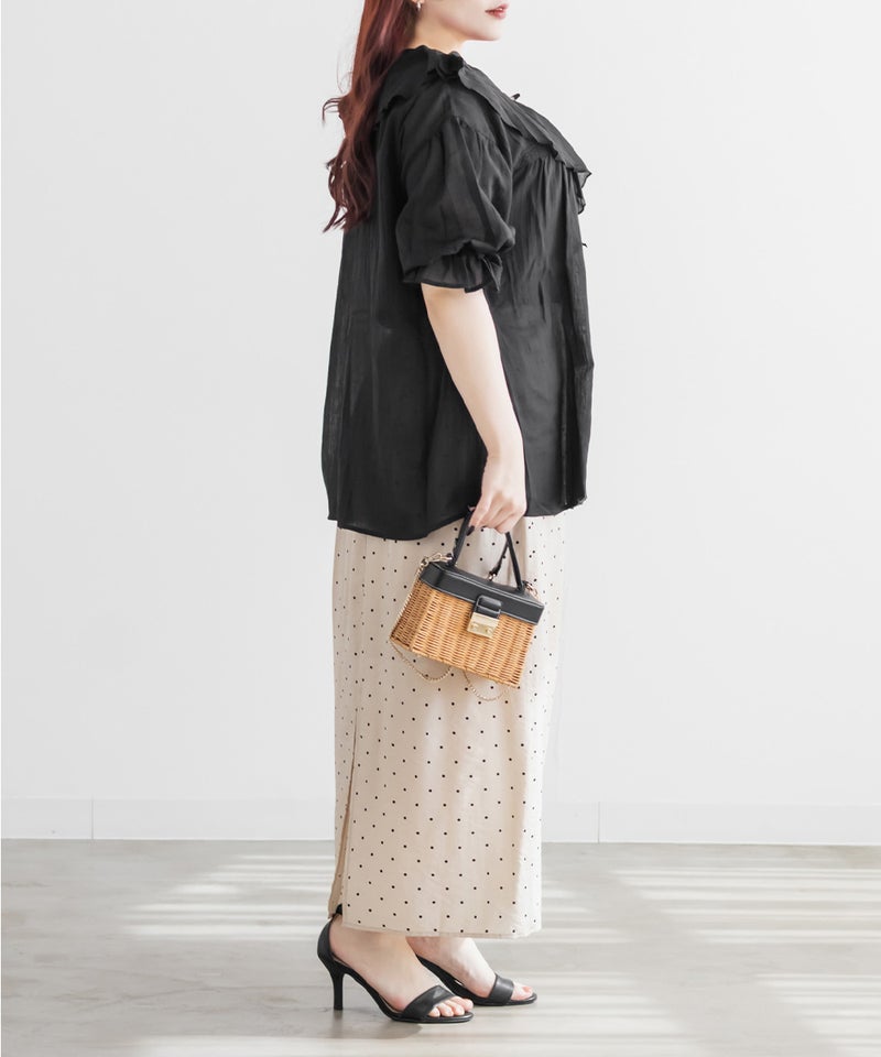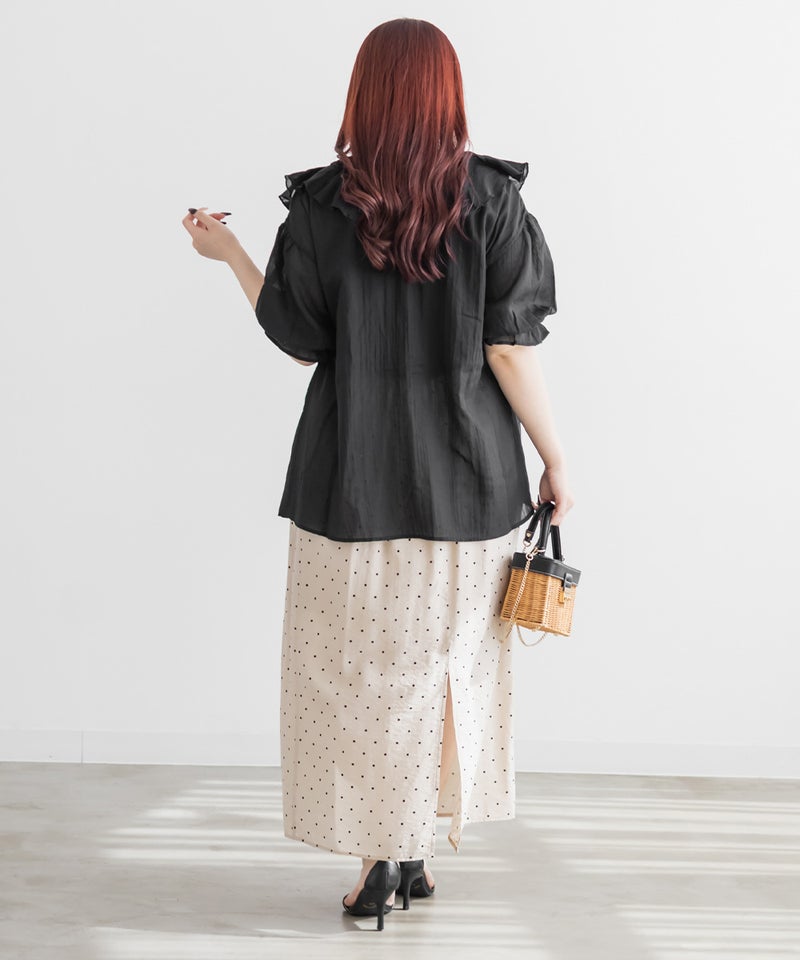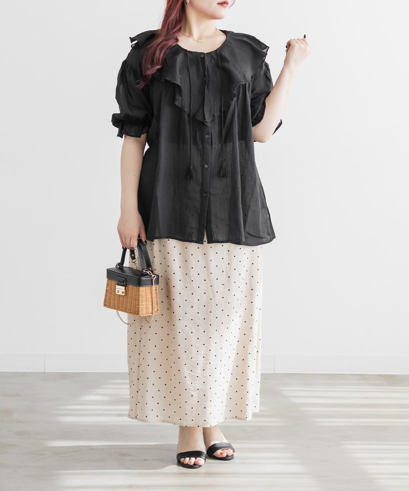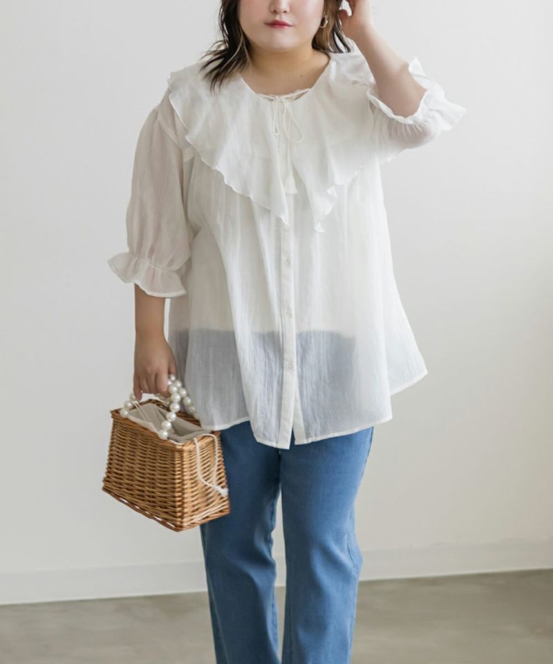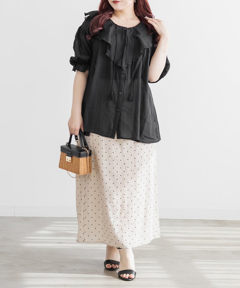 3Lサイズを着用してゆとりのあるサイズ感でした。ふわっと軽いガーゼ素材がとにかく気持ちよく、通気性もバッチリで春夏にぴったりです♪胸元のリボンやフリルが顔まわりを華やかに見せてくれて、1枚で映える主役級ブラウスです。長めの袖丈で二の腕を優しくカバーしてくれ、可愛さと体型カバーを両立してくれる嬉しいポイント。着るだけで甘さをプラスしてくれる、とっておきの一枚です◎裾を出してさらっとこなれ感のあるコーデや、甘めのスカートと合わせてフェミニンな着こなしもお勧めです!