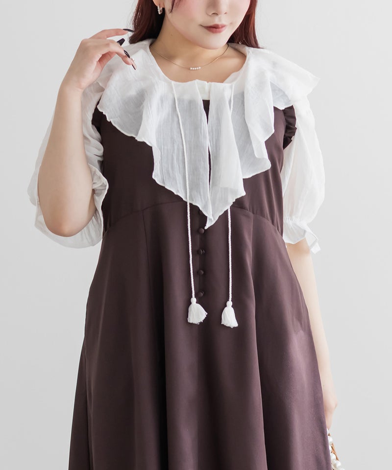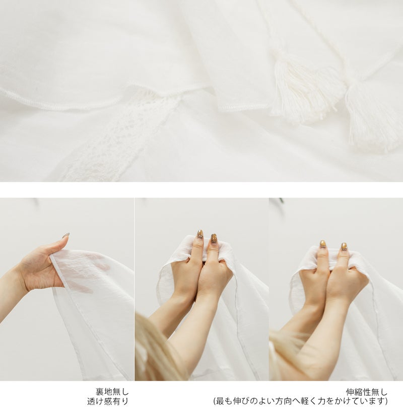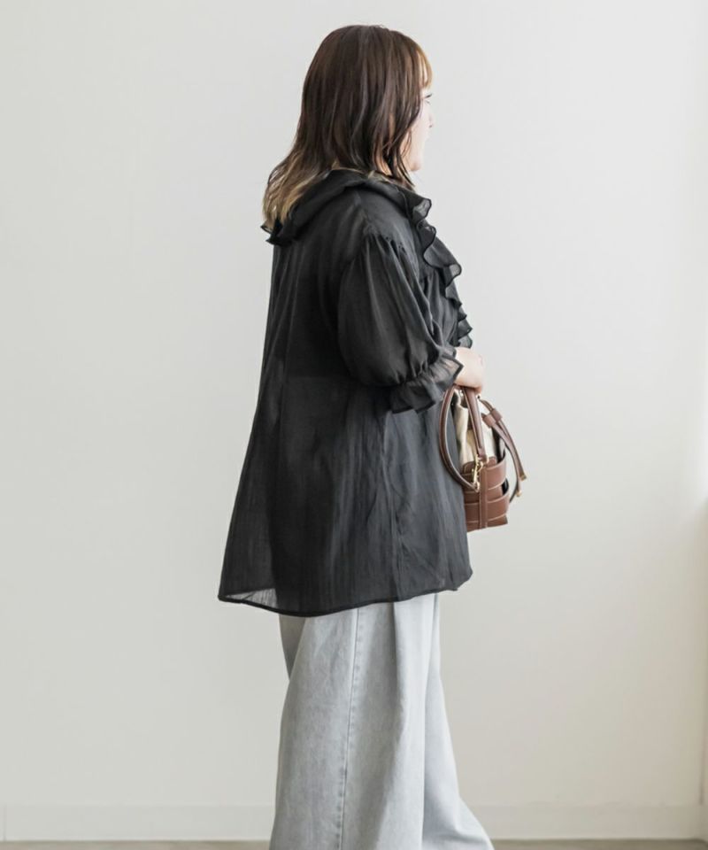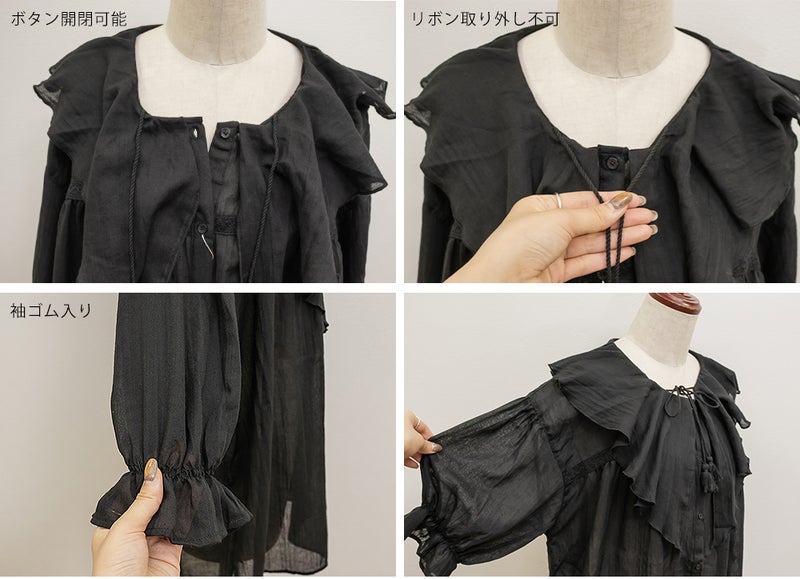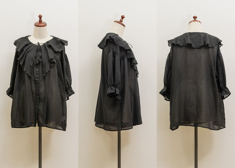 3Lサイズを着用してゆとりのあるサイズ感でした。ふわっと軽いガーゼ素材がとにかく気持ちよく、通気性もバッチリで春夏にぴったりです♪胸元のリボンやフリルが顔まわりを華やかに見せてくれて、1枚で映える主役級ブラウスです。長めの袖丈で二の腕を優しくカバーしてくれ、可愛さと体型カバーを両立してくれる嬉しいポイント。着るだけで甘さをプラスしてくれる、とっておきの一枚です◎裾を出してさらっとこなれ感のあるコーデや、甘めのスカートと合わせてフェミニンな着こなしもお勧めです!