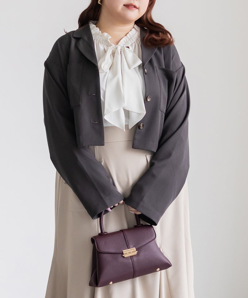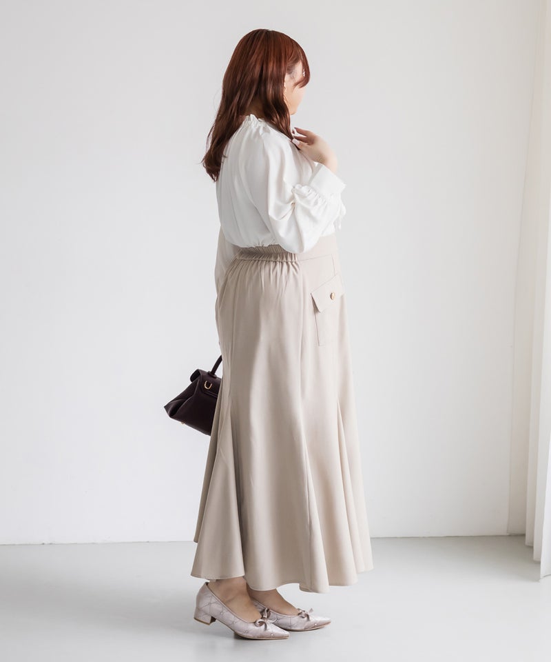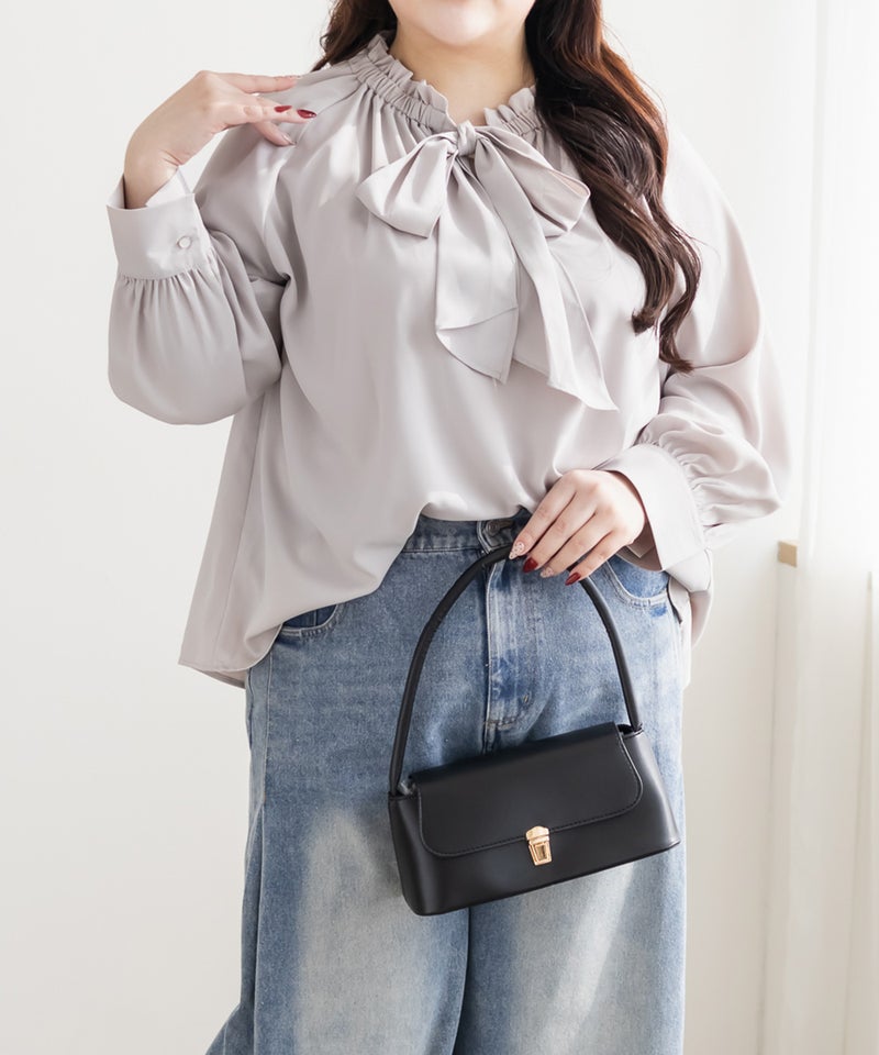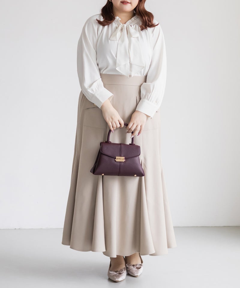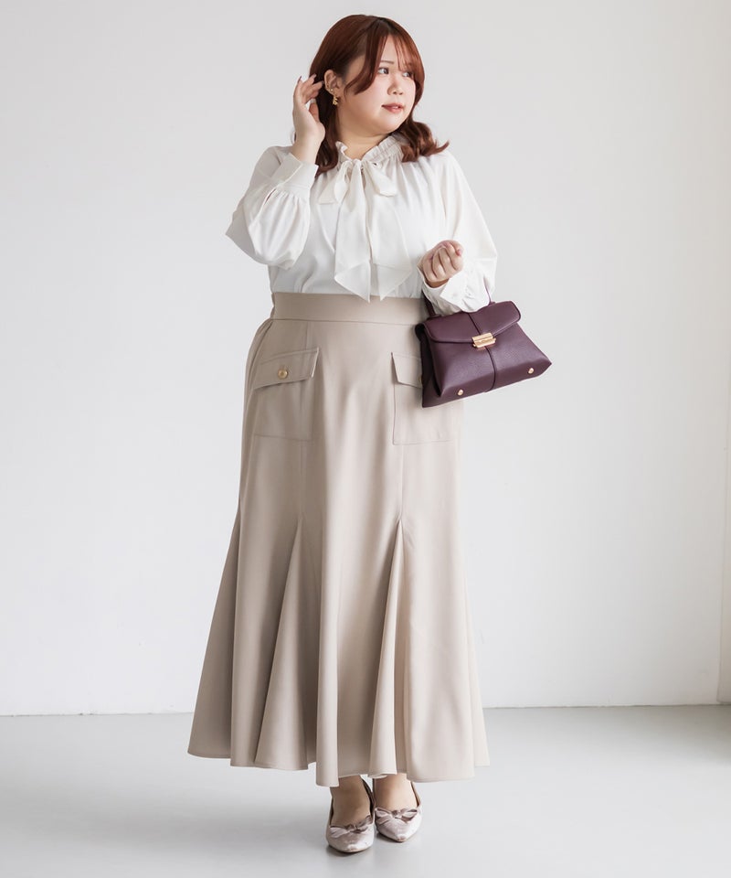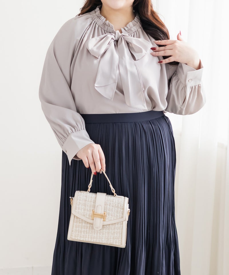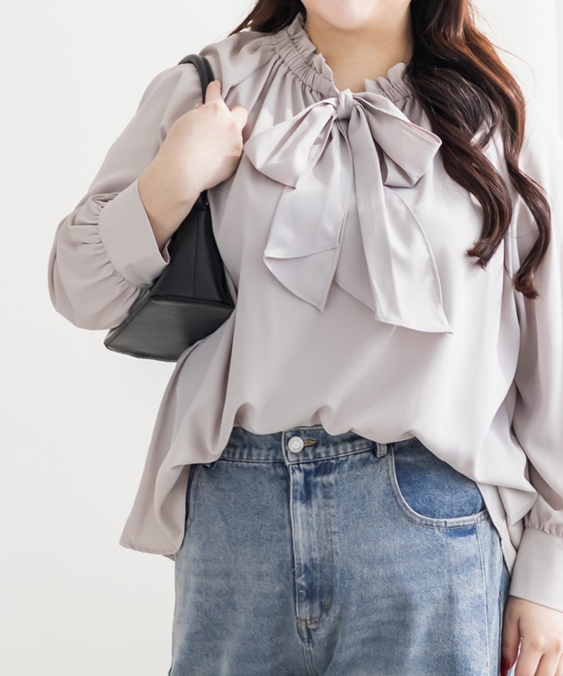 3Lサイズを着用しました。身頃や腕まわりに程よくゆとりがあり、全体的にちょうどいい着心地でした。首元のボウタイとフリルギャザーが華やかな印象で、1枚でコーデが決まる主役ブラウスです♪ ふんわりとしたシルエットで気になる体型を自然にカバーしてくれるのも嬉しいポイントでした。
