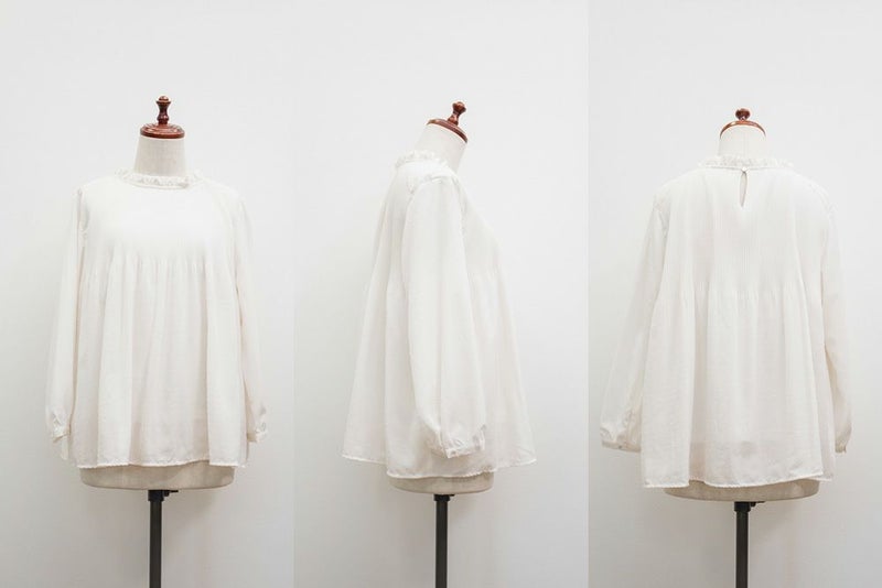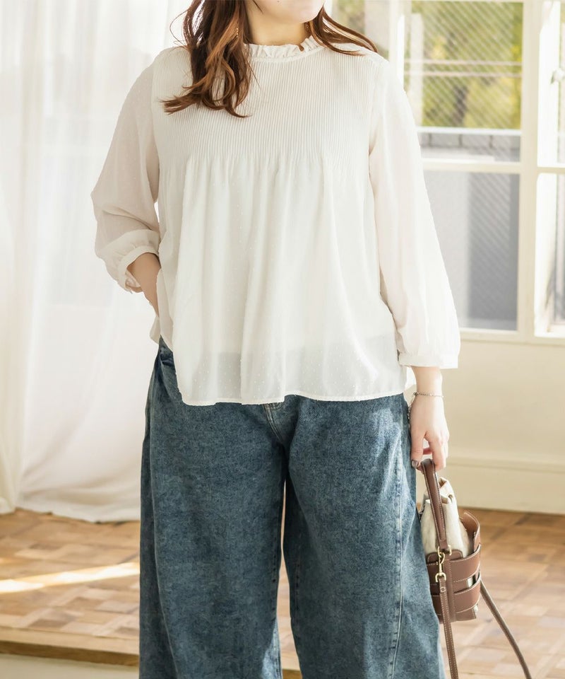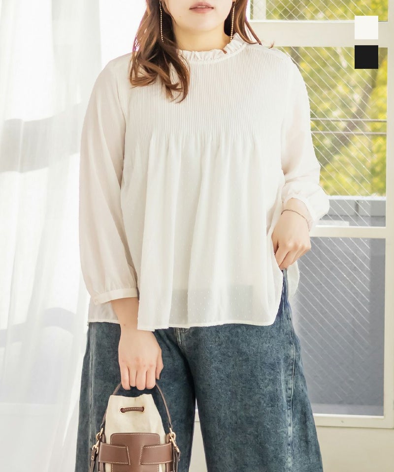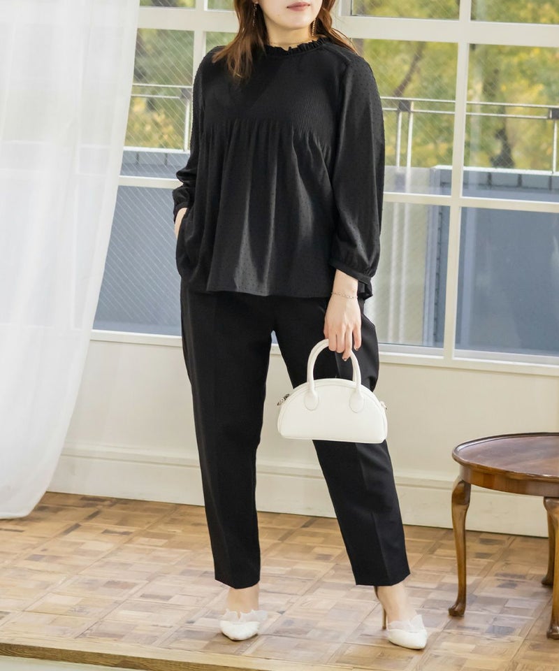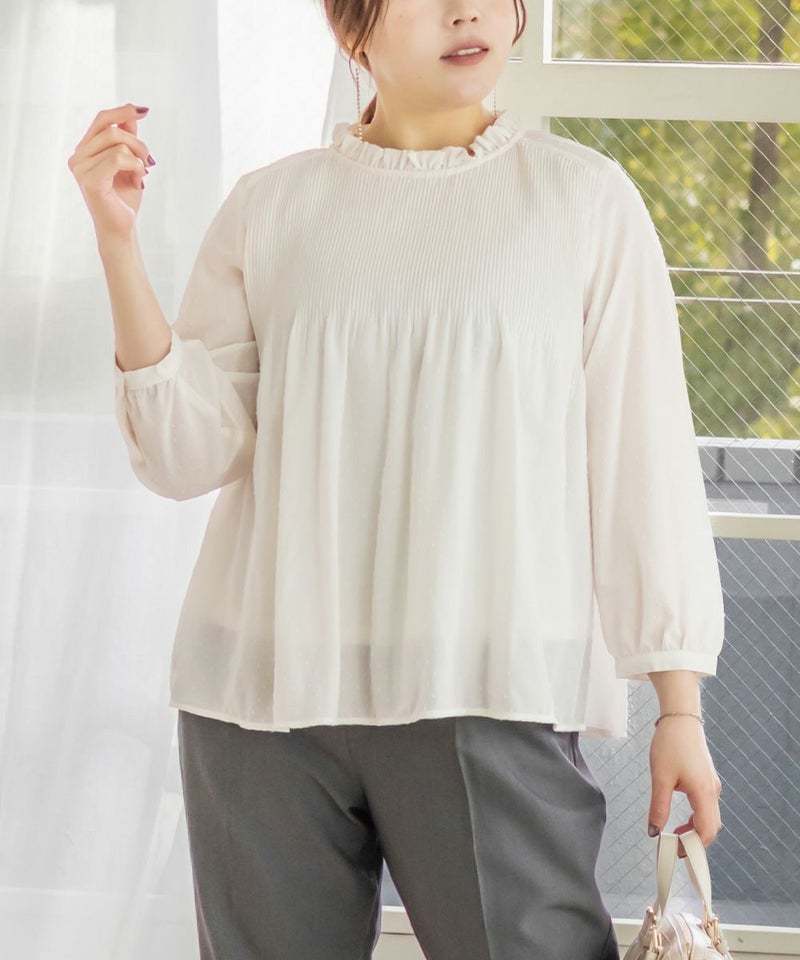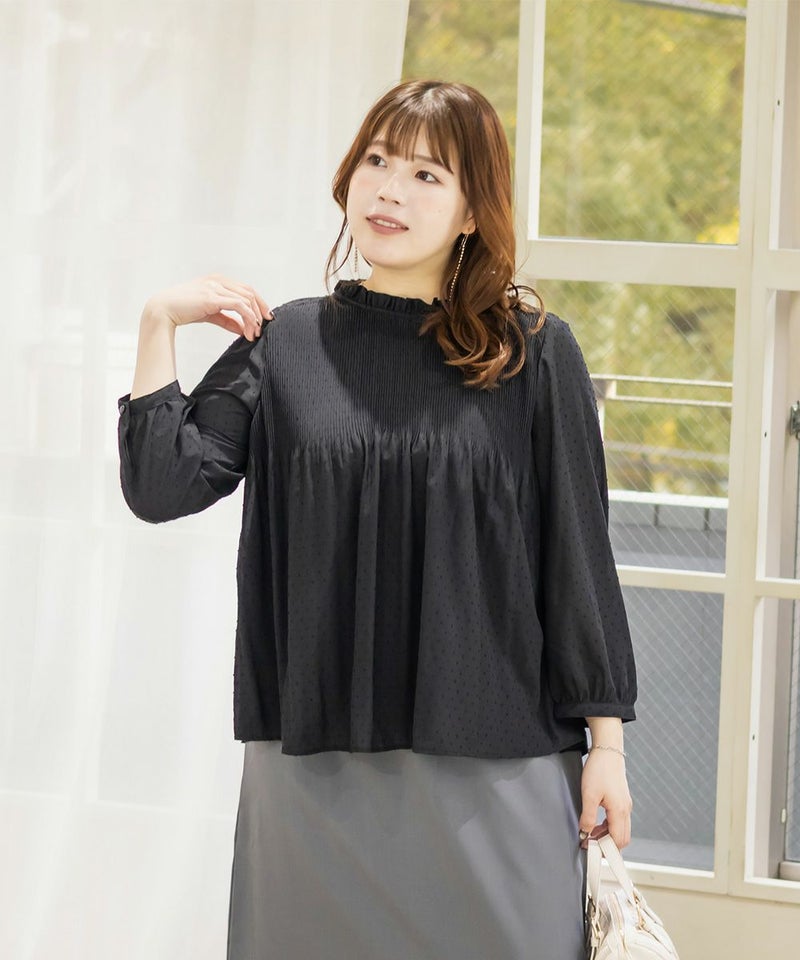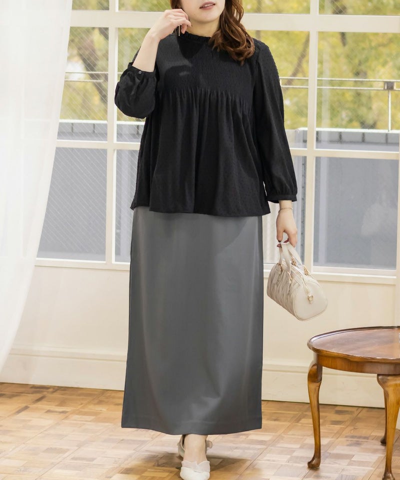3Lを着てちょうどいいサイズでした。いつも通りのサイズ選びで問題なさそうです!柔らかいさらっとした風合いとプリーツが施されているので着心地もらくちんでした!裾は少しひらっと広がるようなデザインだから、お腹や腰回りをカバーしてくれます◎裾を出したスタイルで体型カバーもできるし、柔らかい生地だからインも問題なくできそうです!綺麗めな雰囲気なので、普段のお仕事着としてはもちろん、お食事会などの特別なお出かけ着としても使えます。