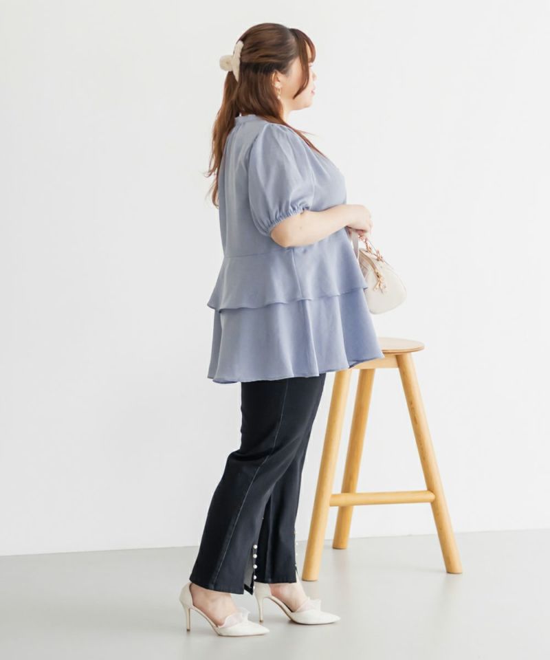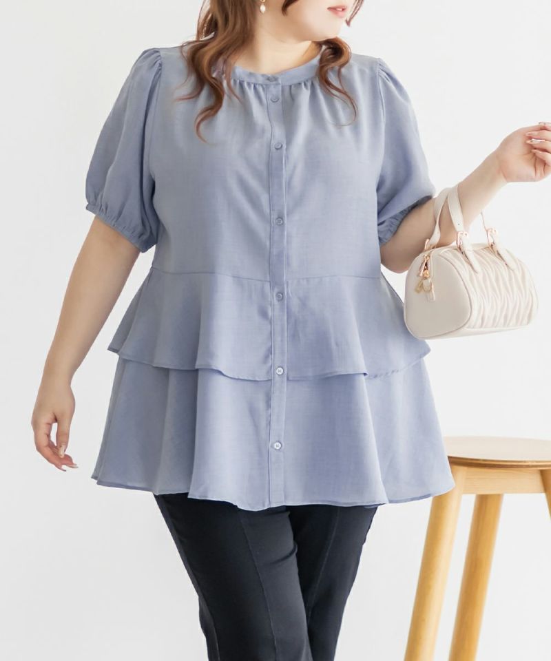 3Lを着てちょうどいい着心地でした。特に窮屈に感じるところはなかったです。ウエスト切替からふんわり広がるティアードシルエットが華やかで、気になるお腹まわりも自然にカバー♪ウエストがキュッとくびれて見えるデザインで、自然とスタイルアップして見えます!お尻まで隠してくれる着丈なのでバランスよく着られます◎袖のボリューム感も可愛くて、1枚で存在感のあるスタイリングが完成!さらっとした素材感で着心地も軽く、シーズンを通して大活躍してくれそうです。