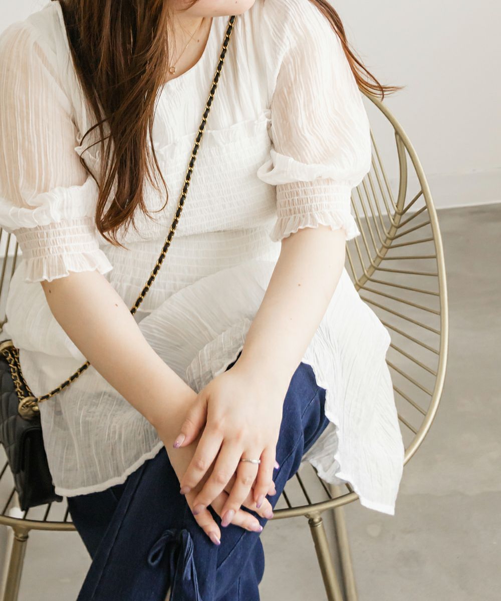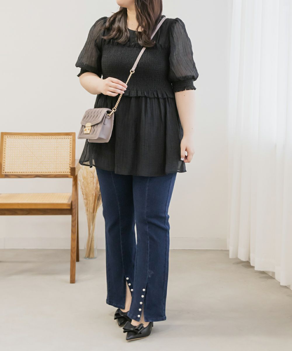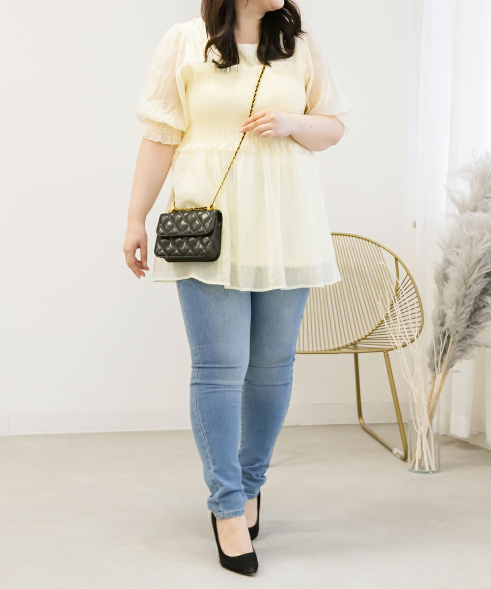 LLを着てちょうどいいサイズでした。袖口と、胸からウエストにかけてがシャーリングになっていて、程よくフィットしてくれます。ペプラムシルエットが下腹や腰回りをカバーしてすっきりとスタイルアップできるブラウスです!ナロースカートやパンツとの相性が良さそうです◎