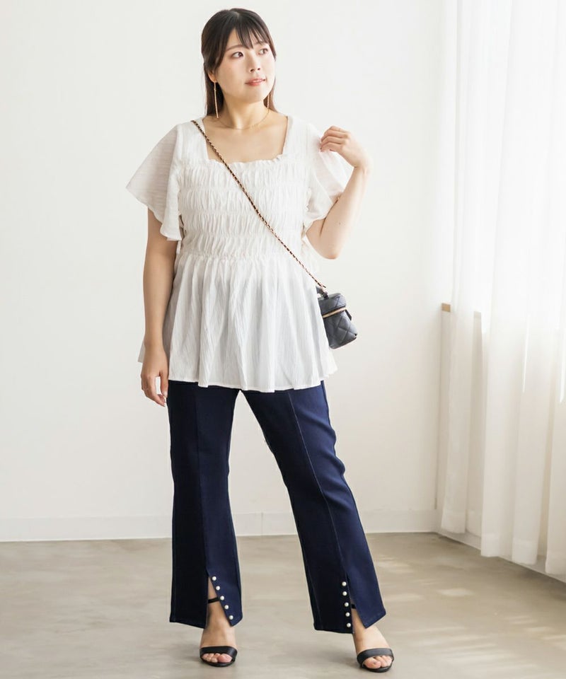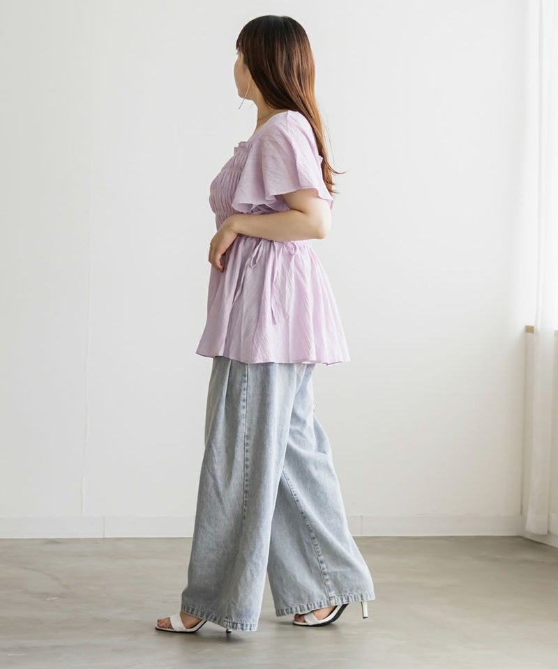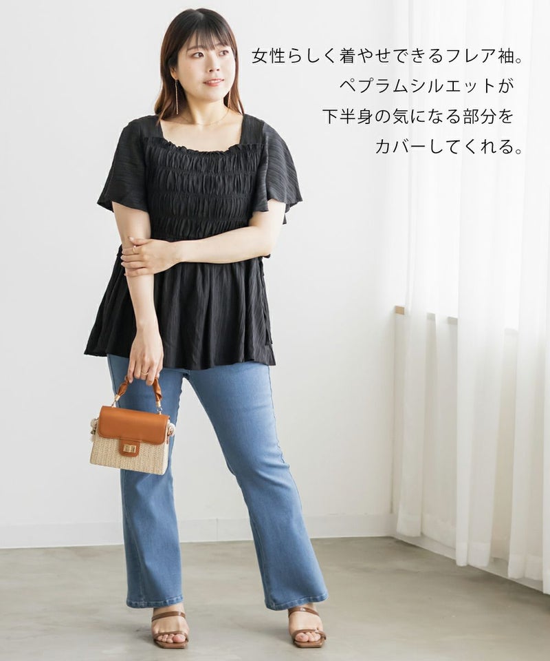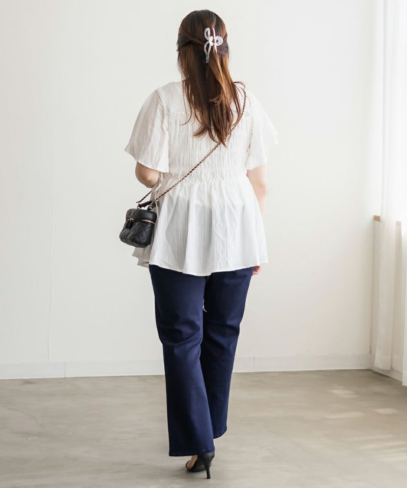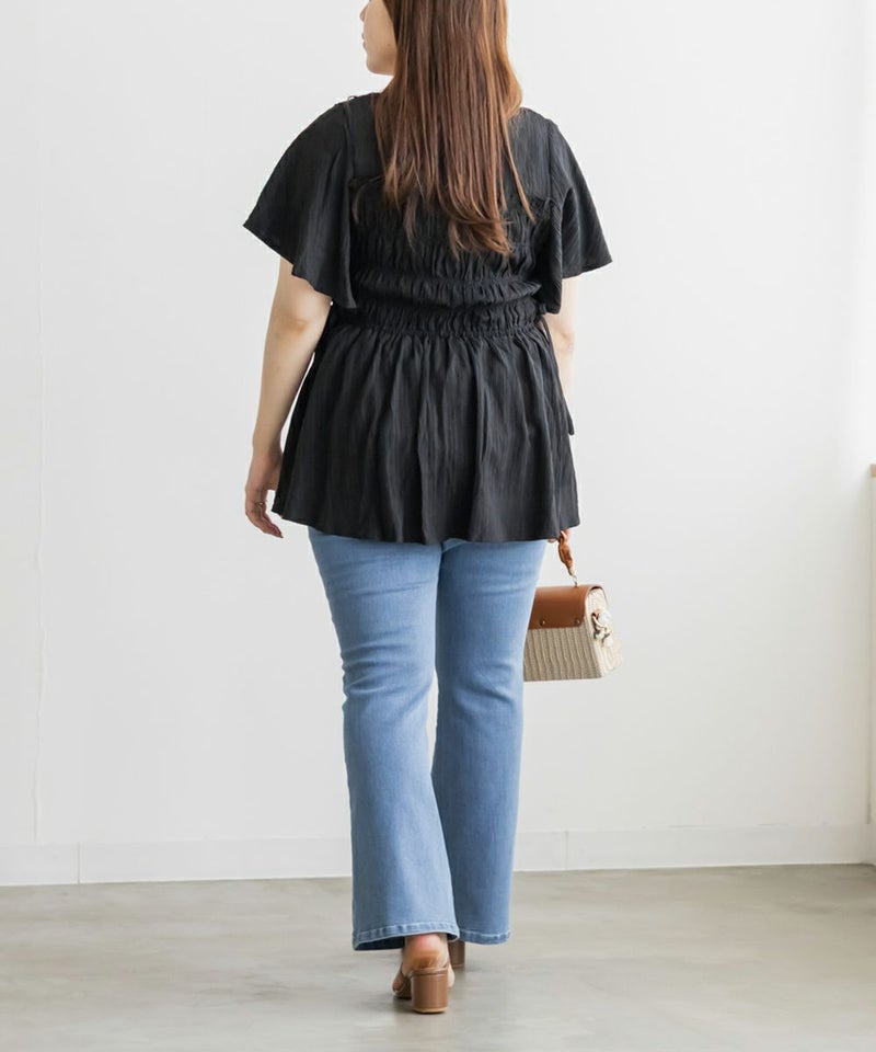 3Lサイズで全体的にちょうどよく、ウエストのシャーリングが自然にフィットして、メリハリのあるシルエットに見せてくれます◎サイドのレースアップデザインがアクセントになって、サッと着るだけでおしゃれ上級者な雰囲気に♪お腹まわりはシャーリングで程よくカバーしつつ、締めつけ感はないので、着心地もとっても楽でした。袖は二の腕をふんわり隠してくれる長さとボリューム感があり、体型カバーもバッチリ!デニムでカジュアルに、スカート合わせで甘めにも着られる、着回し力の高いアイテムです。