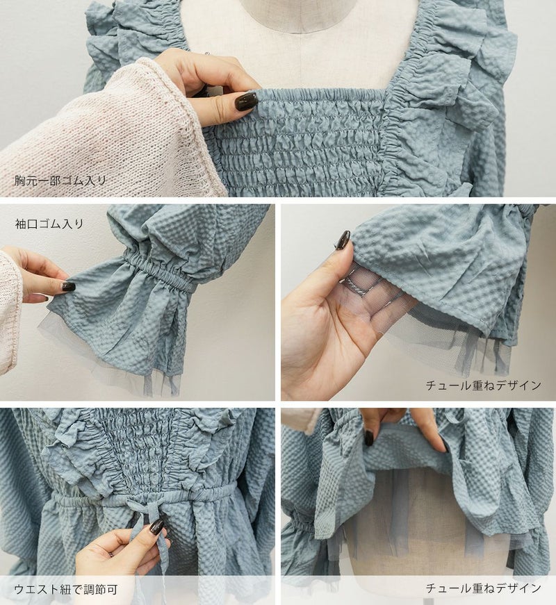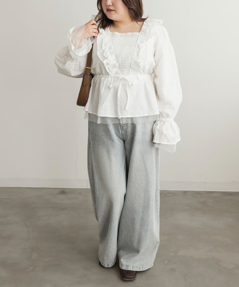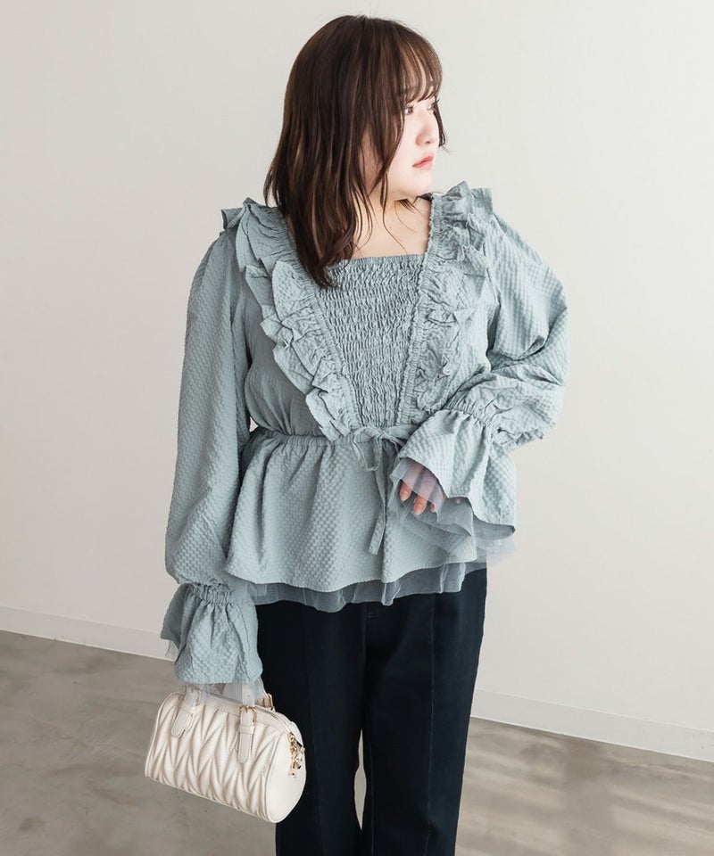 LLを着てちょうどいいサイズでした。ウエストは少し紐で調節で着たのでお好みのサイズ感で着用出来ます。凹凸のある生地とフリルがボディラインをカバーしてくれます!洗練されたデザインになっていて細かいところまで可愛いです◎胸元が見えないけれどすっきりとしたネックデザインとシャーリングゴムで着心地が楽なのも嬉しいです!ペプラムシルエットになっていて気になるお腹周りをカバーしてくれます♪ガーリーフェミニンになりすぎず、大人っぽく着こなせるので、色々なシーンで着回しできそうです。