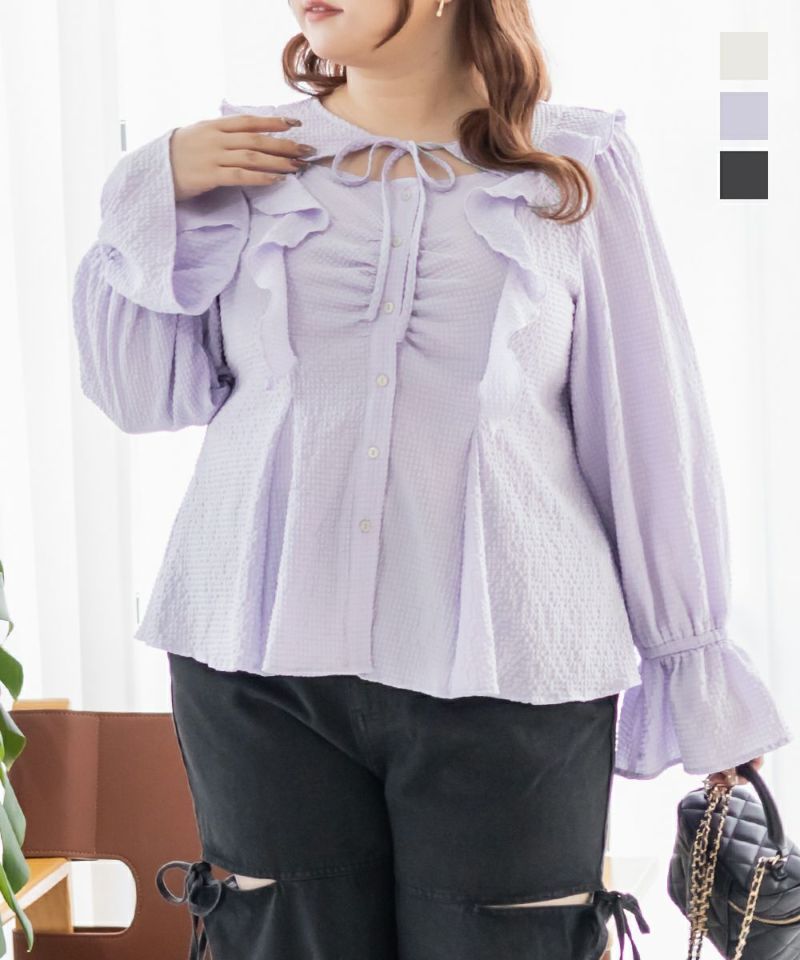 3Lサイズを着用してちょうどいいサイズ感でした。ウエストにタックが入っていて切替が無いのにメリハリが出てすっきりした印象で着用できました♪デコルテのリボンは女性らしいポイントになってネックレスいらずなのも嬉しいです◎ウエストはくびれて見えるデザインでスタイルアップ効果も◎凹凸のある軽い生地で長いシーズン着やすいです。袖もふんわりして二の腕カバーもバッチリで、デートやお出かけに着ていきたくなる1枚で着映えするブラウスです!