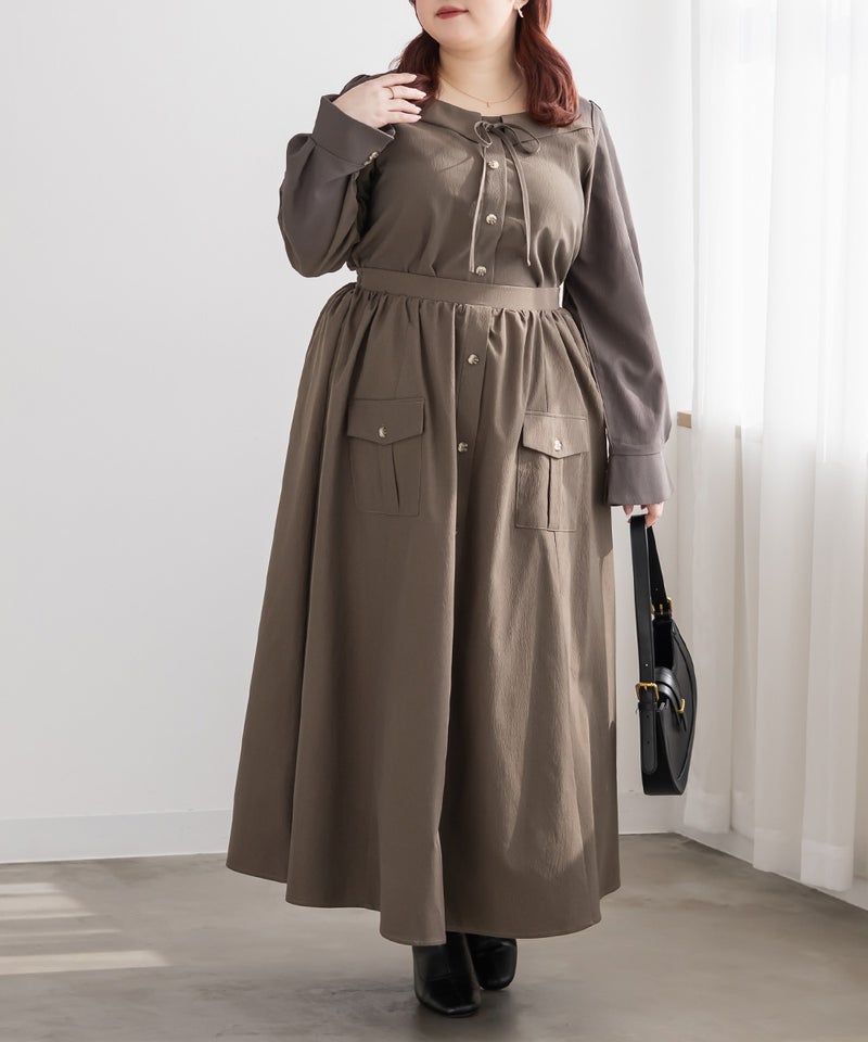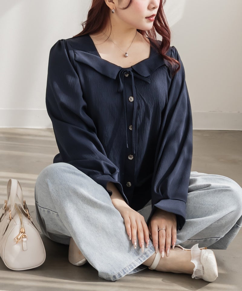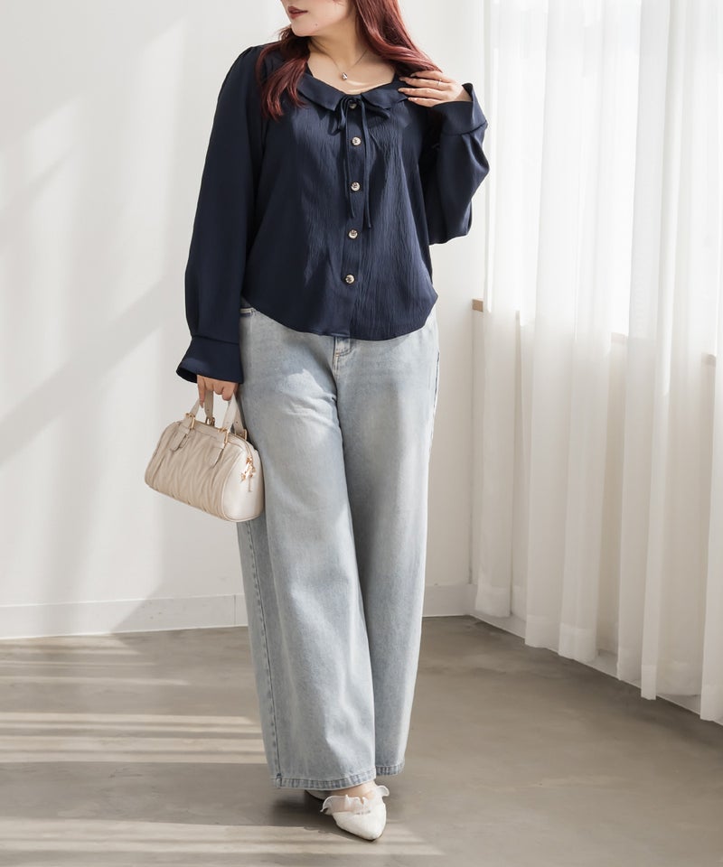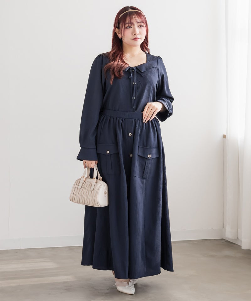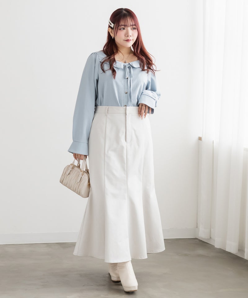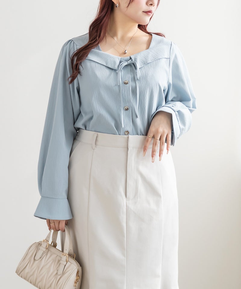 3Lサイズを着用しました。身幅や肩まわりに程よくゆとりがあり、全体的にちょうどいい着心地でした。フロントのリボンデザインがさりげなく華やかで、顔まわりを明るく見せてくれるのが嬉しいポイント♪ネックはスクエアに開いていてデコルテやお顔がすっきり見えします! 甘くなりすぎないデザインなので大人フェミニンに着られます。 1枚で着映えするのはもちろん、同素材のロングスカートと合わせればセットアップも楽しめます◎ きちんと感のあるスタイルにもおすすめです。