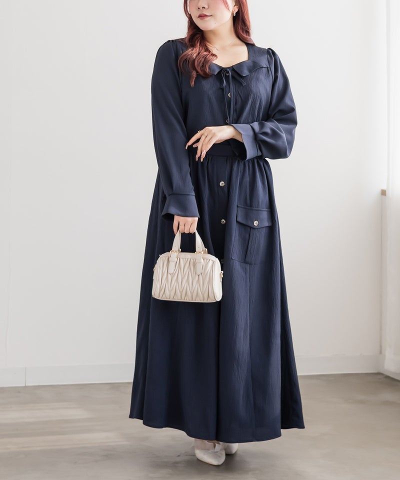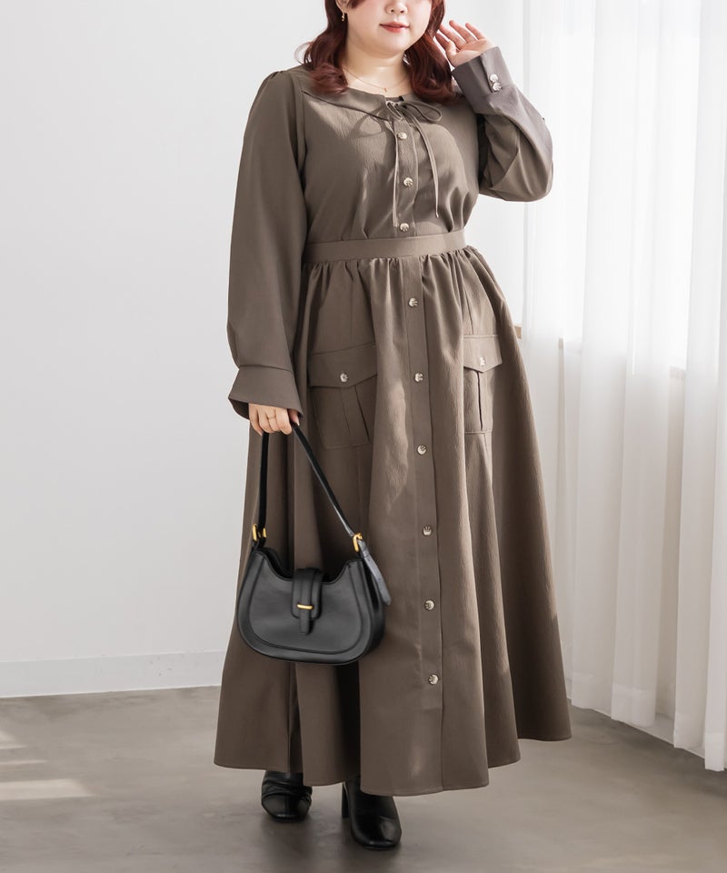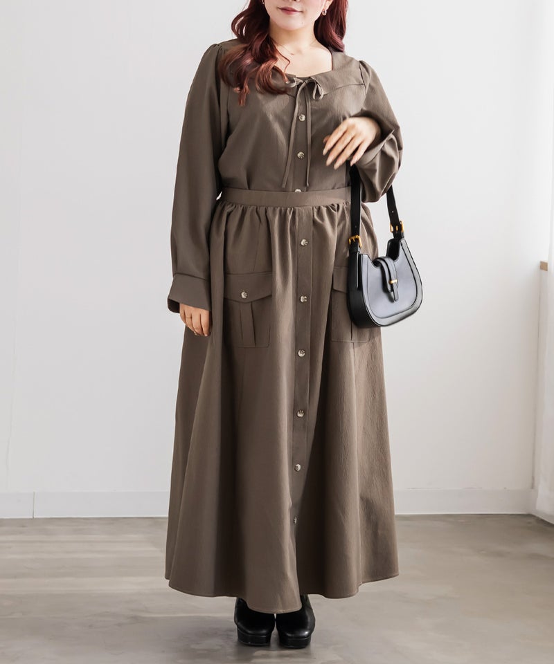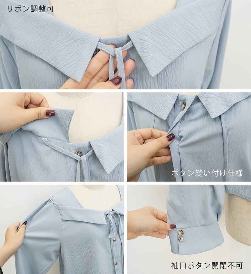 顔回りすっきりなスクエアの襟デザインと大人っぽいリボン使いで、フェミニンだけど上品さのある1枚。前立て釦がアクセントになって着やせ効果をプラス。