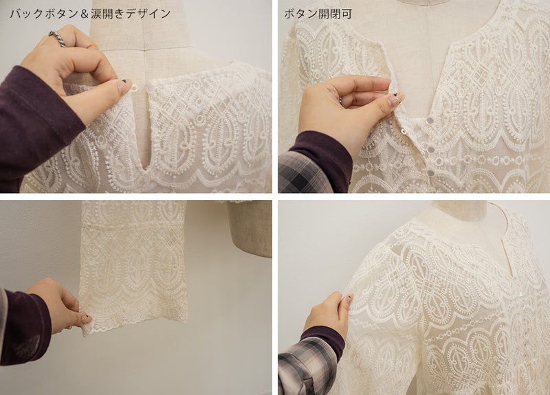 柄が大きくややハリ感があるレース素材。肌に張り付きにくいので春先もおすすめ。