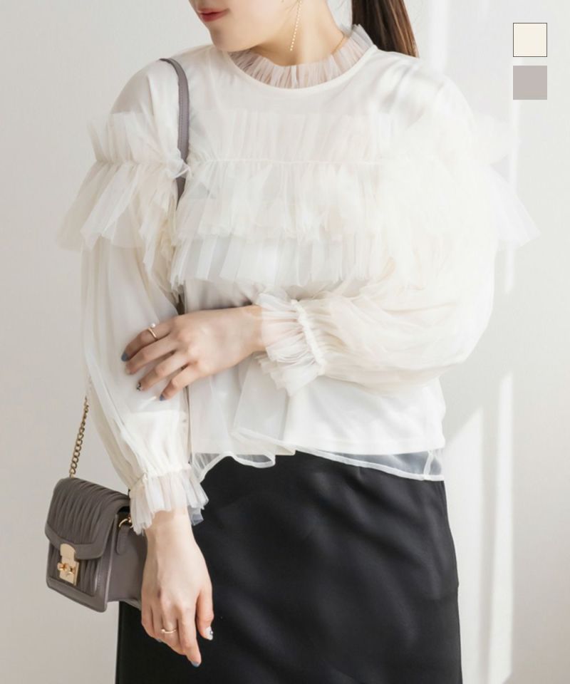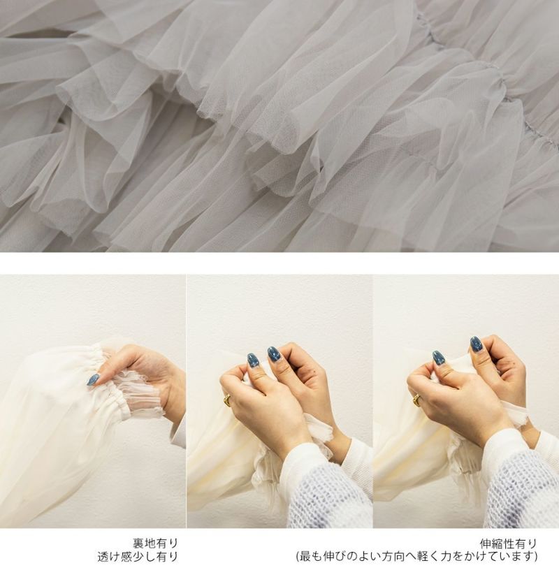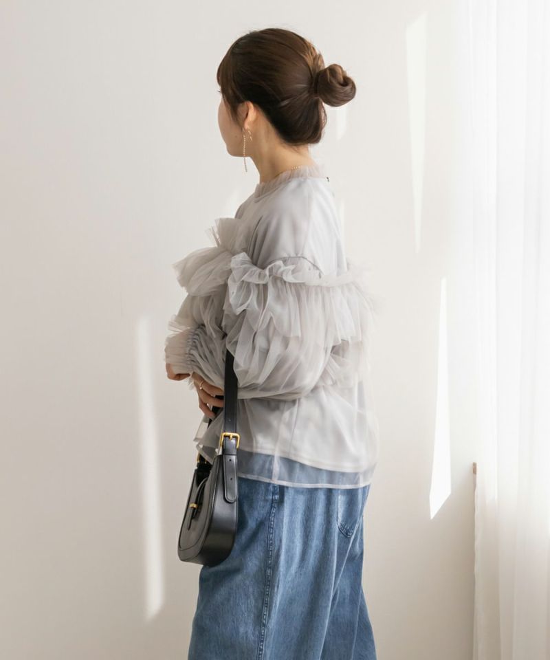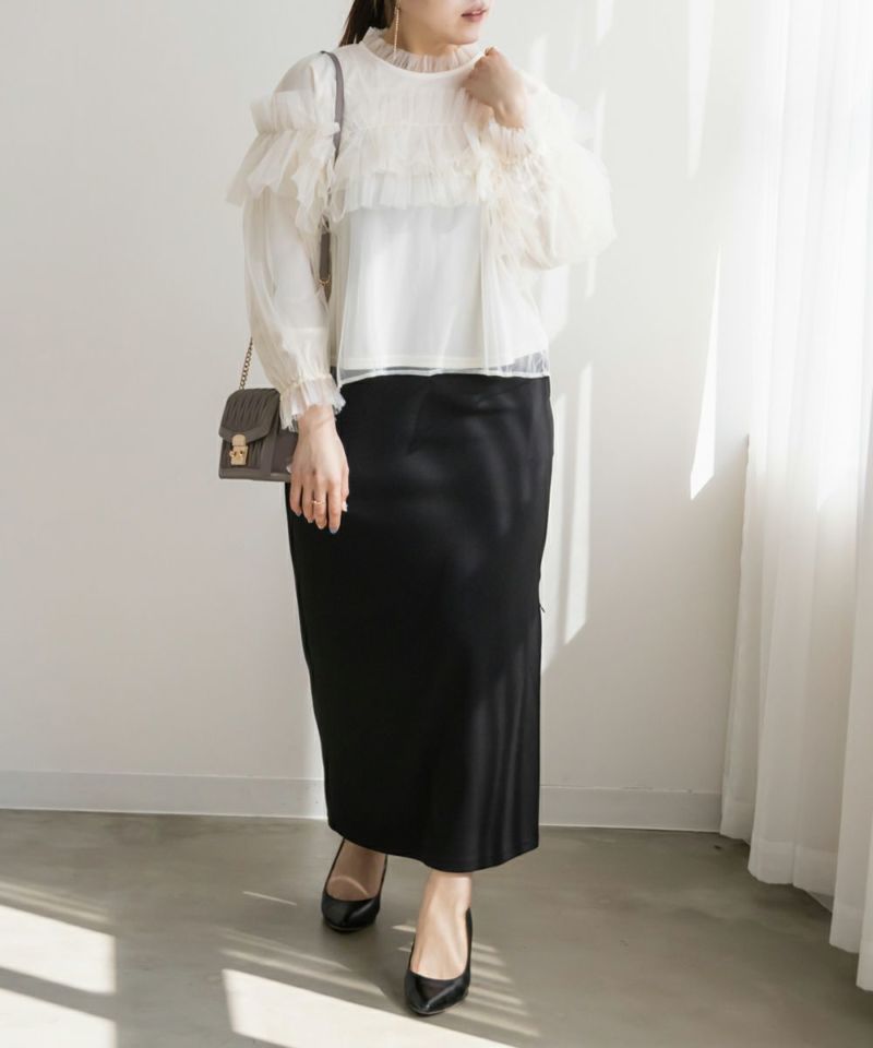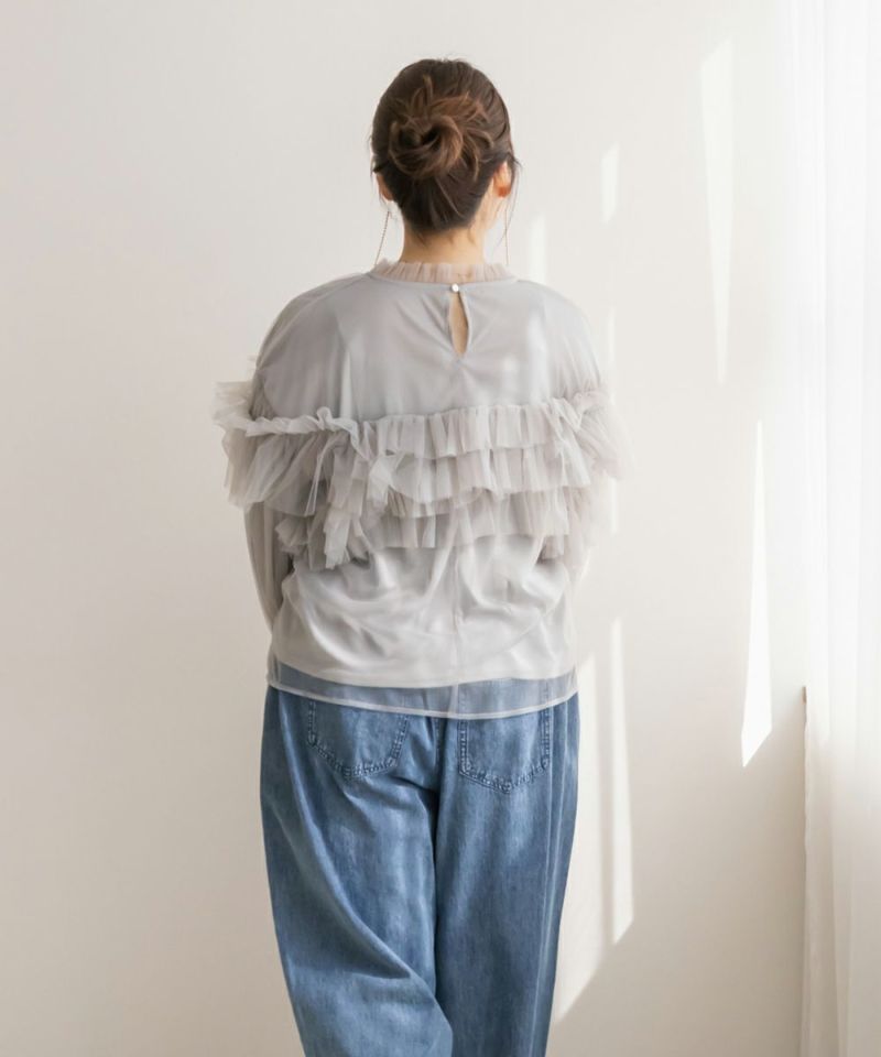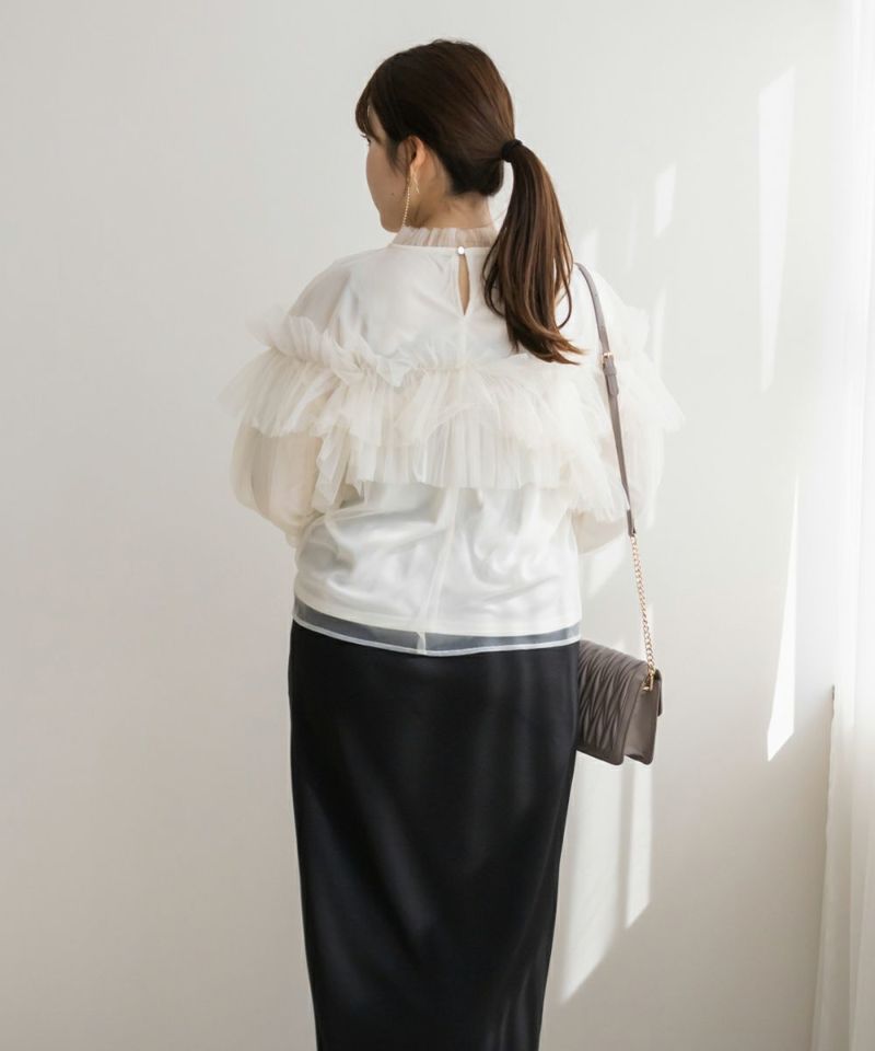 3Lサイズを着用して、いつもどおりのサイズ感でちょうどよく着られました♪ 全体が柔らかいチュール素材でふんわりとしたシルエットが特徴的◎ たっぷり入ったフリルデザインが華やかで、1枚でコーデの主役になるトップスです! 肩のフリルは少し寝かせると控えめに、立たせるとより華やかにと、シーンに合わせてアレンジできるのも嬉しいポイント◎ 袖口はゴム仕様でふんわり感をキープしながらも、腕まわりがスッキリと見えるのが嬉しい♪ デニムと合わせてカジュアルダウンしたり、タイトスカートと合わせてフェミニンに着こなすのもおすすめです!