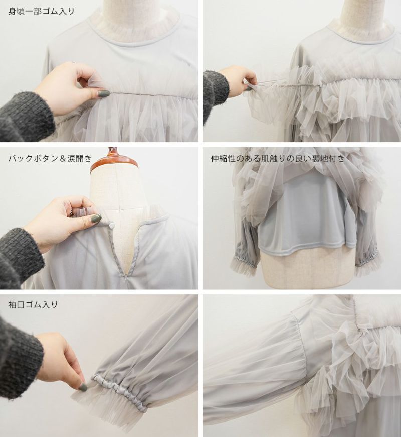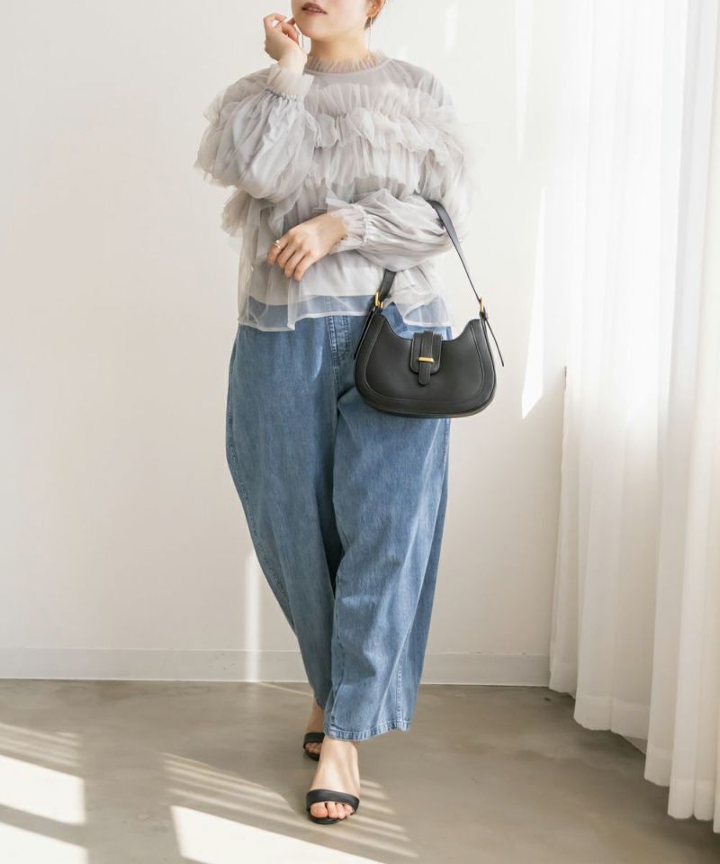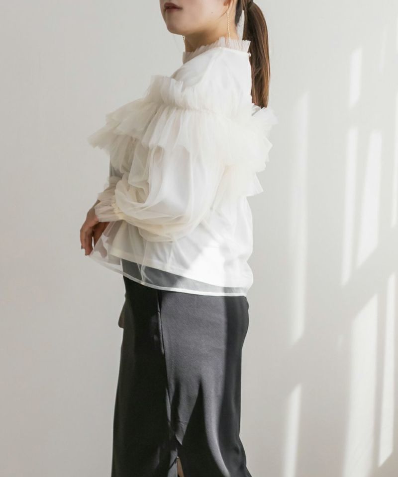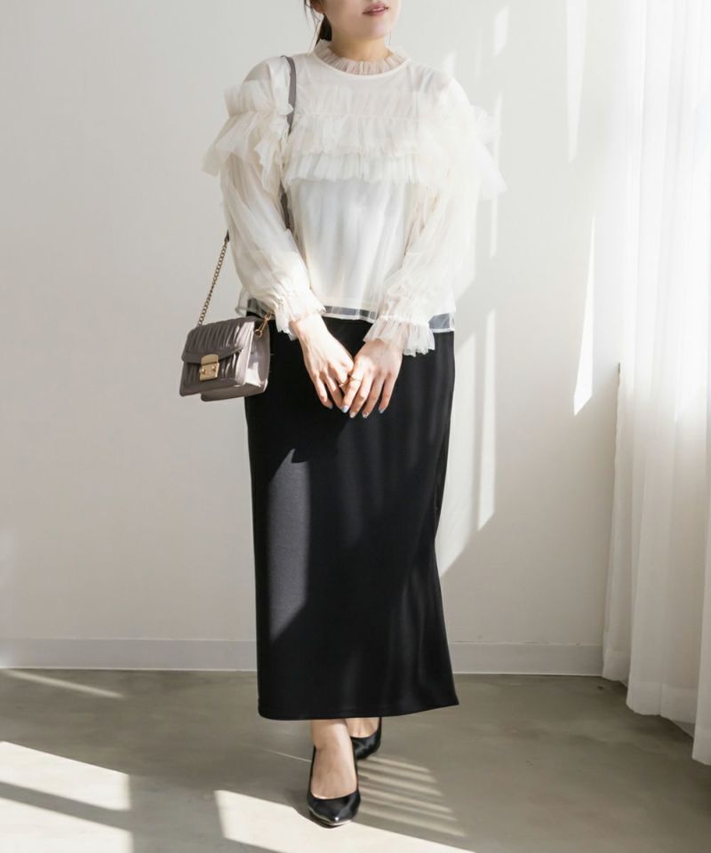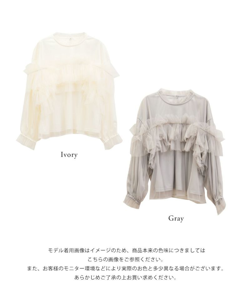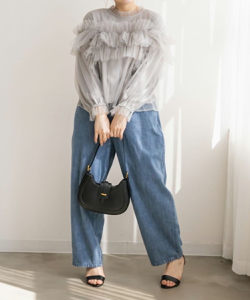 3Lサイズを着用して、いつもどおりのサイズ感でちょうどよく着られました♪ 全体が柔らかいチュール素材でふんわりとしたシルエットが特徴的◎ たっぷり入ったフリルデザインが華やかで、1枚でコーデの主役になるトップスです! 肩のフリルは少し寝かせると控えめに、立たせるとより華やかにと、シーンに合わせてアレンジできるのも嬉しいポイント◎ 袖口はゴム仕様でふんわり感をキープしながらも、腕まわりがスッキリと見えるのが嬉しい♪ デニムと合わせてカジュアルダウンしたり、タイトスカートと合わせてフェミニンに着こなすのもおすすめです!