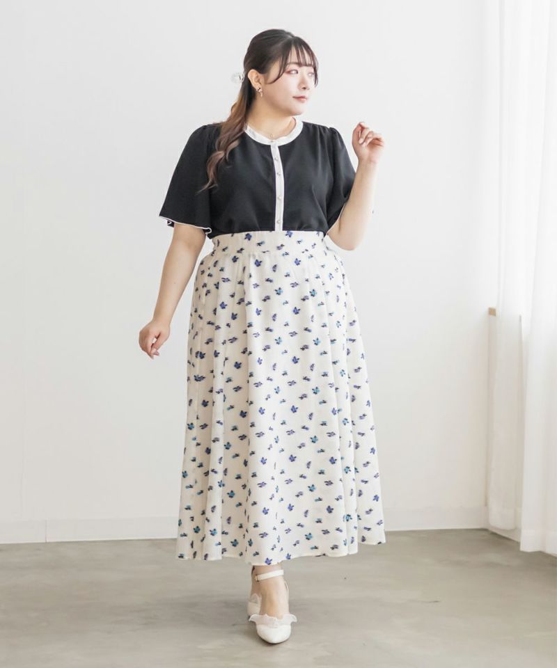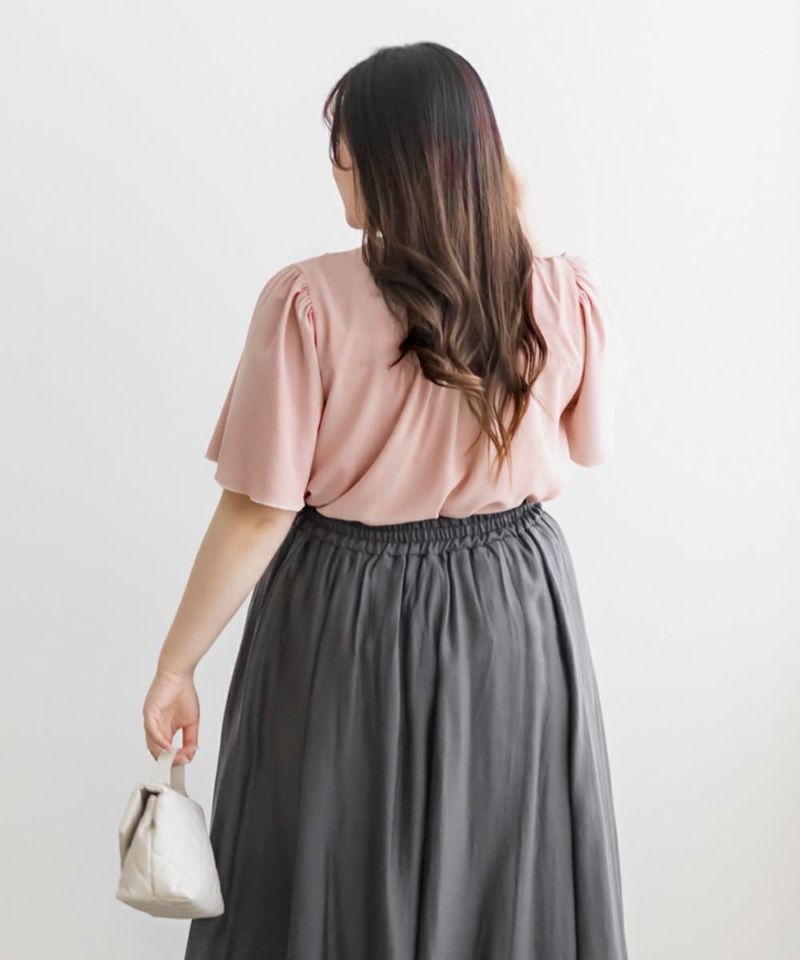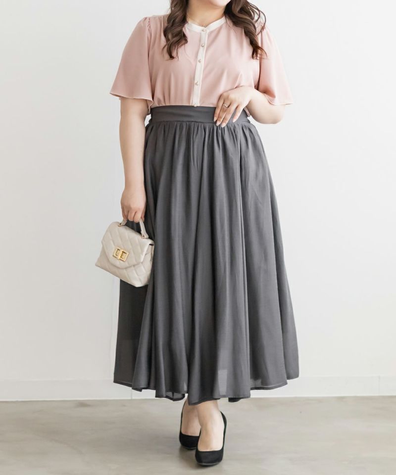 3Lサイズを着用してちょうどいいサイズ感でした。袖回りなどフレアなシルエットで窮屈感なく着用できました◎さらりとした肌ざわりなので着心地も良かったです。バイカラーデザインが目を惹く上品なブラウスで、フレア袖が気になる二の腕をカバーしてくれます!パンツにもスカートにも合わせやすく色々なシーンで着回しできそうです!