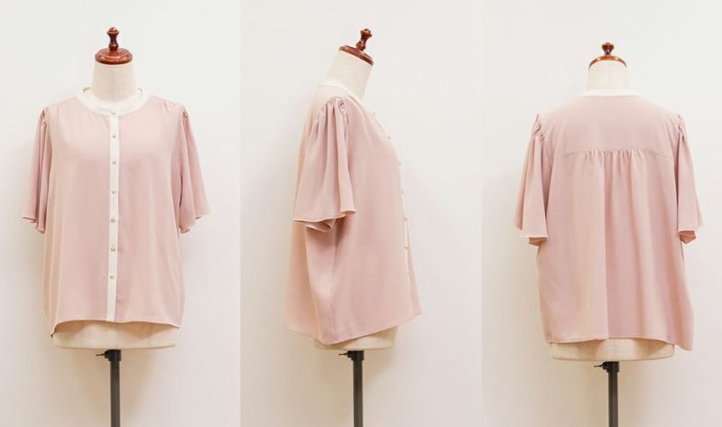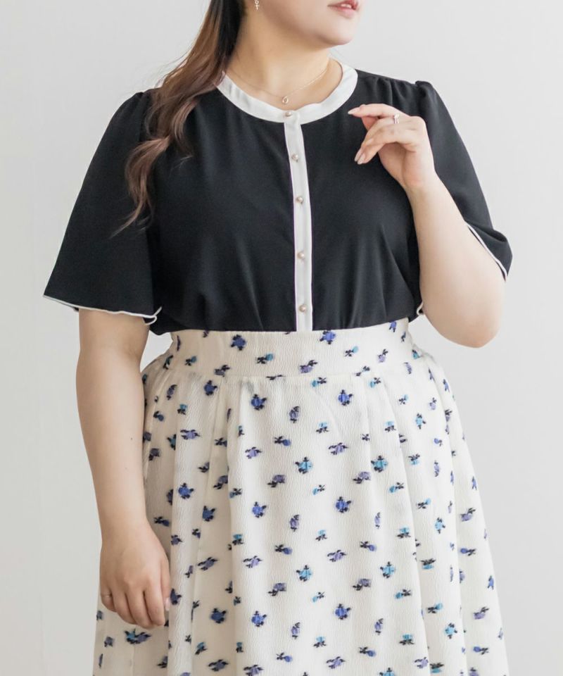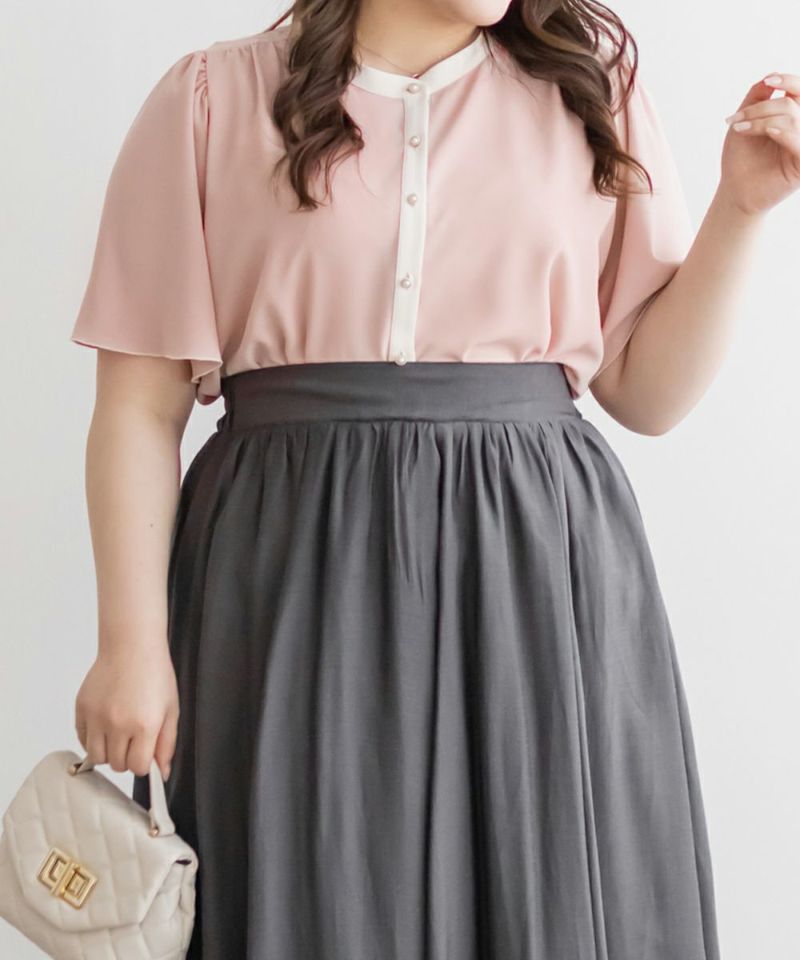 バイカラー フレア袖 ブラウス パールボタン ギャザー 大きいサイズ クレット プラスサイズ 3L 4L バイカラーフレア袖ブラウス