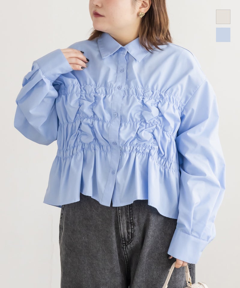 3Lサイズを着用しました。身幅や腕まわりにしっかりゆとりがありました!フロントのシャーリングデザインが立体感を生み、自然とメリハリのあるシルエットに見せてくれます。気になるお腹まわりをさりげなくカバーしてくれるのも嬉しいポイント♪デニムパンツでカジュアルにも、スカート合わせでフェミニンにも着られる、幅広いシーンで活躍してくれそうなブラウスだと思いました◎