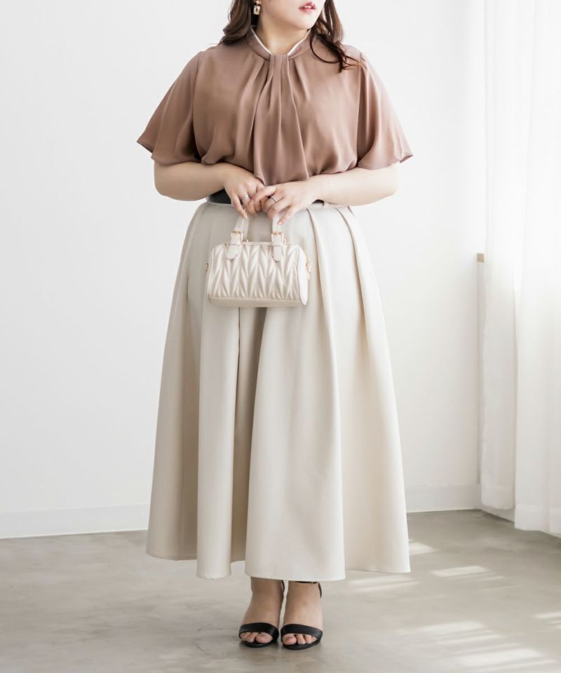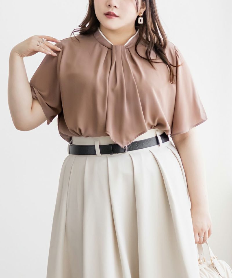 3Lサイズを着用して、ちょうどいいサイズ感でした。タイ付きで上品な印象のブラウスです!さらさらした柔らかい生地で、涼しく着用出来ました!ふわっと広がる袖口が女性らしくフェミニンな雰囲気です♪細身のテーパードパンツやスラックスを合わせてオフィスシーンにもお勧めです!