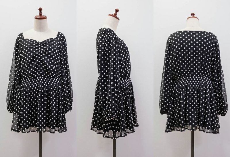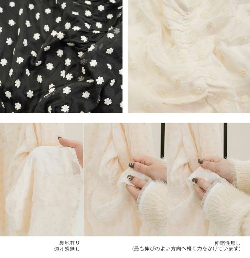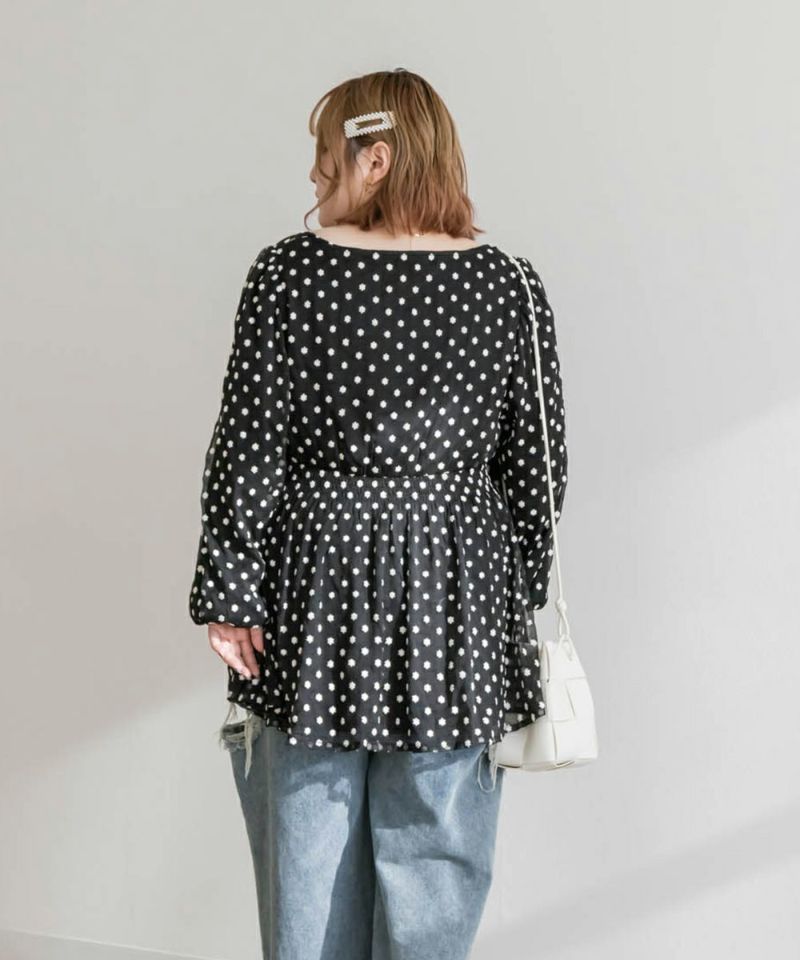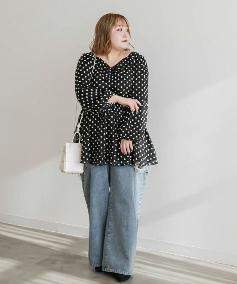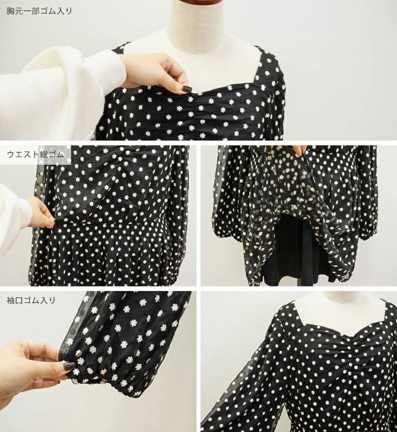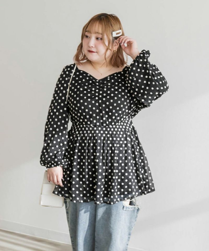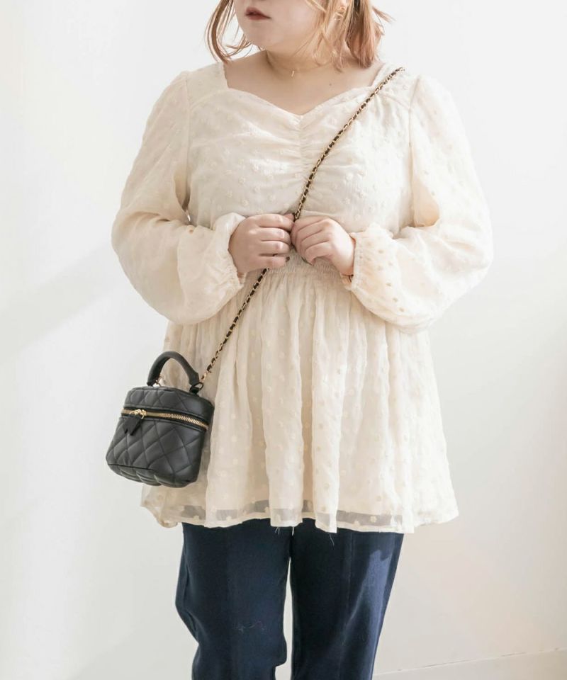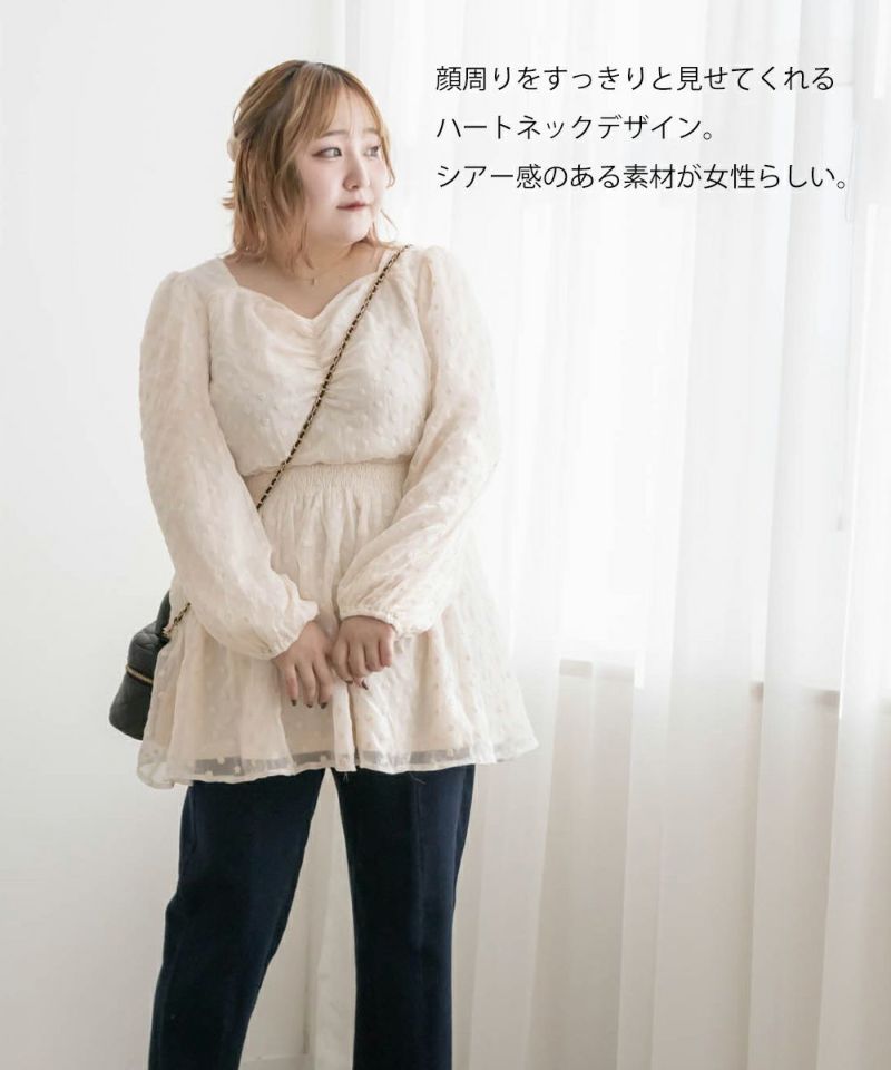 LLを着て程よいサイズ感でした。バストやヒップ回りは余裕があって、ウエストは柔らかいシャーリングになっているから窮屈感の無なく着られました♪らくちんだけど、メリハリのあるペプラムシルエットだから気になる部分は隠しつつ女性らしい印象に着こなせます!生地自体は透け感があるのですが全面に伸縮性のある裏地がついているのでインナーの心配もなく着心地も抜群です!胸元のデザインや刺繍柄が女性らしく大人っぽくなれて、シンプルなボトムに合わせるだけで可愛くコーディネートできます!