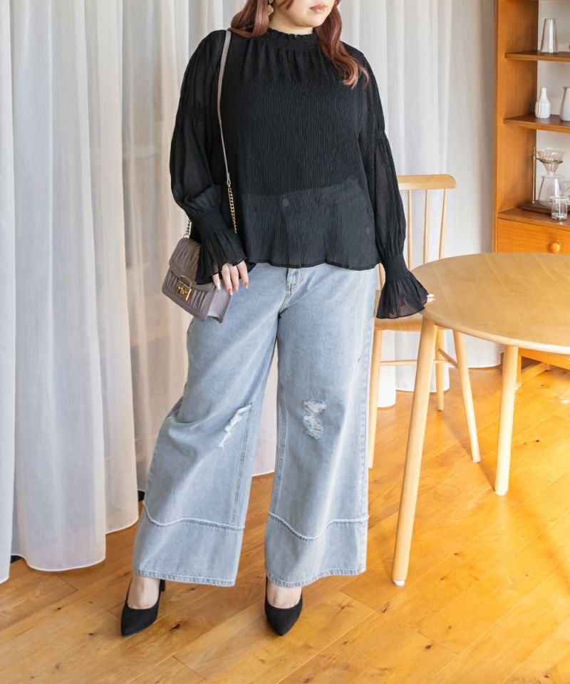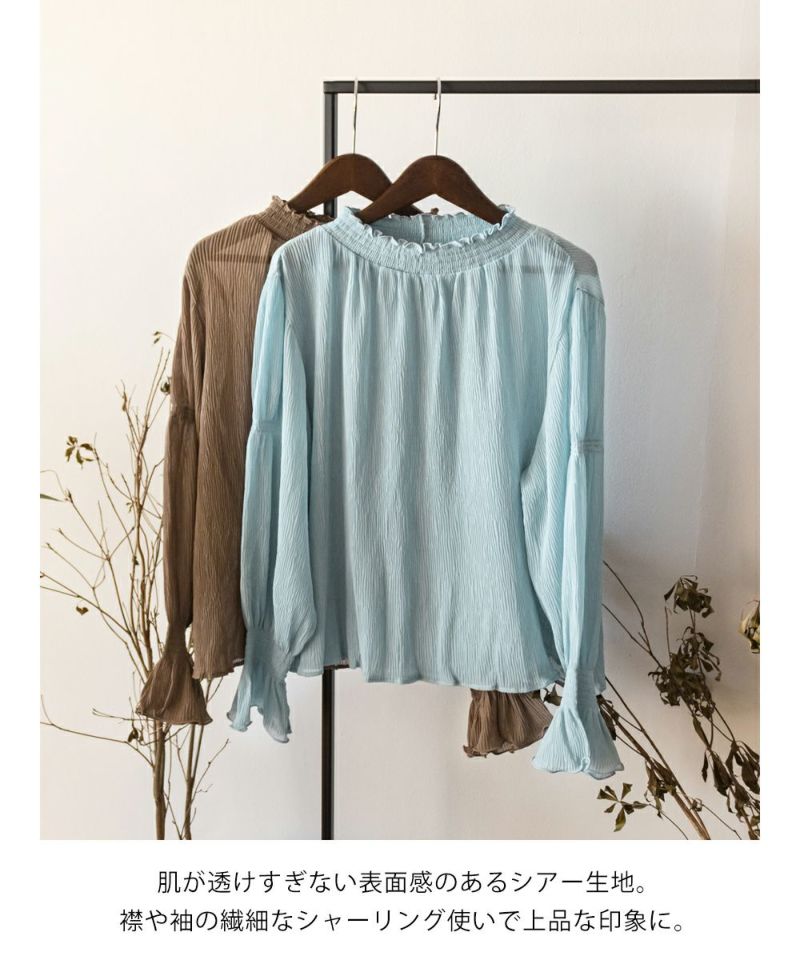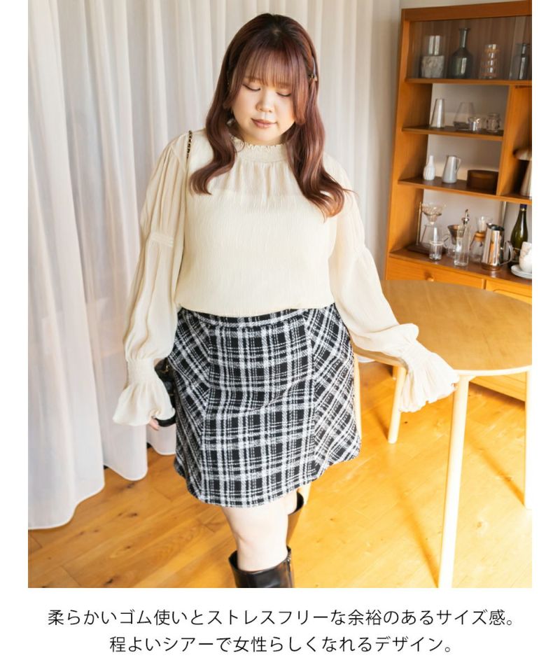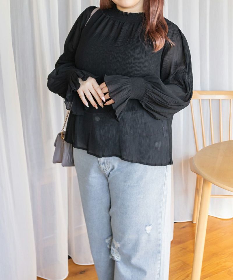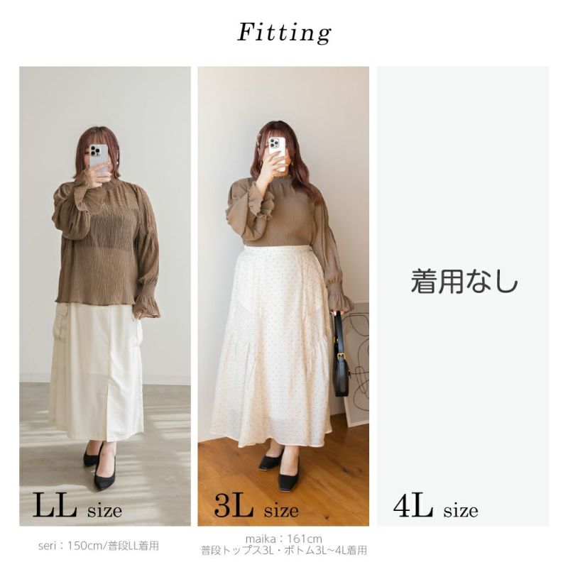 3Lを着て首も窮屈感なく、ゆとりをもって着ることができました。ゆったりとしたシルエットのプリーツのような表面感のあるシアー素材だから肌の透け感を気にせずに着ることができました◎いやらしさのない上品な雰囲気で、ネックや袖の繊細なシャーリングがとっても女性らしいです♪腕まくりしても可愛いシルエットに変化できます!袖口のフレアが手元を美しく見せてくれるのもポイント◎主役のトップスとしても、ワンピースのインナー使いとしても活躍できます。ほぼオールシーズン使える、1枚あると便利なアイテムです!