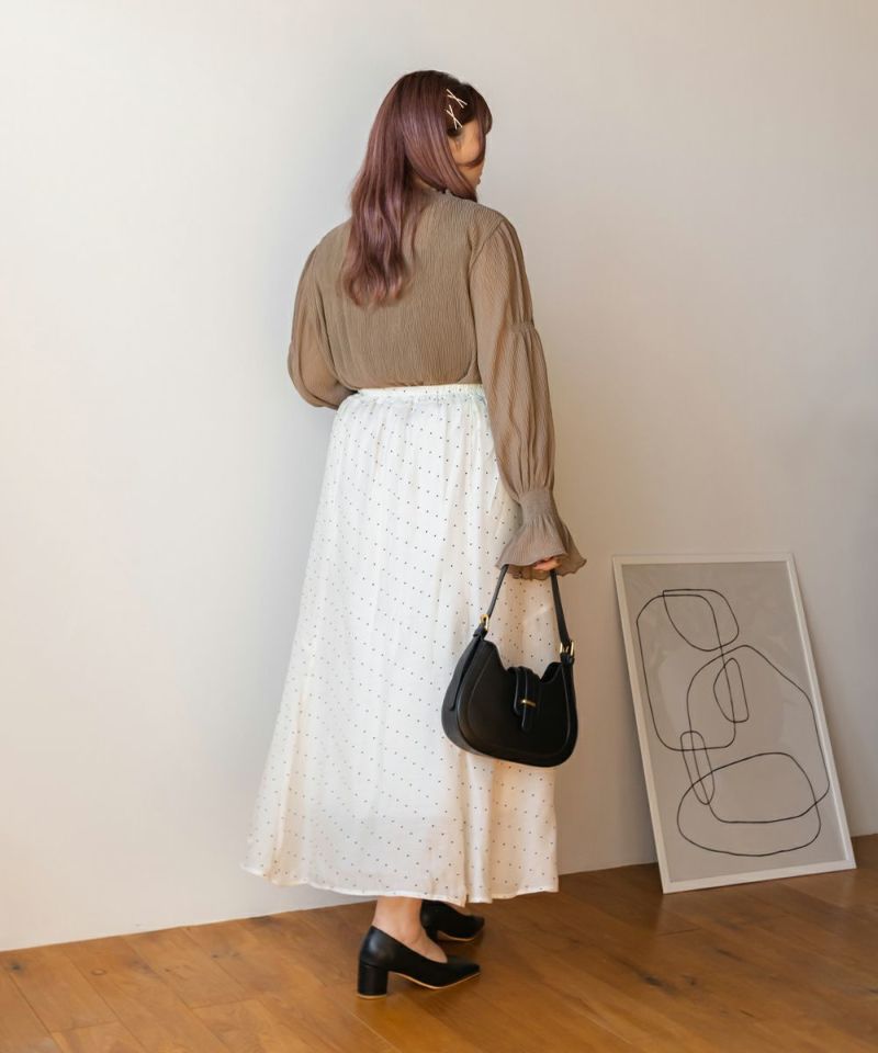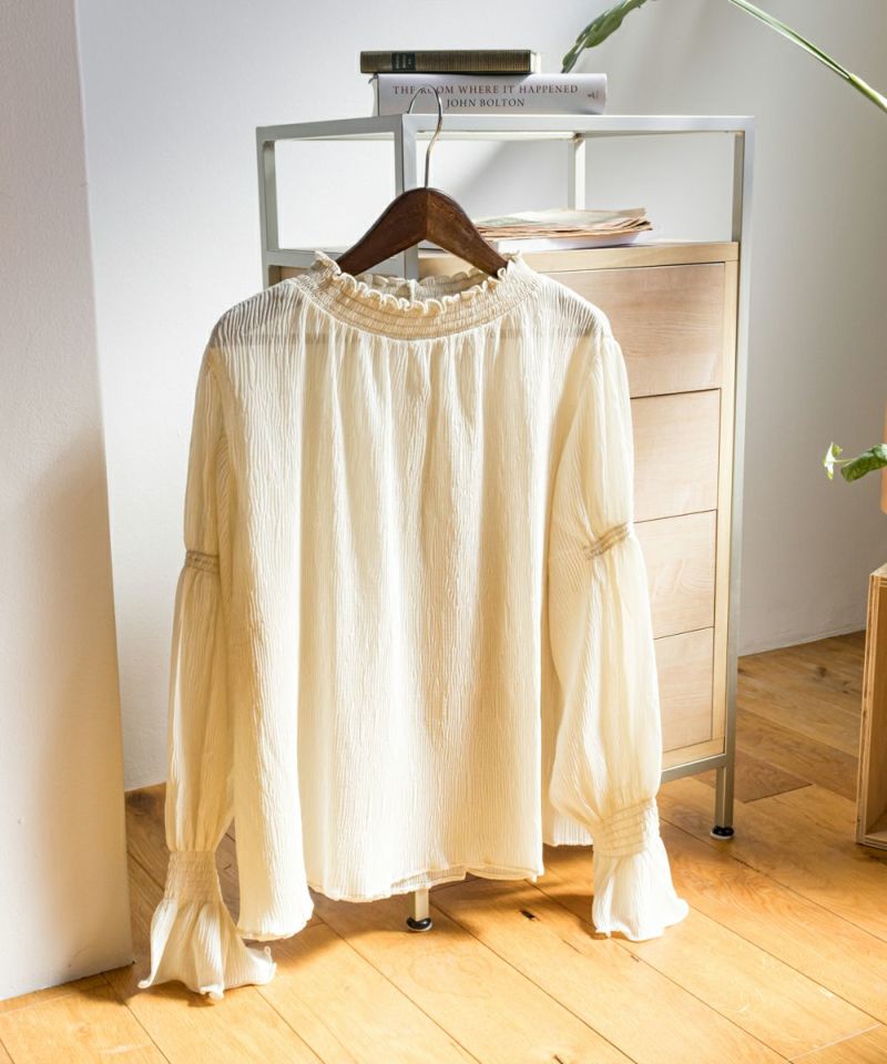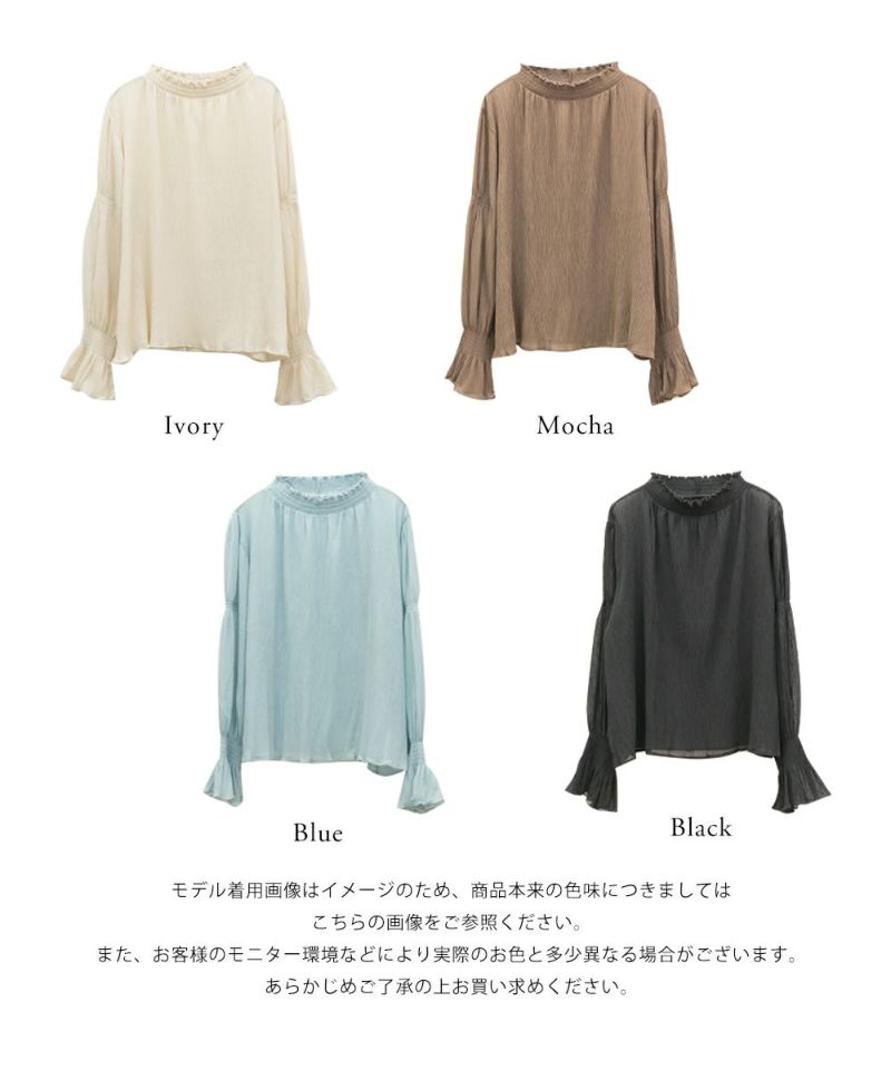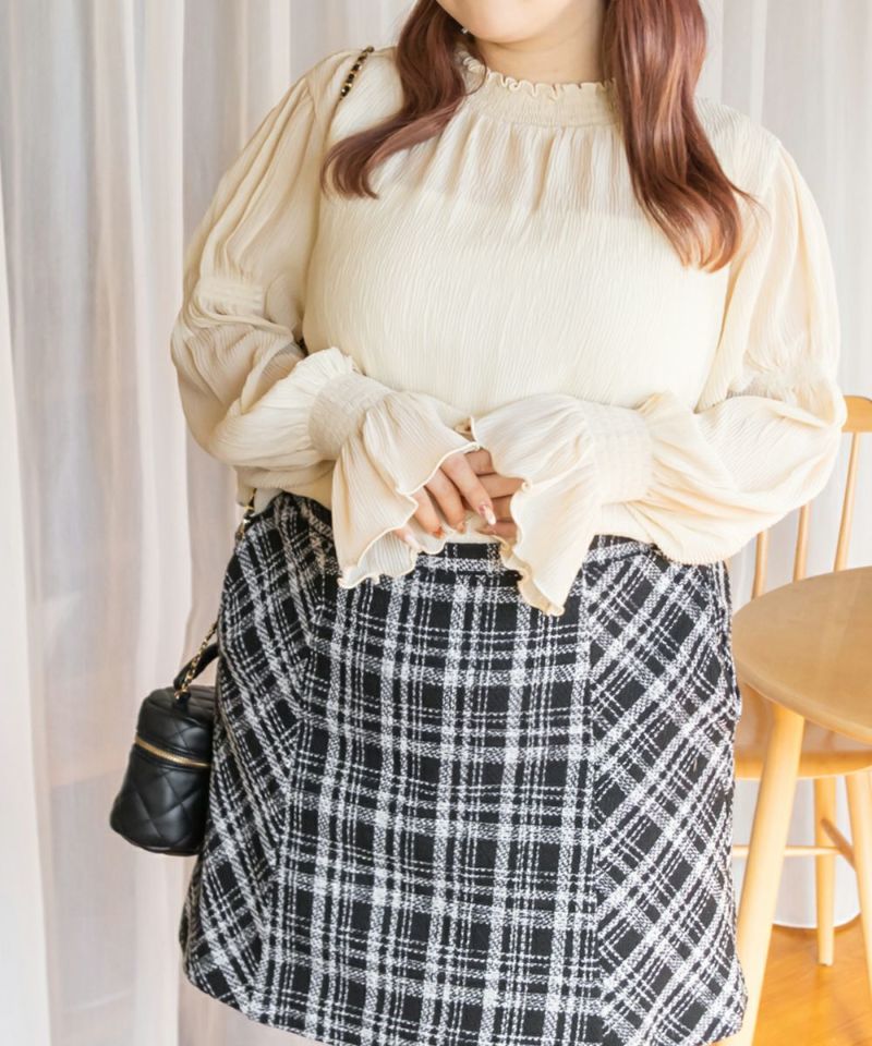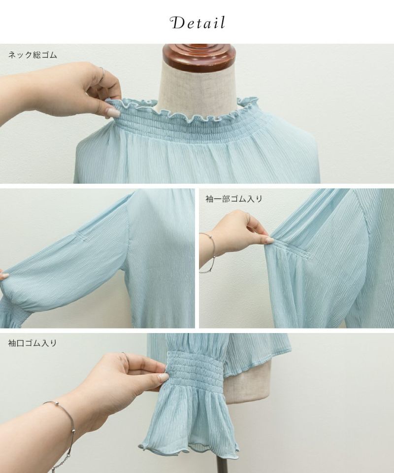 3Lを着て首も窮屈感なく、ゆとりをもって着ることができました。ゆったりとしたシルエットのプリーツのような表面感のあるシアー素材だから肌の透け感を気にせずに着ることができました◎いやらしさのない上品な雰囲気で、ネックや袖の繊細なシャーリングがとっても女性らしいです♪腕まくりしても可愛いシルエットに変化できます!袖口のフレアが手元を美しく見せてくれるのもポイント◎主役のトップスとしても、ワンピースのインナー使いとしても活躍できます。ほぼオールシーズン使える、1枚あると便利なアイテムです!