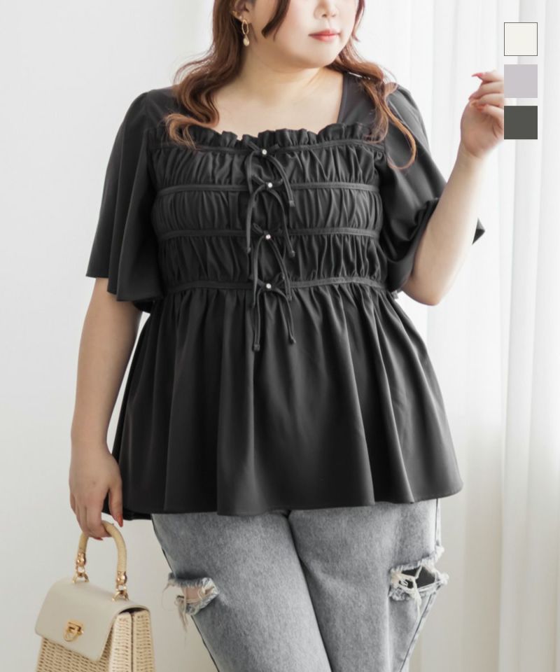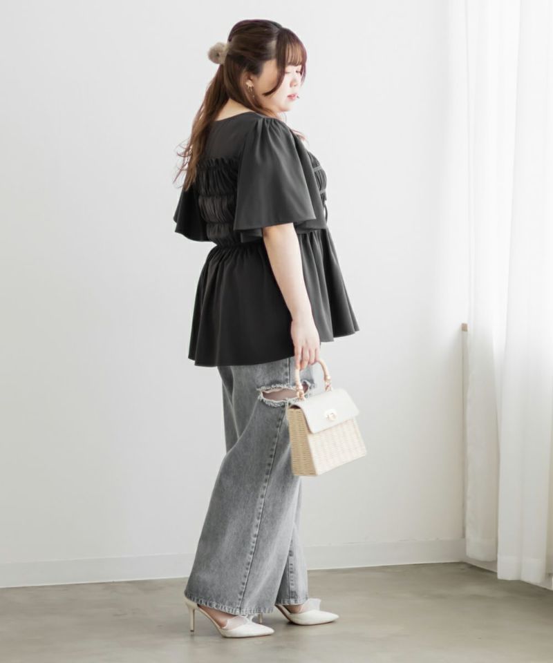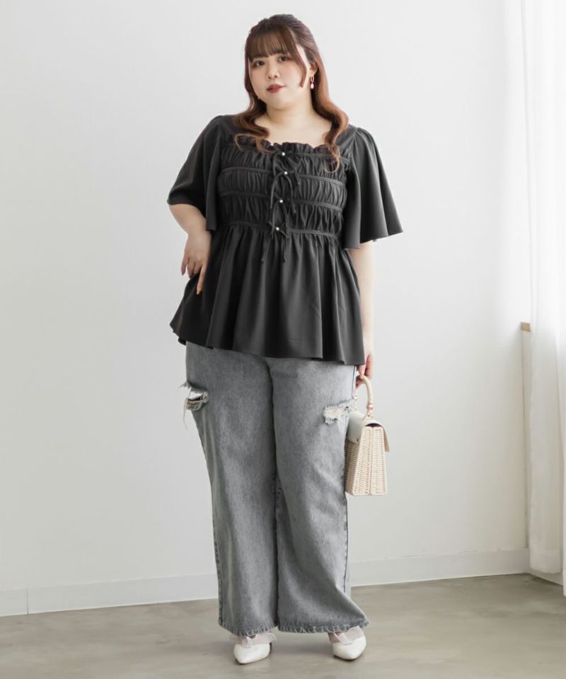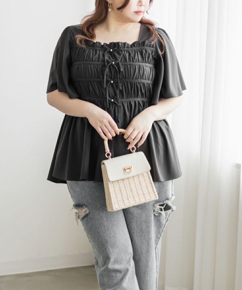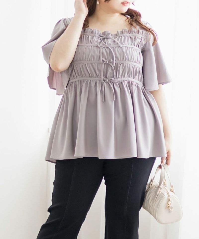 3Lサイズを着用して、ちょうどいいサイズ感で着ることができました◎バストからウエストまではシャーリングゴムでボディラインをカバーしながらフィット感があり着やせできるデザインでした。フロントのリボンにはビジューもついていてガーリーながら高級感のある上品な雰囲気に。ふわっと軽やかな生地感で肌なじみもよく、暑い時期でもさらっと快適に着られそうです♪リボンは甘すぎず、さりげないポイントになっているので、大人っぽさをキープしながら可愛さも楽しめるデザインです。袖も程よくゆったりしていて、二の腕を自然にカバーしてくれるのが嬉しいポイント◎デニムやワイドパンツと合わせてカジュアルに、きれいめなボトムと合わせればお仕事などにもぴったりな万能ブラウスです!