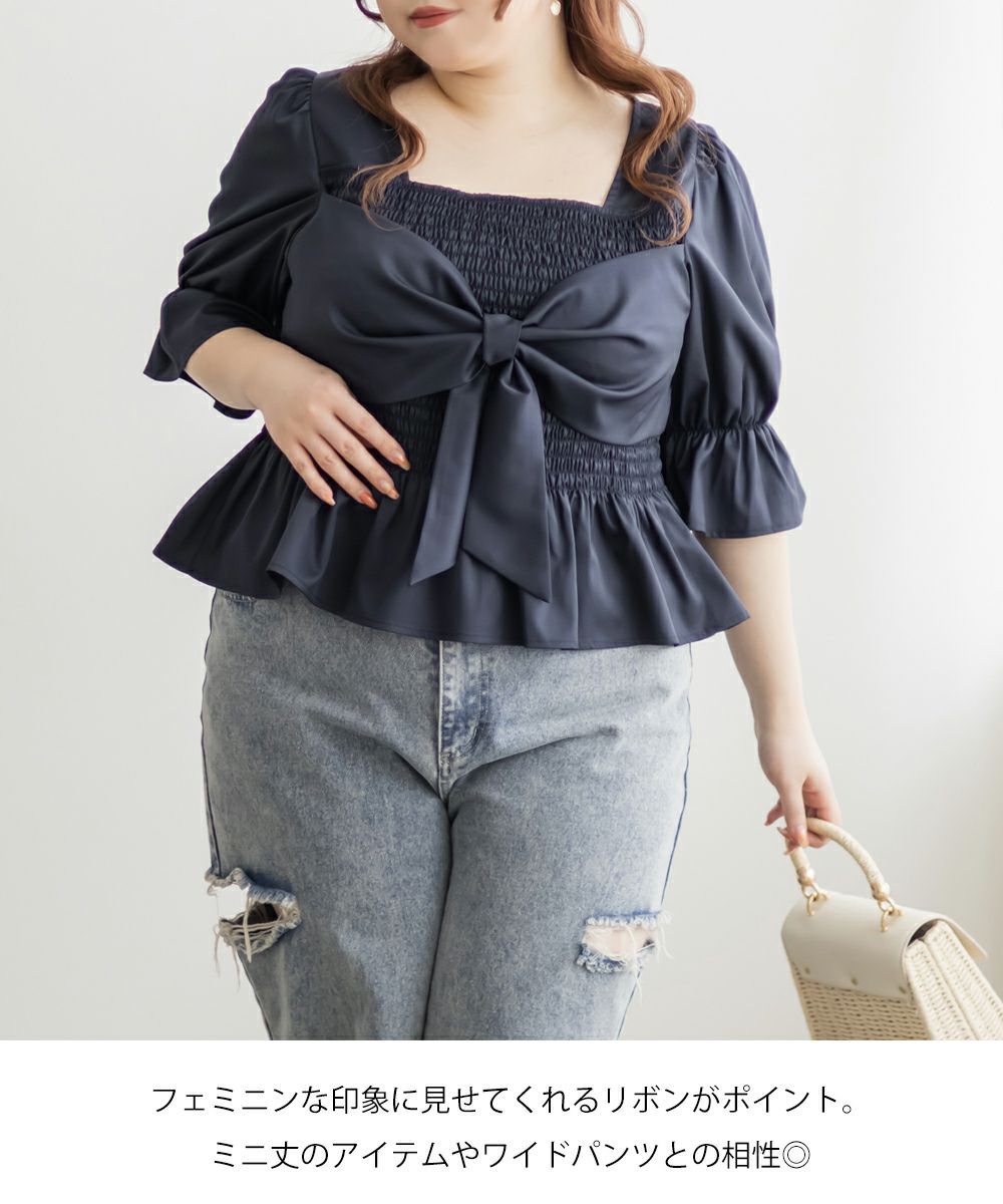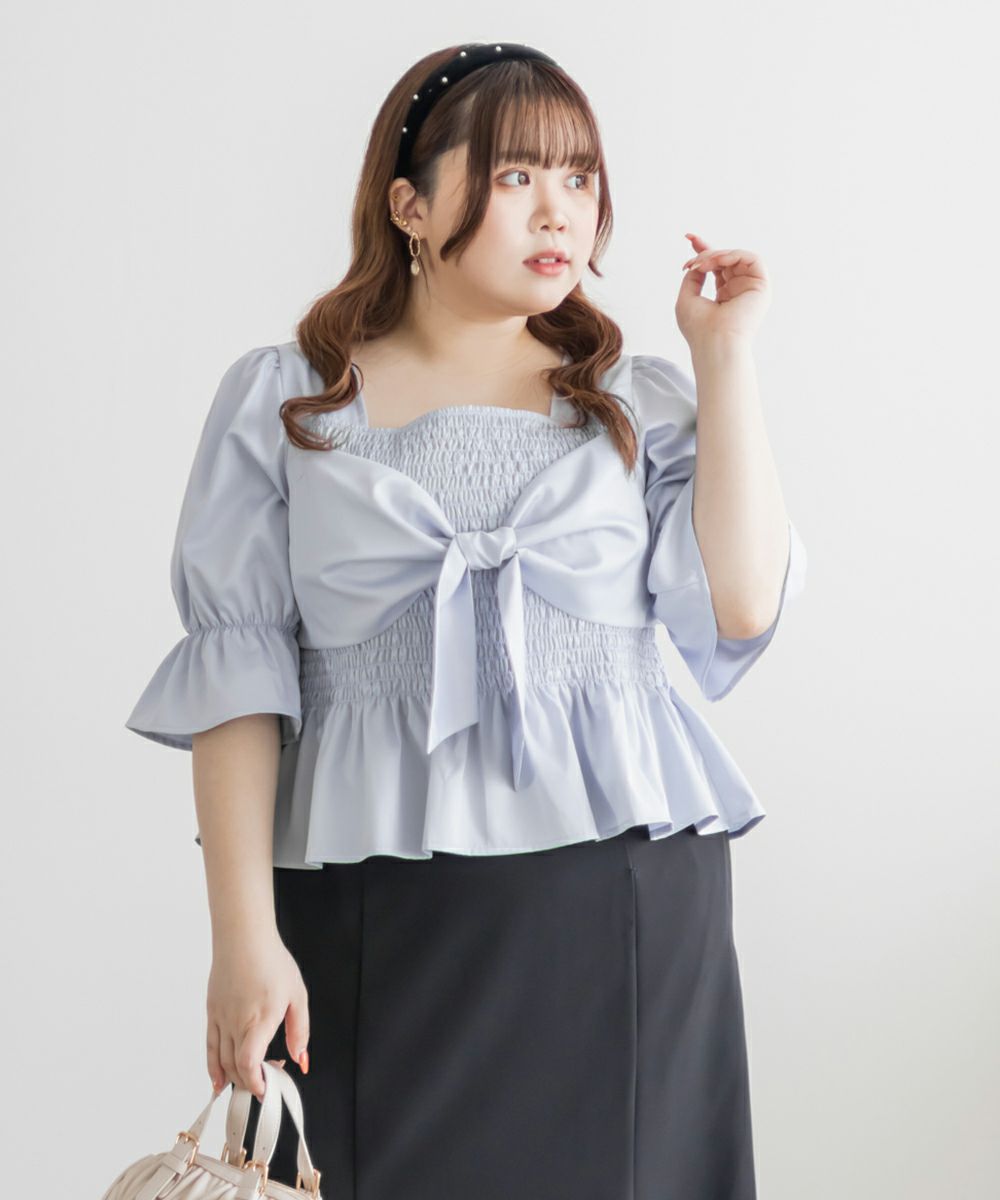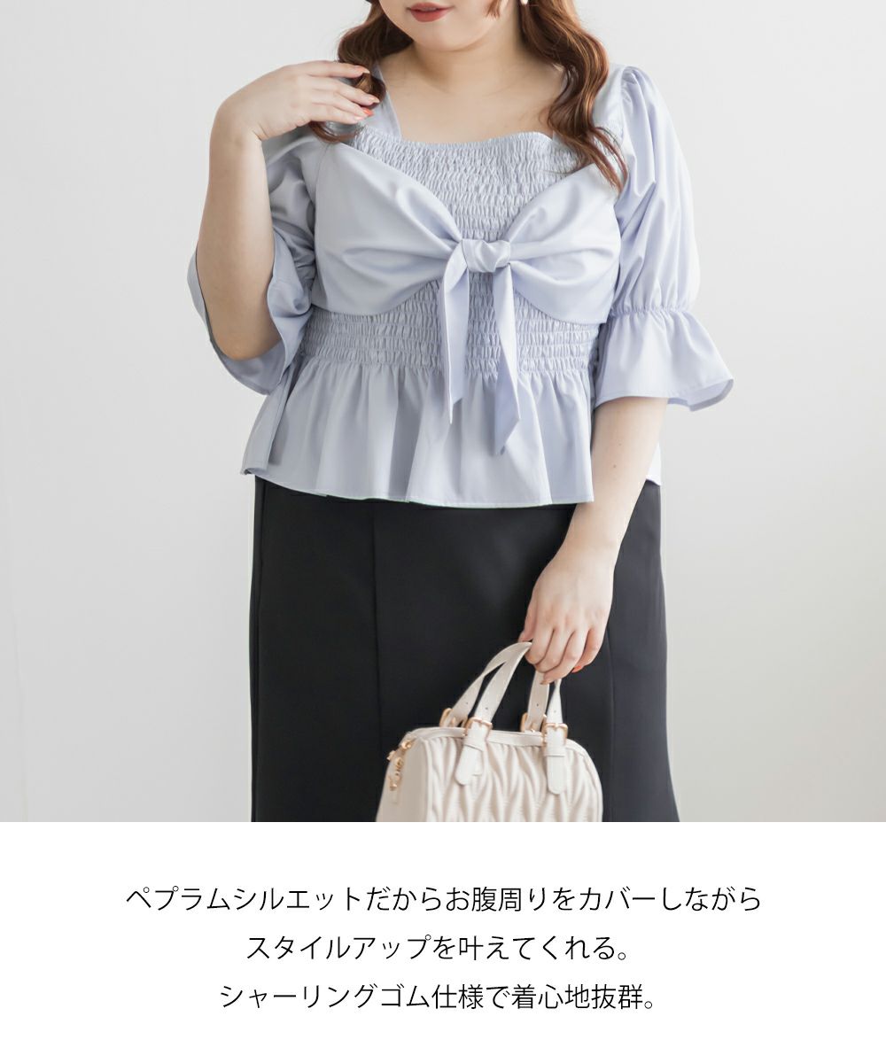 3Lサイズを着用しましたが、ぴったりちょうどいいサイズ感でした◎全体にたっぷりとシャーリングが入っているので、体のラインを拾いにくく、自然と着痩せして見えるシルエットが叶います。素材は軽やかな光沢のある布帛生地で長時間着ていてもストレスなく過ごせそうです♪胸元の大きいリボンデザインがアクセントになっていて、甘さがありながらも生地の光沢感でどこか上品な印象に。袖はふんわりとしたシルエットで、肘も二の腕もさりげなくカバーしてくれました。デニムを合わせたカジュアルスタイルはもちろん、きれいめなスカートと合わせれば、お仕事にもぴったりです!1枚で華やかさをプラスできるので、ワードローブに加えておきたいアイテムです◎