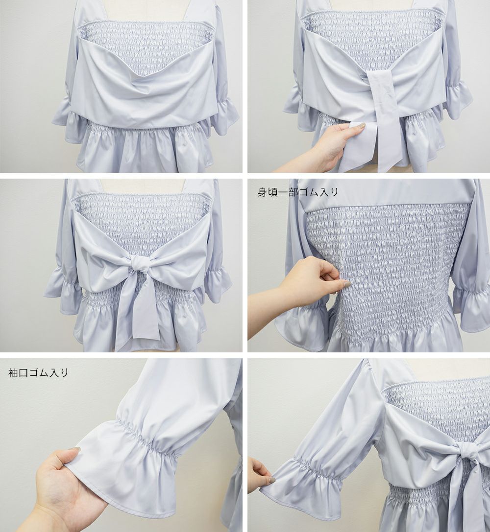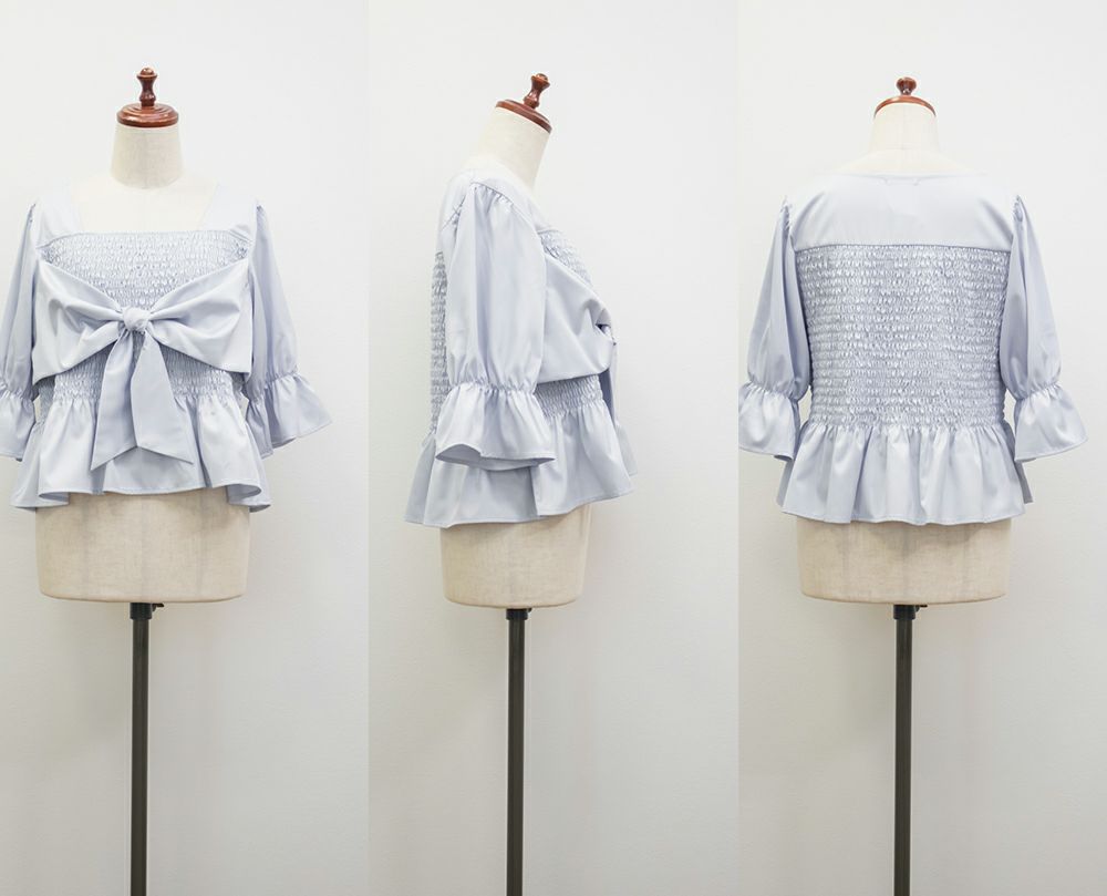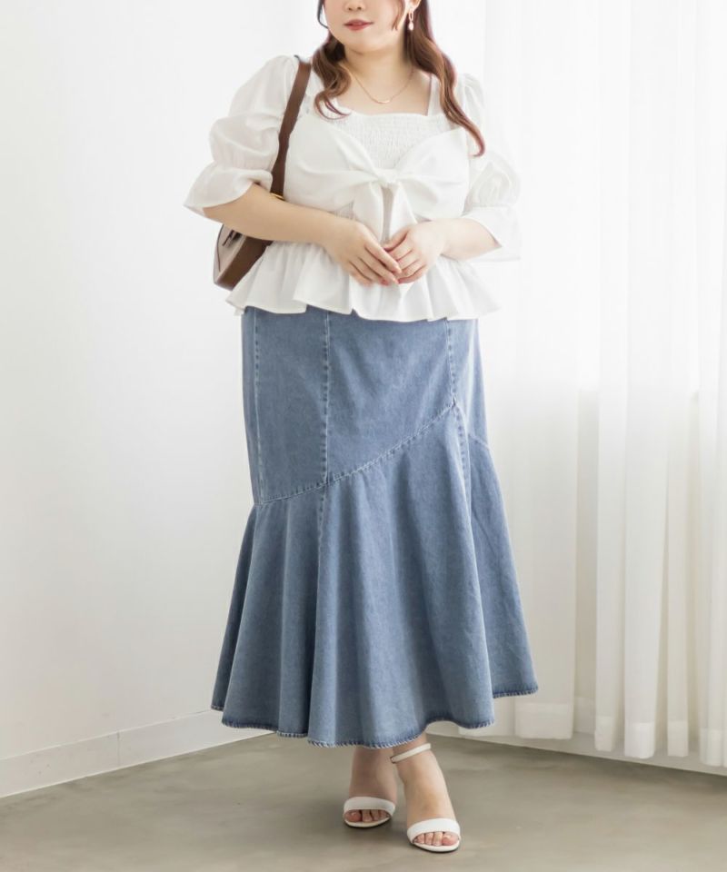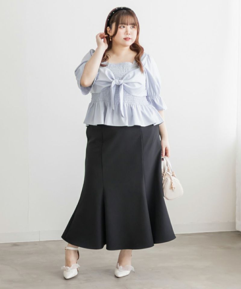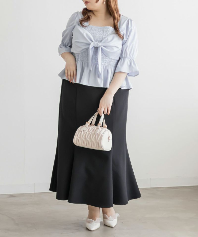 3Lサイズを着用しましたが、ぴったりちょうどいいサイズ感でした◎全体にたっぷりとシャーリングが入っているので、体のラインを拾いにくく、自然と着痩せして見えるシルエットが叶います。素材は軽やかな光沢のある布帛生地で長時間着ていてもストレスなく過ごせそうです♪胸元の大きいリボンデザインがアクセントになっていて、甘さがありながらも生地の光沢感でどこか上品な印象に。袖はふんわりとしたシルエットで、肘も二の腕もさりげなくカバーしてくれました。デニムを合わせたカジュアルスタイルはもちろん、きれいめなスカートと合わせれば、お仕事にもぴったりです!1枚で華やかさをプラスできるので、ワードローブに加えておきたいアイテムです◎