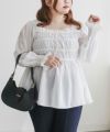 3Lサイズを着用して、ちょうどいいサイズ感で着ることができました◎バストからウエストまではシャーリングゴムでボディラインをカバーしながらフィット感があり着やせできるデザインでした。フロントのリボンにはビジューもついていてガーリーながら高級感のある上品な雰囲気に。ふわっと軽やかな生地感で肌なじみもよく、さらっと快適に着られそうです♪リボンは甘すぎず、さりげないポイントになっているので、大人っぽさをキープしながら可愛さも楽しめるデザインです。袖も程よくゆったりしていて、二の腕を自然にカバーしてくれるのが嬉しいポイント。デニムやワイドパンツと合わせてカジュアルに、きれいめなボトムと合わせればお仕事などにもぴったりな万能ブラウスです!