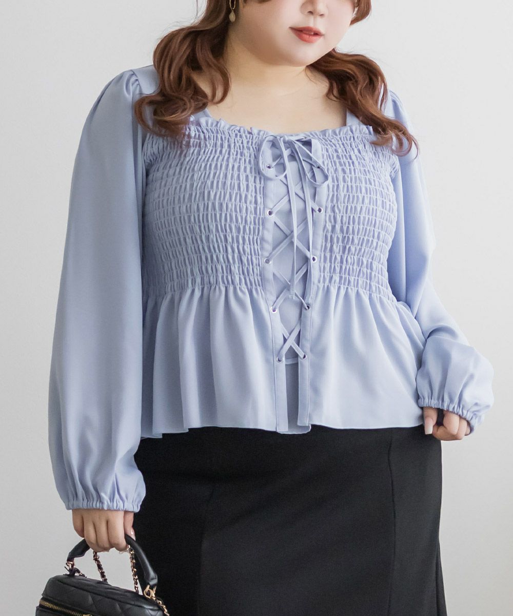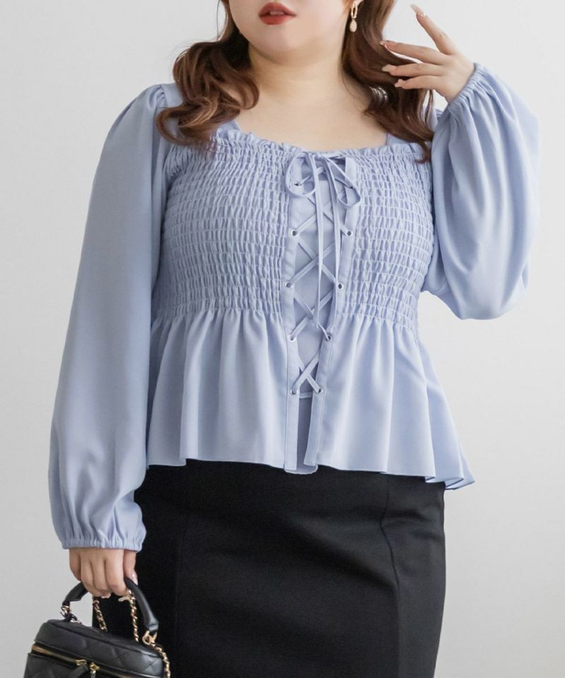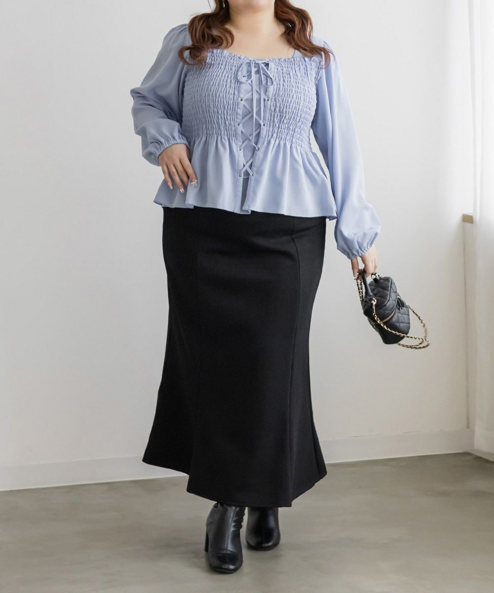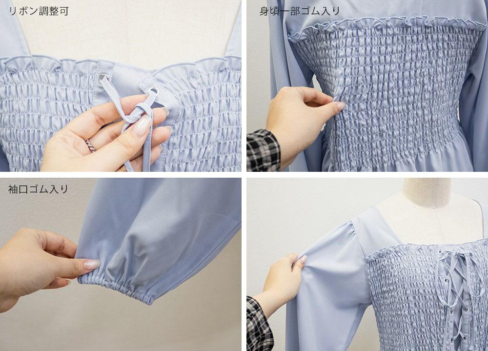 フロントのレースアップデザインが目線を上に集めてくれて、顔まわりも華やかな印象に♪ ふんわり広がるシルエットでお腹まわりや腰まわりもしっかりカバーできました。