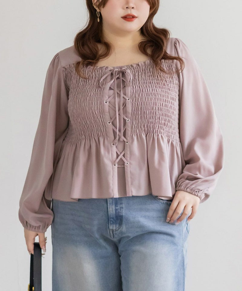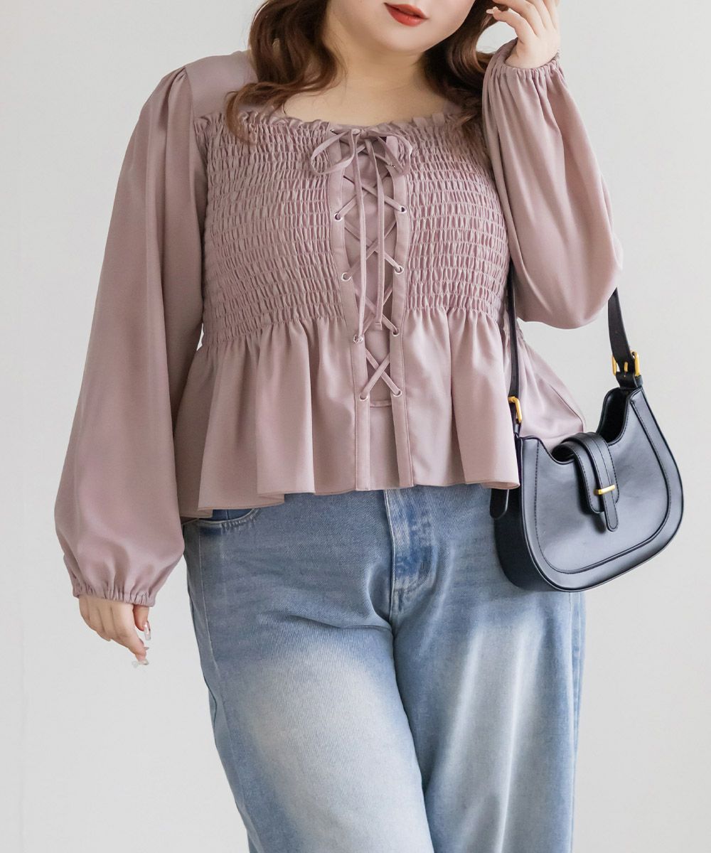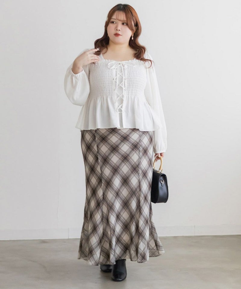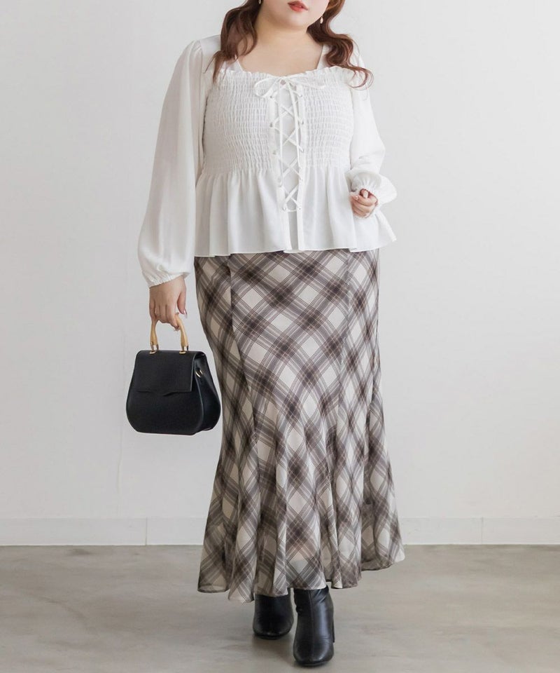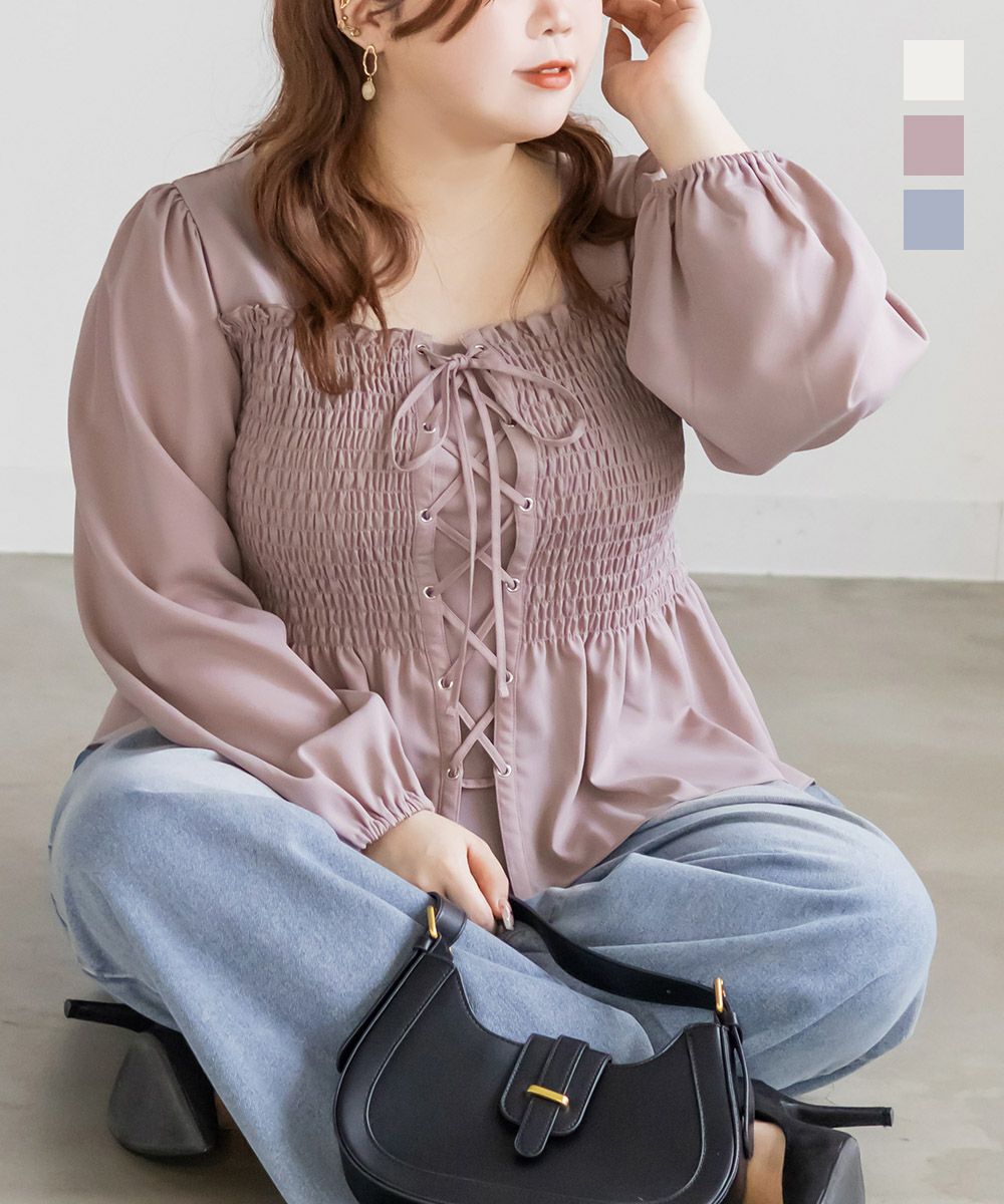 フロントのレースアップデザインが目線を上に集めてくれて、顔まわりも華やかな印象に♪ ふんわり広がるシルエットでお腹まわりや腰まわりもしっかりカバーできました。