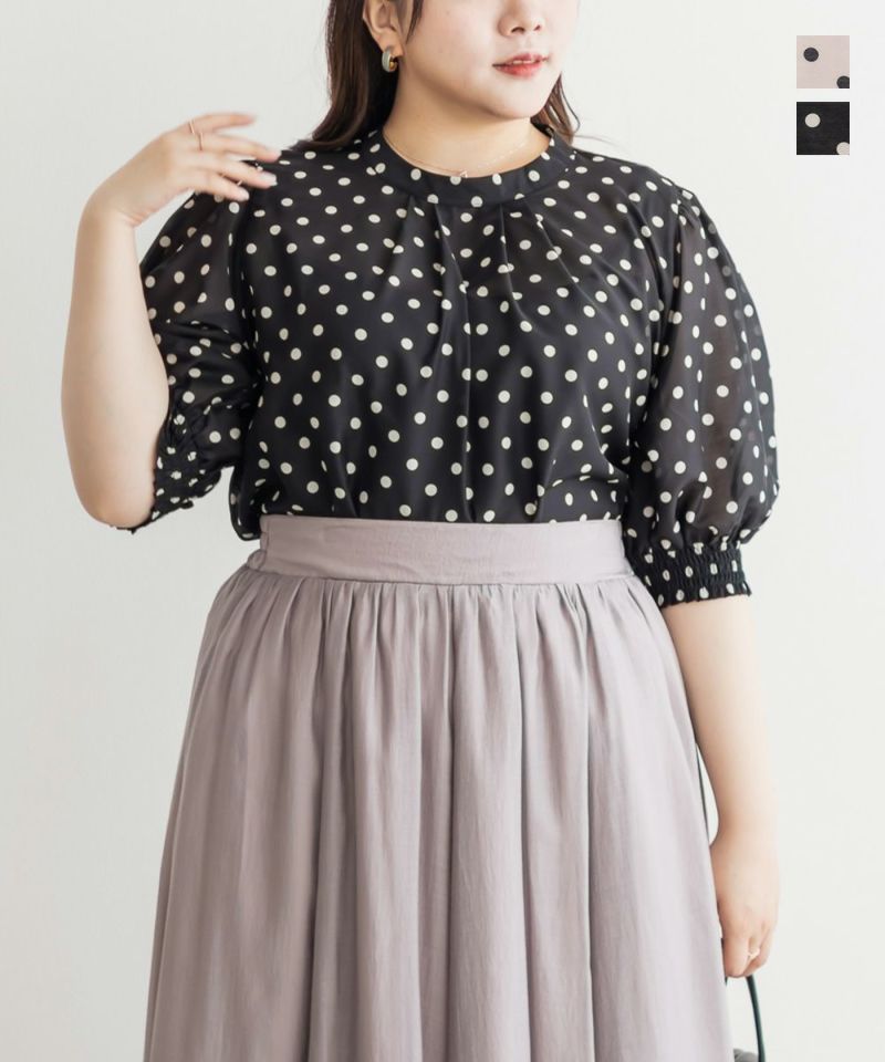 3Lサイズを着用して、ぴったりのサイズ感でした。窮屈感は特に感じなかったのでいつも通りのサイズ選びで問題なさそうです!袖口はシャーリングになっているのと、気になる二の腕はすっぽり覆ってくれるのが嬉しい◎プチハイのネックラインとドットと合わさってよりガーリーフェミニンな印象になります◎少し透け感のある生地でなのが春夏らしくて涼しく着用出来ます!ワンピースやスカートと相性抜群で、お出かけやデートにおすすめです!デニムとドットの相性も良く、カジュアル派さんにもおすすめの1枚です♪