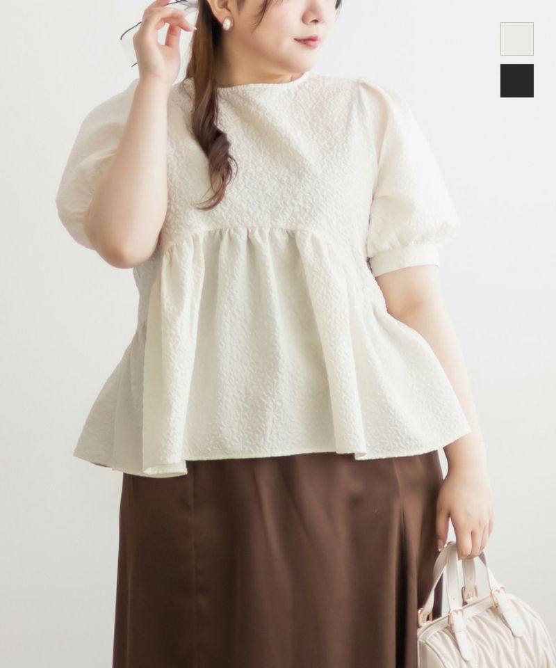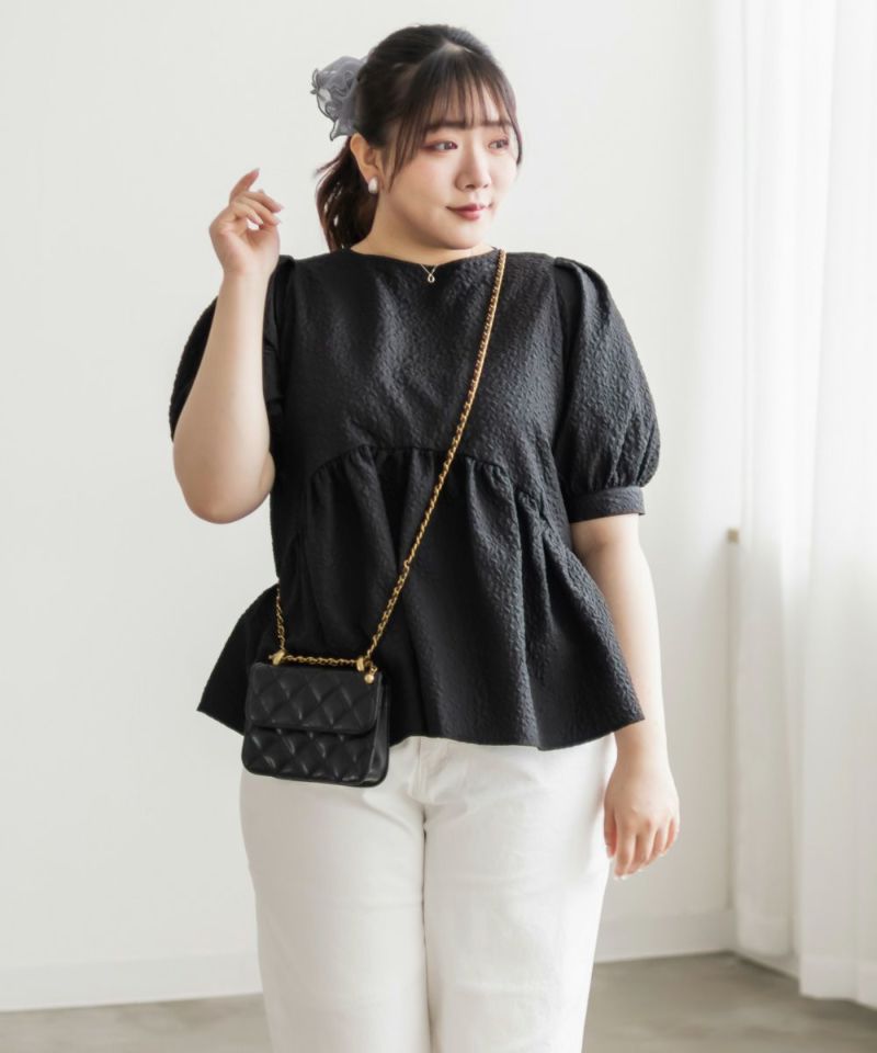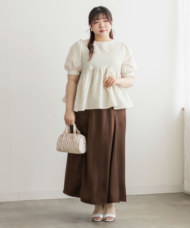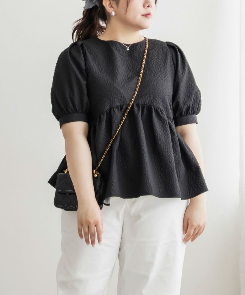 3Lサイズを着用してぴったりのサイズ感でした。ゴムのない仕様なので心配な方はバストや袖口などのサイズ確認をお勧めします!お腹やお尻をカバーしてくれるシルエットでとっても着やせして見えました◎パンツやすっきりとしたシルエットのスカートと合わせるとバランスよくまとまります!合わせるボトムや小物によって、大人っぽいスタイルにもフェミニンなスタイルにもなれる可愛いブラウスです♪