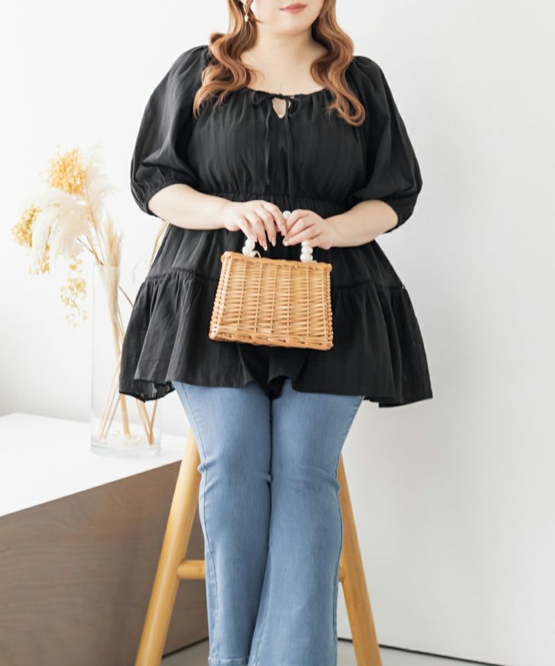 3Lを着用して、ちょうどいい着心地でした。いつもどおりのサイズ選びで問題なさそうです。ウエストや襟ぐりはゴムが入っていて、窮屈感も無く着られました!肩を落としてオフショルにもなる2WAYデザインで、ゴム入りだからずり落ちてしまう心配もなさそう♪ゆるっとしたサイズ選びよりジャストサイズでのサイズ選びをお勧めします◎お尻まですっぽり隠れる着丈なのも着やせ出来て嬉しいです。繊細なレース生地が今っぽくて、袖以外裏地もついているので透ける心配もなく安心して着られました。春~夏大活躍するブラウスなので、お出かけやデート・旅行にもおすすめの1枚です!