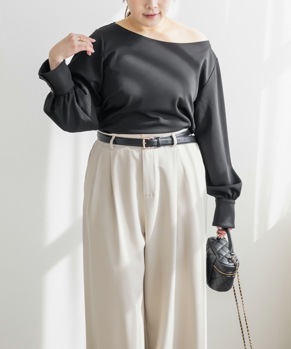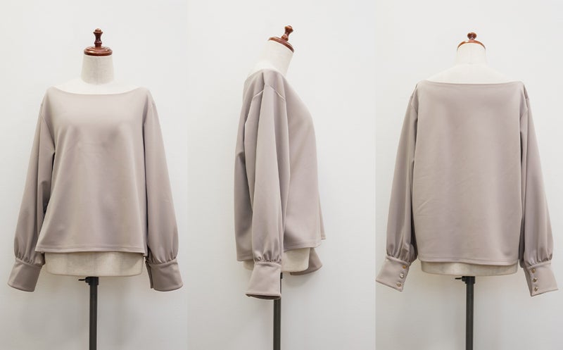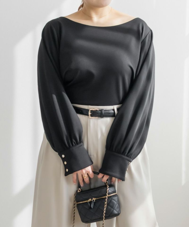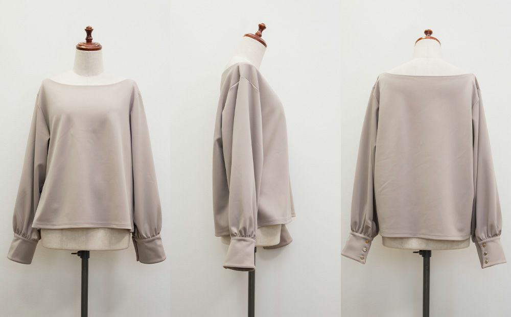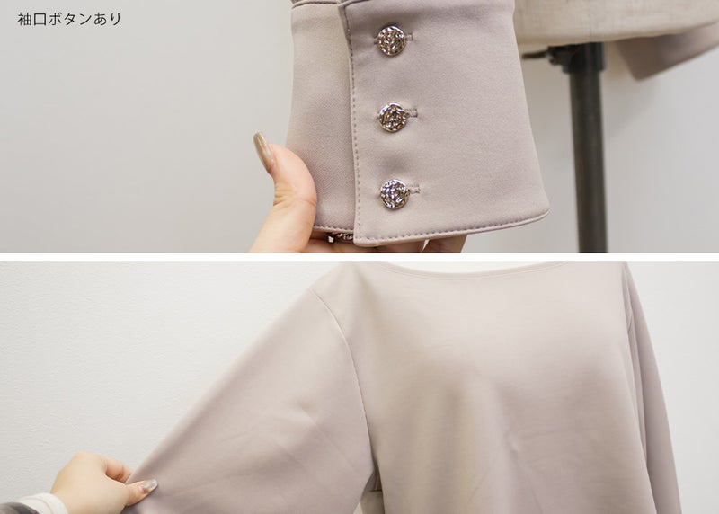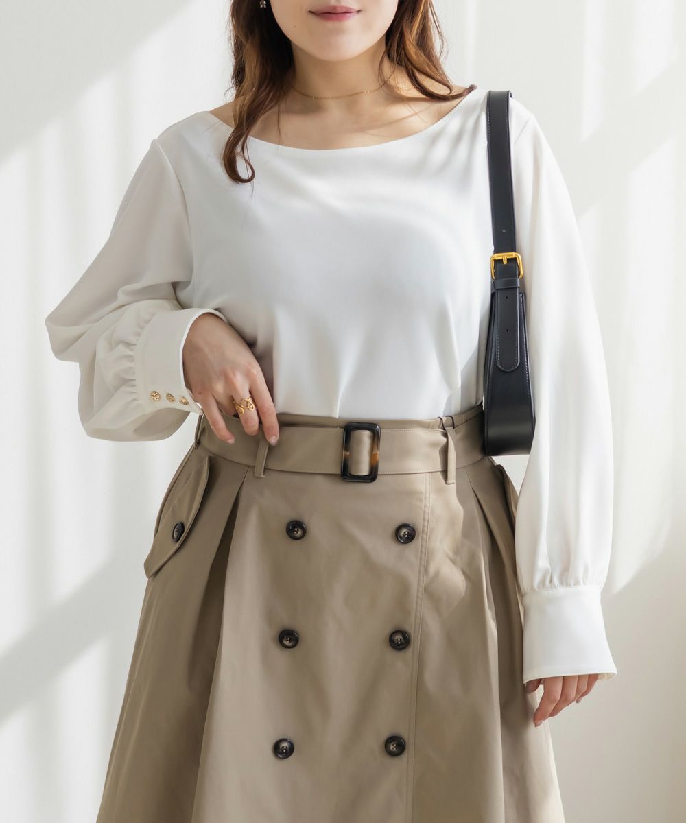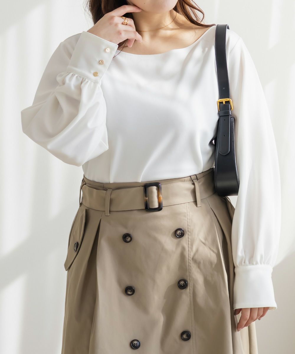 3Lサイズを着用して、ちょうどよくいつも通りのサイズ選びで問題なさそうでした。生地に伸縮性があって、程よくフィットしながらも窮屈さがなく、ちょうどいい着心地です♪ ボートネックの開きがデコルテをきれいに見せてくれ、片側だけ肩を落として着てもラインがきれいに決まり、今年っぽい抜け感が簡単に出せます◎ 袖のゴールドボタンが上品で、シンプルなボトムに合わせても華やかさがプラスされるのが嬉しいです!オンオフ問わず使いやすいので、ジャケットのインナーなどにも重宝しそうです!シーズンレスで使えるさらっとした生地感も魅力です。