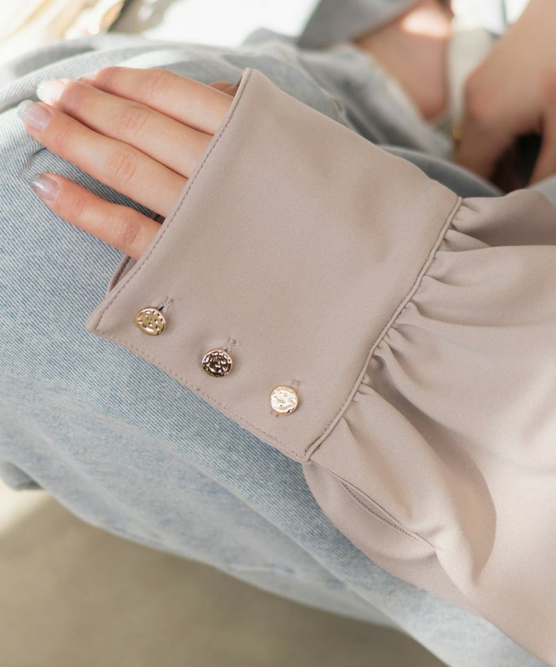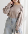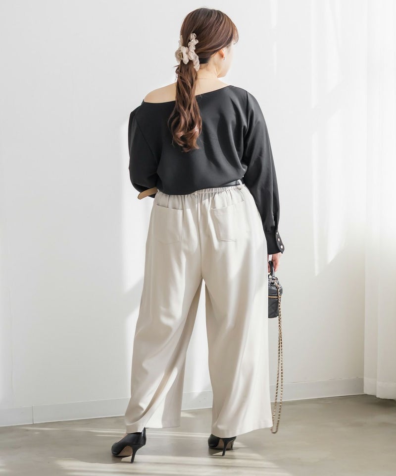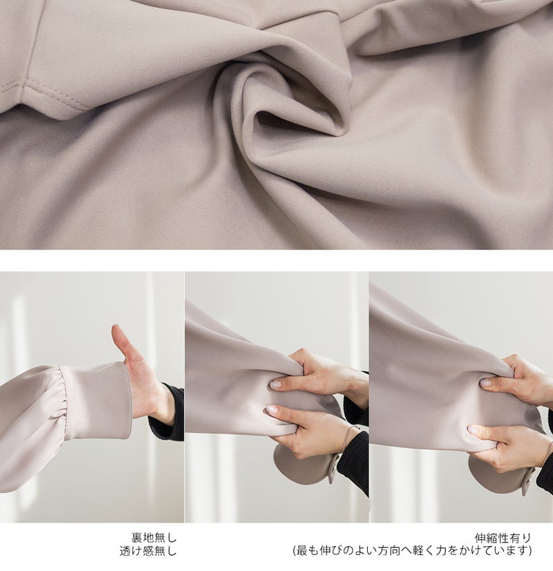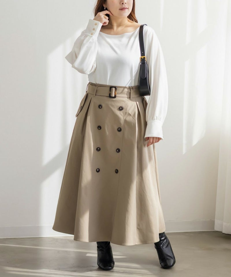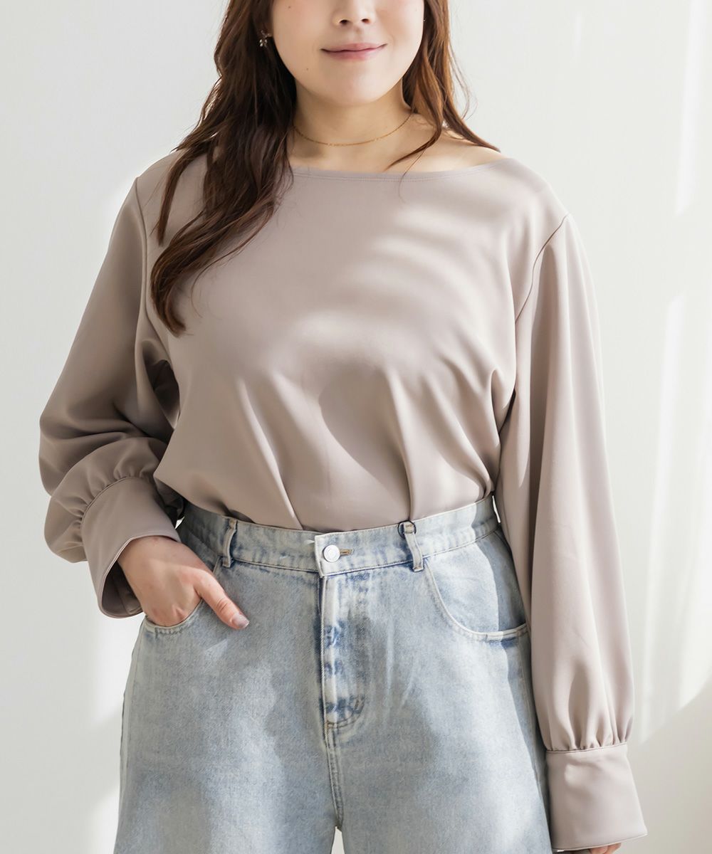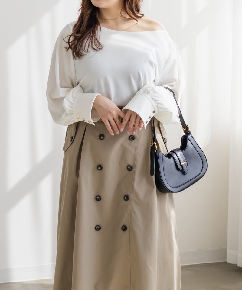 3Lサイズを着用して、ちょうどよくいつも通りのサイズ選びで問題なさそうでした。生地に伸縮性があって、程よくフィットしながらも窮屈さがなく、ちょうどいい着心地です♪ ボートネックの開きがデコルテをきれいに見せてくれ、片側だけ肩を落として着てもラインがきれいに決まり、今年っぽい抜け感が簡単に出せます◎ 袖のゴールドボタンが上品で、シンプルなボトムに合わせても華やかさがプラスされるのが嬉しいです!オンオフ問わず使いやすいので、ジャケットのインナーなどにも重宝しそうです!シーズンレスで使えるさらっとした生地感も魅力です。